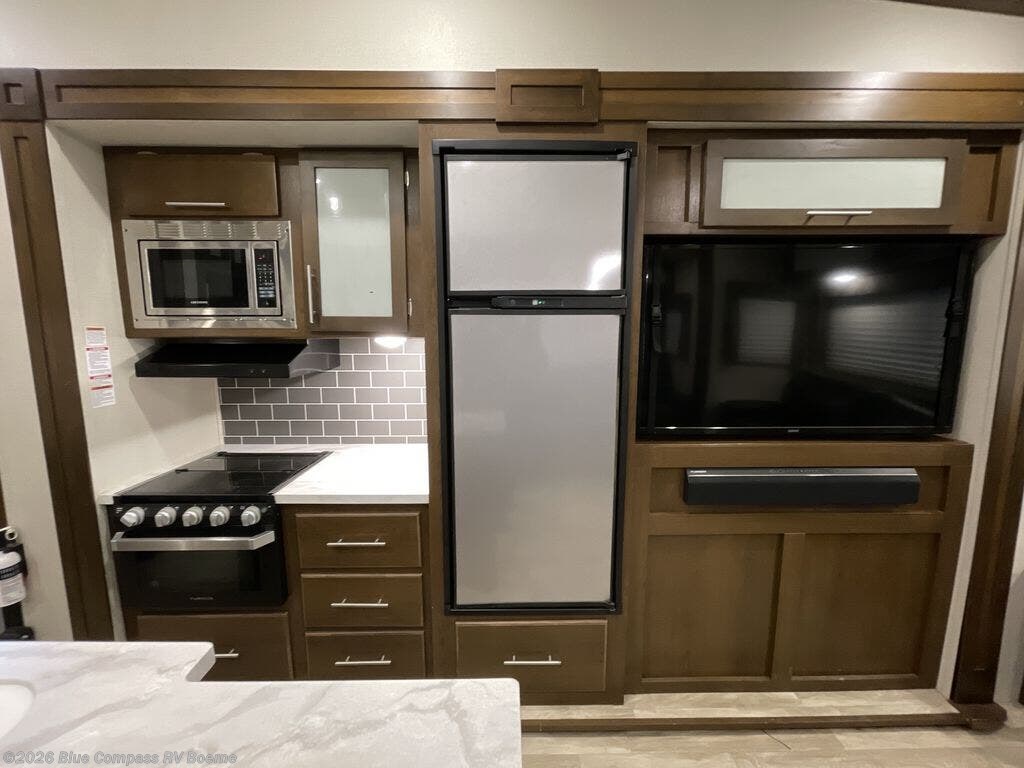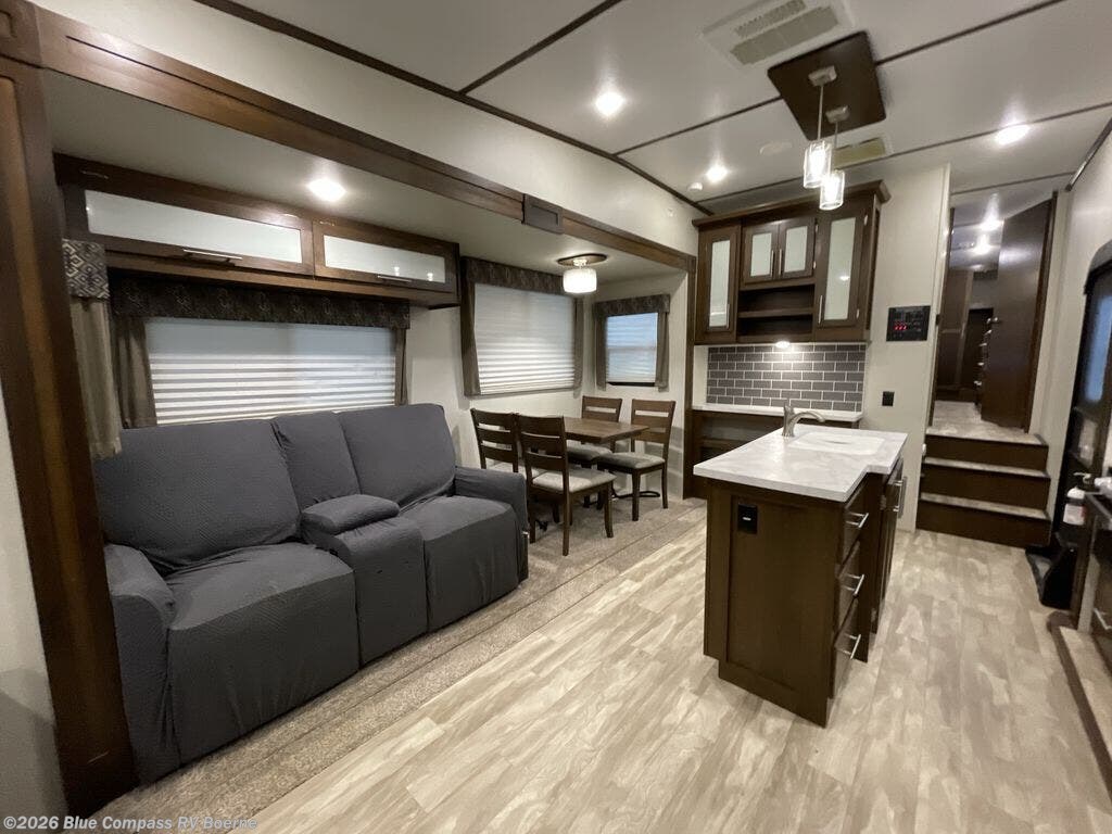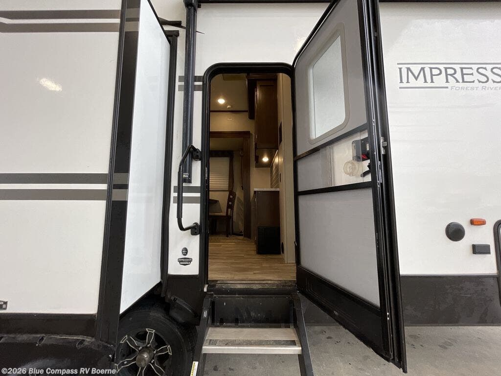 You will find modern styling and a wide open design in each Forest River Impression fifth wheel. The high-end luxury features inside include residential Shaker style Artisan cabinet doors, solid wood core cabinet frames, premium residential furniture, and a designer headboard for the king size bed in the front flush floor master suite to mention a few highlights. Rest assured the exterior provides years of enjoyment. From the Dexter axles with the industry-leading 5 year warranty, energy efficient gel coated fiberglass exterior, solar prep, and backup prep to the free 24/7 roadside assistance for one year after purchase and a free Owner's Group Membership with Forest River, you will love your new fifth wheel. It's time to make your first Impression a lasting impression on everyone that sees you!