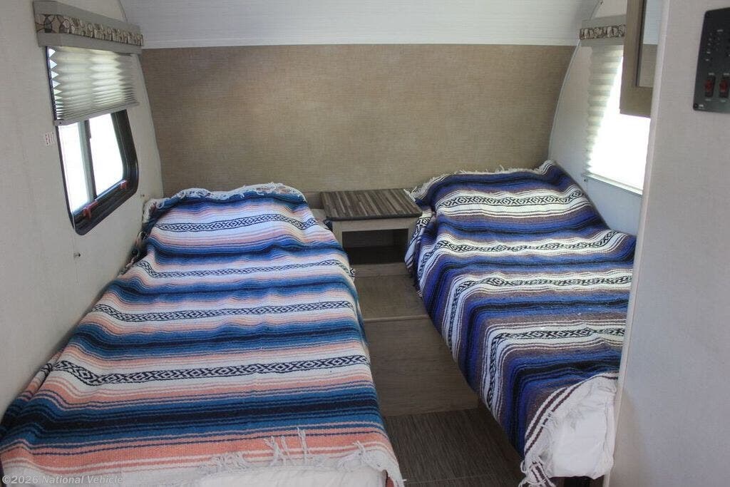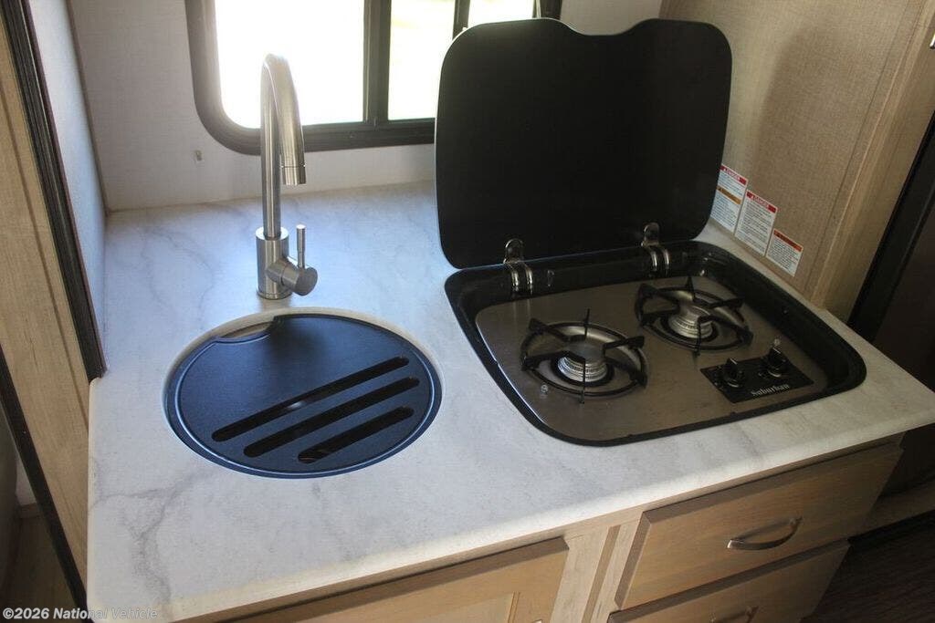 Step inside the well-designed interior with twin beds and U-shaped dinette that converts for extra sleeping. Comfort is assured with a 13,500 BTU rooftop A/C, 20,000 BTU propane furnace, and 6.5 ft interior height. The kitchen slide-out includes a 2-burner stove with glass cover, 3.7 cubic foot 3-way fridge/freezer, microwave and stainless sink. Wet bath with sink, shower head and cassette toilet. Enjoy entertainment from the flat-screen TV and Furrion sound system with AM/FM, HDMI and auxiliary jacks with indoor/outdoor speakers.