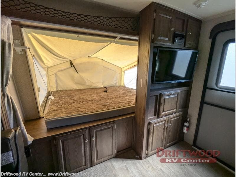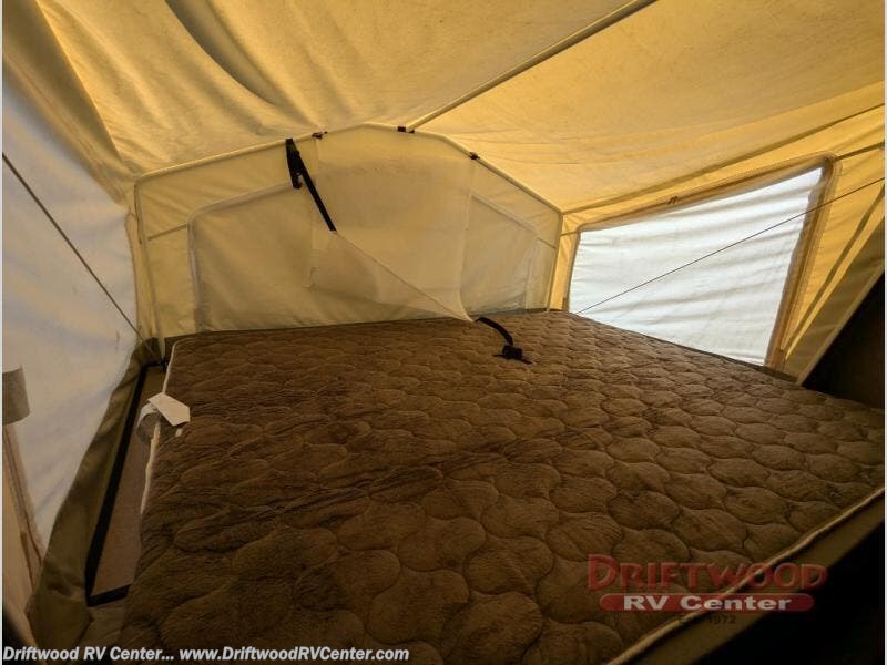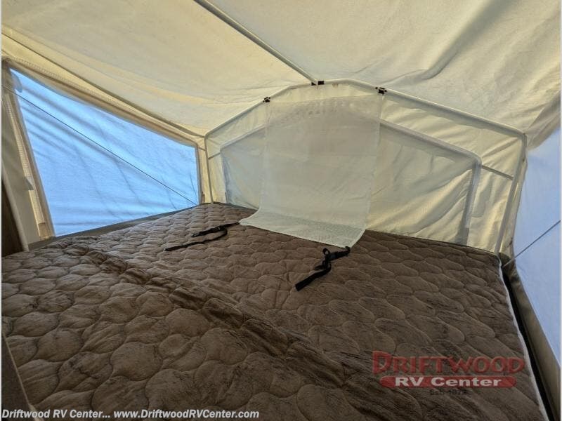 The single slide out on this expandable really opens up the interior for more walking around room along with the two tent end beds including an overhead shelf for storage and sleeping space for four. The dinette and sofa within the slide out offer a place to dine, relax, and even sleep when folded down. You will appreciate the rear full bath featuring a space saving radius glass shower door and linen storage. You are sure to enjoy the mounted 32" LCD TV, the multi zone stereo with DVD/CD/AM/FM and Bluetooth control, and the MP3 player hook-up on those rainy campouts. Outside you will find even more storage in the pass-through compartment for your outdoor gear, and a gas grill. You even have options to change up the furniture. Take a look!
