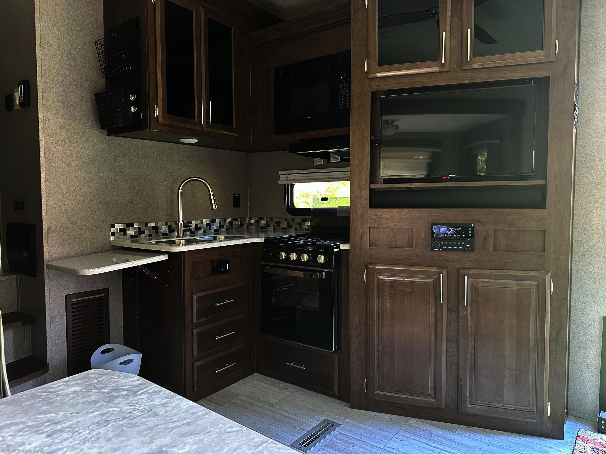 2019 Rockwood Ultra Lite fifth Wheel model 2441WS with 2 slide outs in excellent condition. The unit has a rear living area with 2 rocker recliner chairs, a dining nook, and an entertainment center with adjustable TV. The radio has both inside and outside speakers. The kitchen has 3 burner gas stove, microwave, full refrigerator-freezer and dual basin sink. The bedroom is in the front and has a queen bed, slide out closet and shelves. The water heater can be used on gas and electricity. The unit has AC, a heater, a power awning and an outside gas grill and plenty of storage space. Included is our large patio rug.