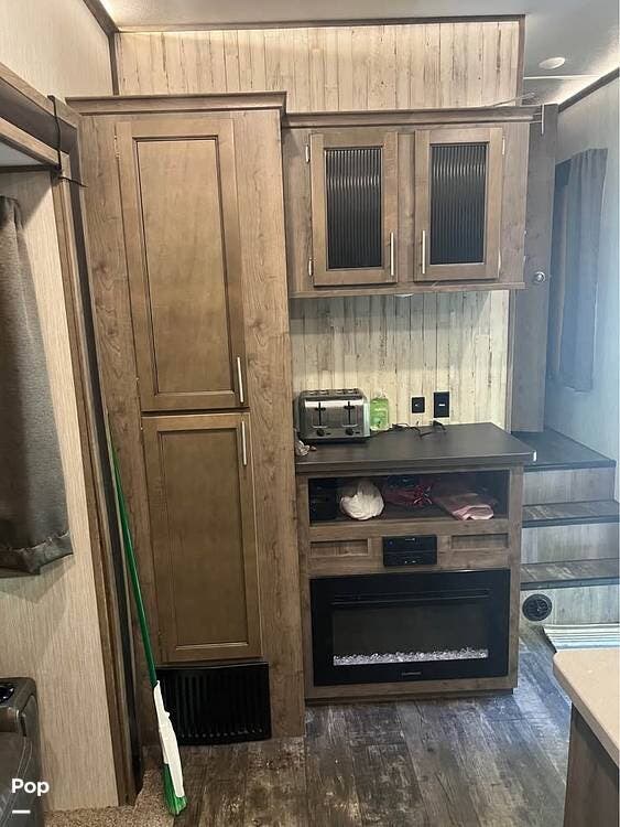 The main living space features a generous kitchen with plenty of storage, a full-size refrigerator/freezer, a stove/oven, and a microwave. There is a four-person dinette and comfortable leather seating with beverage holders, and as a bonus, it has a fireplace.