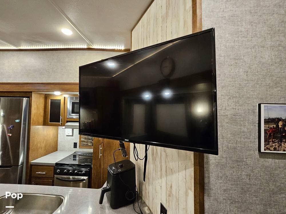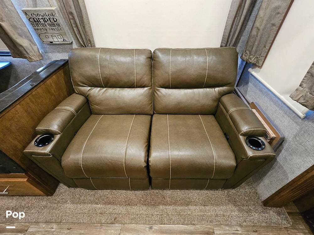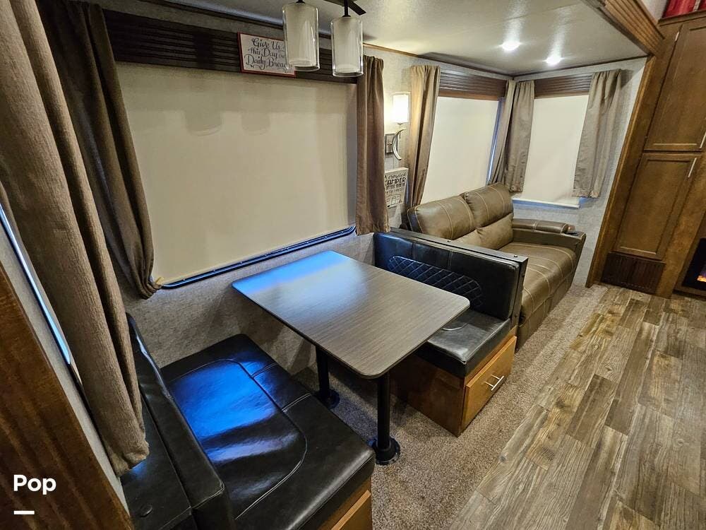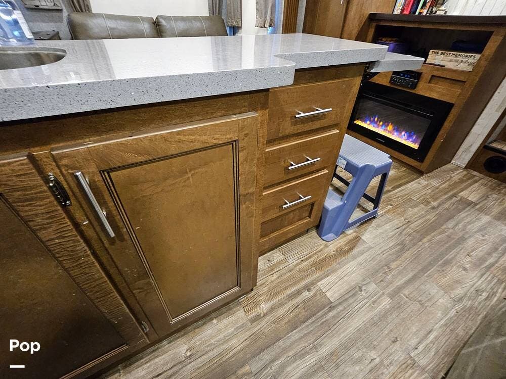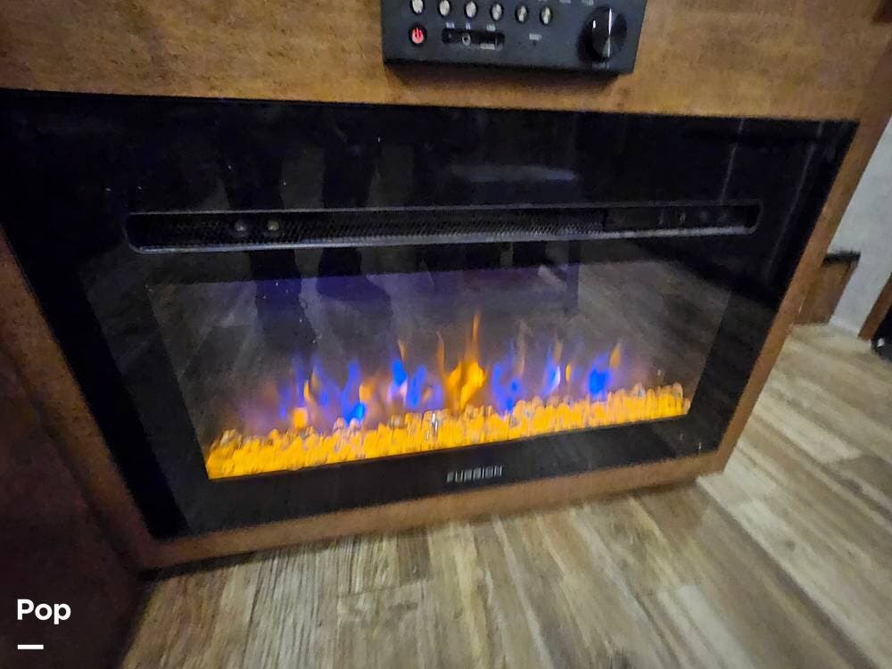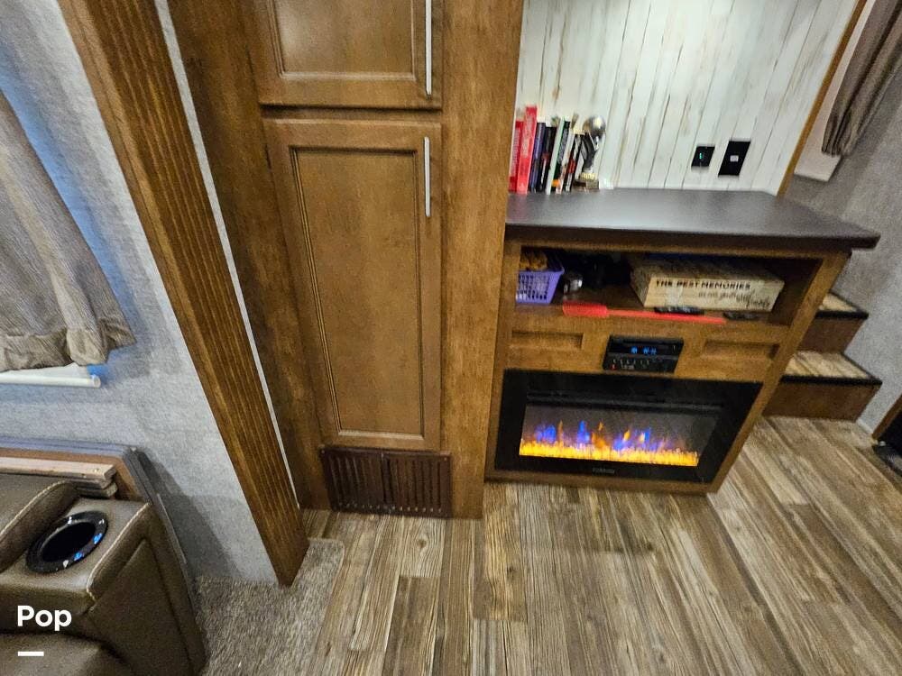 The main living space features a nice-size kitchen with plenty of storage, a full-size refrigerator/freezer, a stove/oven, and a microwave/convection. There is a four-person dinette, comfortable stadium-style seating with beverage holders, and an electric fireplace.