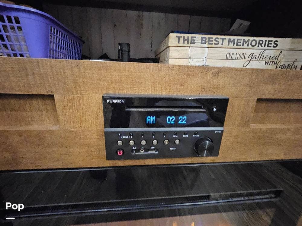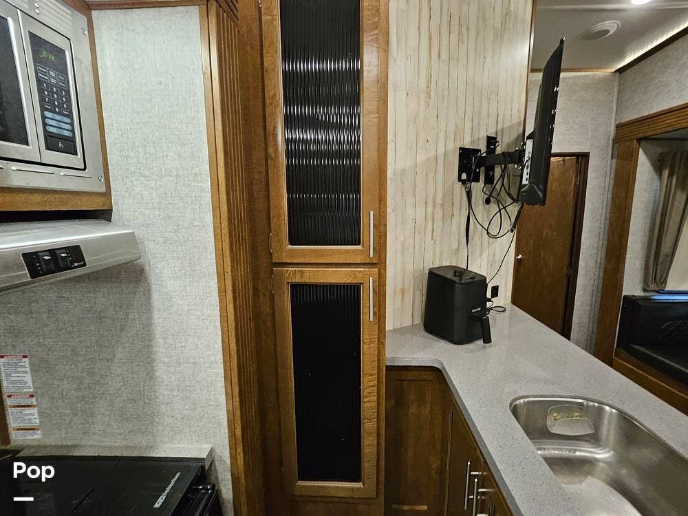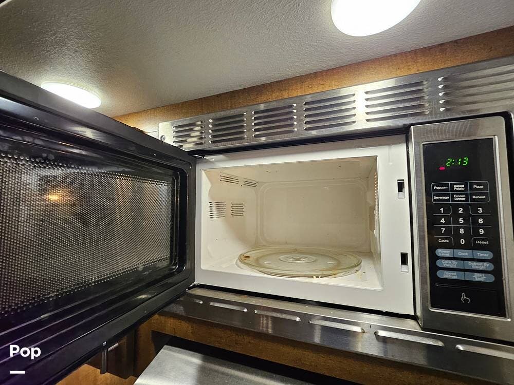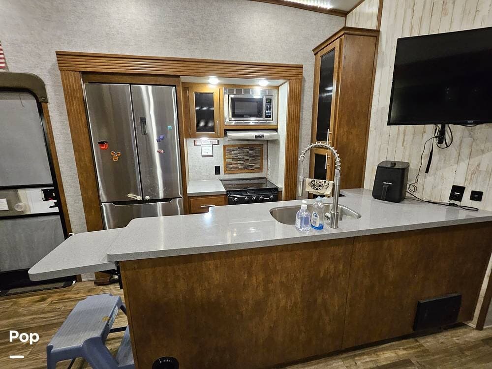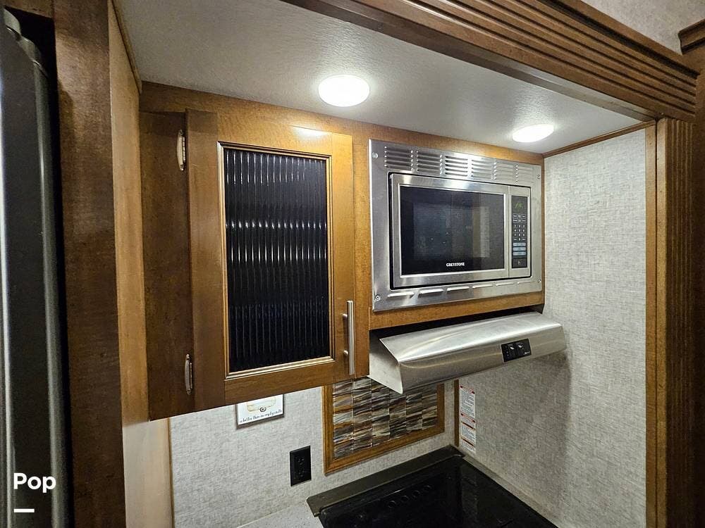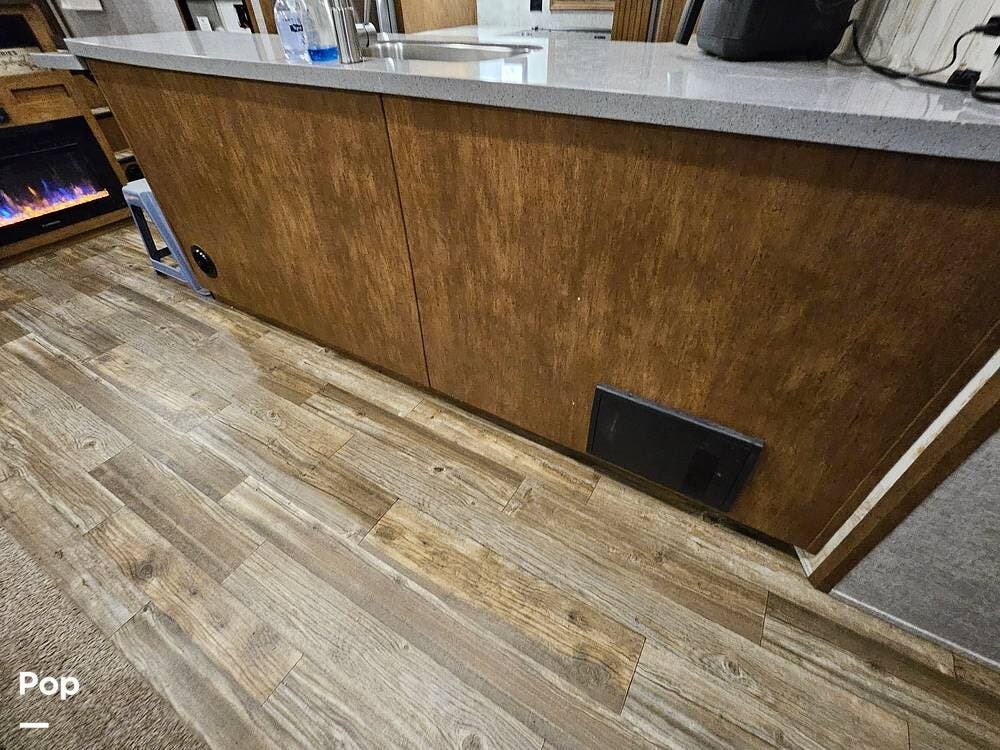 The main living space features a nice-size kitchen with plenty of storage, a full-size refrigerator/freezer, a stove/oven, and a microwave/convection. There is a four-person dinette, comfortable stadium-style seating with beverage holders, and an electric fireplace.