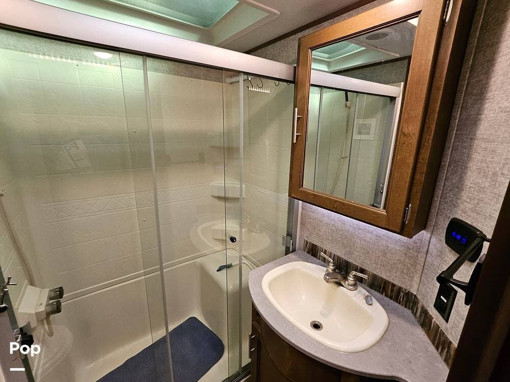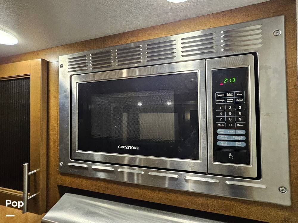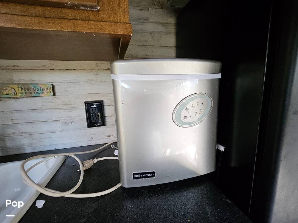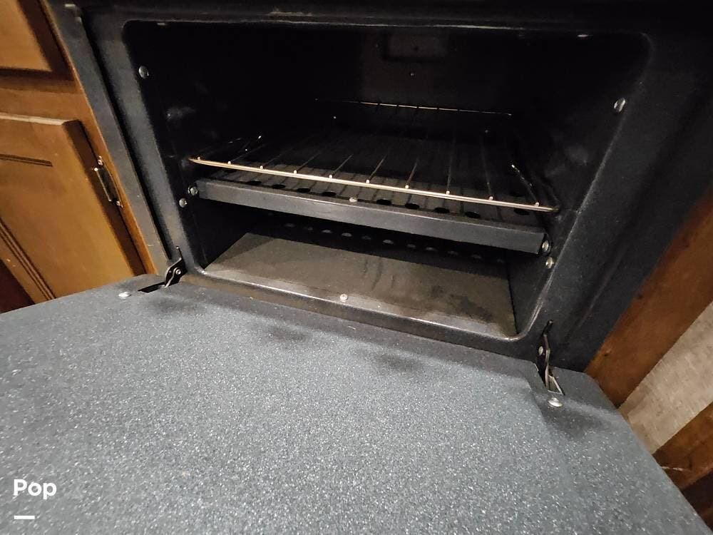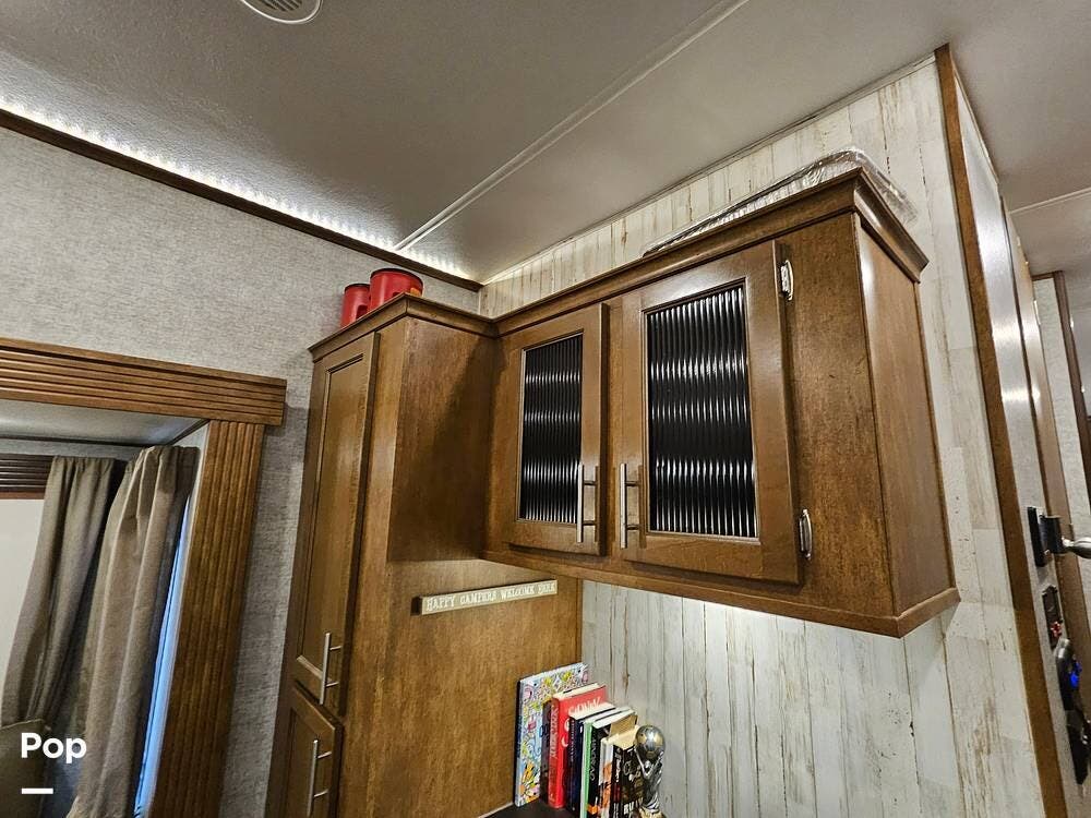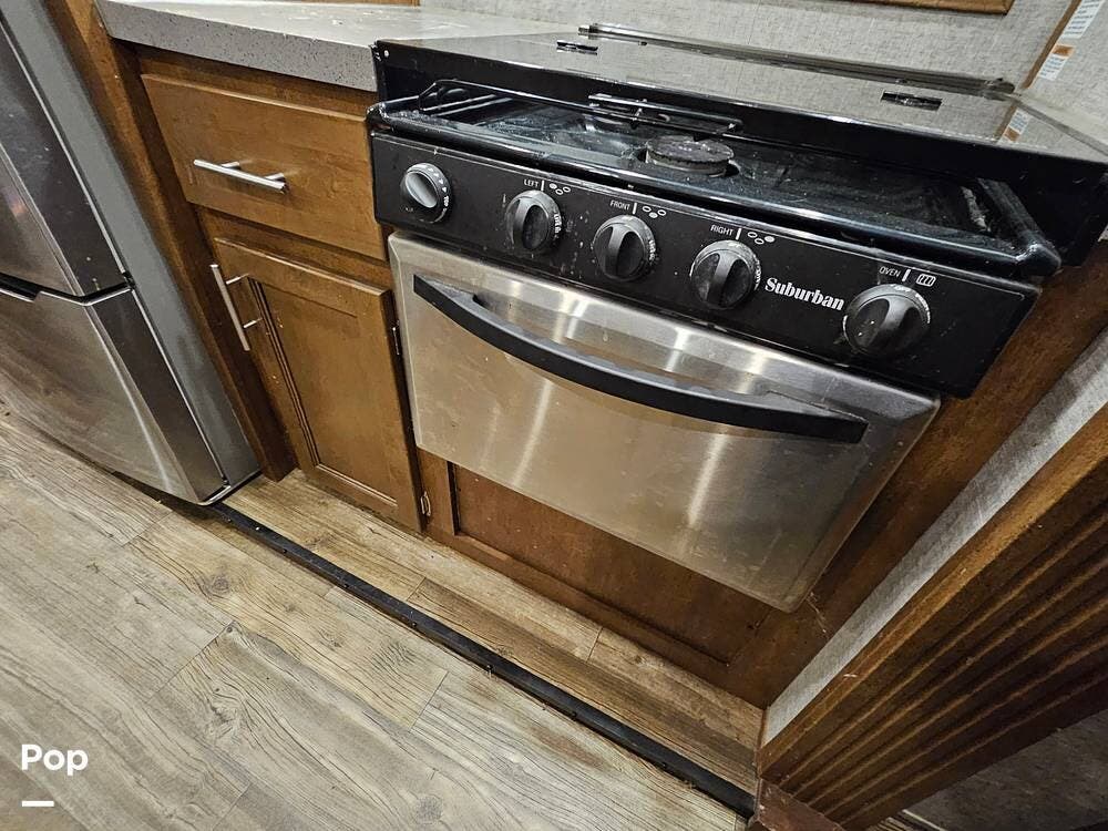 The main living space features a nice-size kitchen with plenty of storage, a full-size refrigerator/freezer, a stove/oven, and a microwave/convection. There is a four-person dinette, comfortable stadium-style seating with beverage holders, and an electric fireplace.