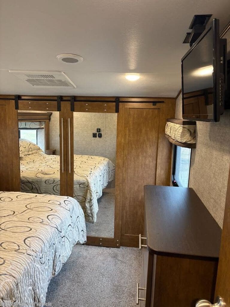 Up front, the private master bedroom offers a queen walk-around bed with storage underneath, plenty of closet space, and its own TV.