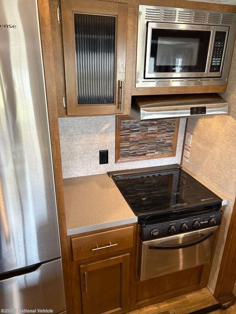 The kitchen is designed for real cooking and entertaining. You'll find Corian countertops, a large kitchen island, residential appliances, stove, oven, microwave, and a residential refrigerator/freezer. Storage is abundant, making extended trips easy and comfortable.