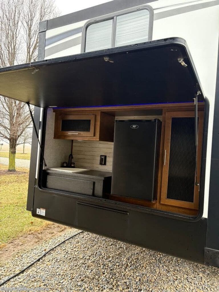 Outside, you'll enjoy an outdoor kitchen complete with a mini fridge, camp stove, sink, and propane hookup, making outdoor meals simple and fun. The power awning with LED lighting creates a comfortable outdoor living area for evenings at the campsite.
