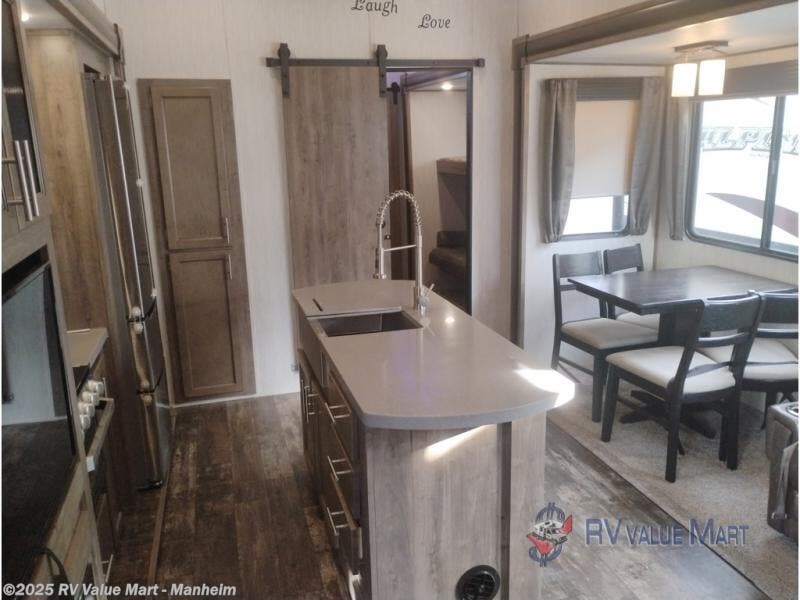 Looking for the ultimate fifth wheel for your whole family to enjoy their own space when inside? This Sabre not only offers two full bathrooms, dual entry into the unit, and a private front bedroom, you will also find a private bunkhouse for the kids or overnight guests, and a loft area which sleeps two campers. You are sure to love the home theatre seats with cupholders and free standing dinette while watching the large residential size LED TV with a remote controlled fireplace below. The cook can make meals inside with full kitchen amenities including an island and residential refrigerator or prepare a meal outdoors on the outside kitchen on the counter with a refrigerator, storage and a sink. This is the one!
