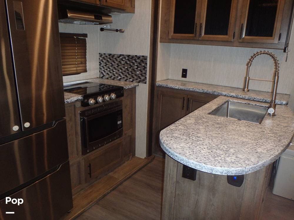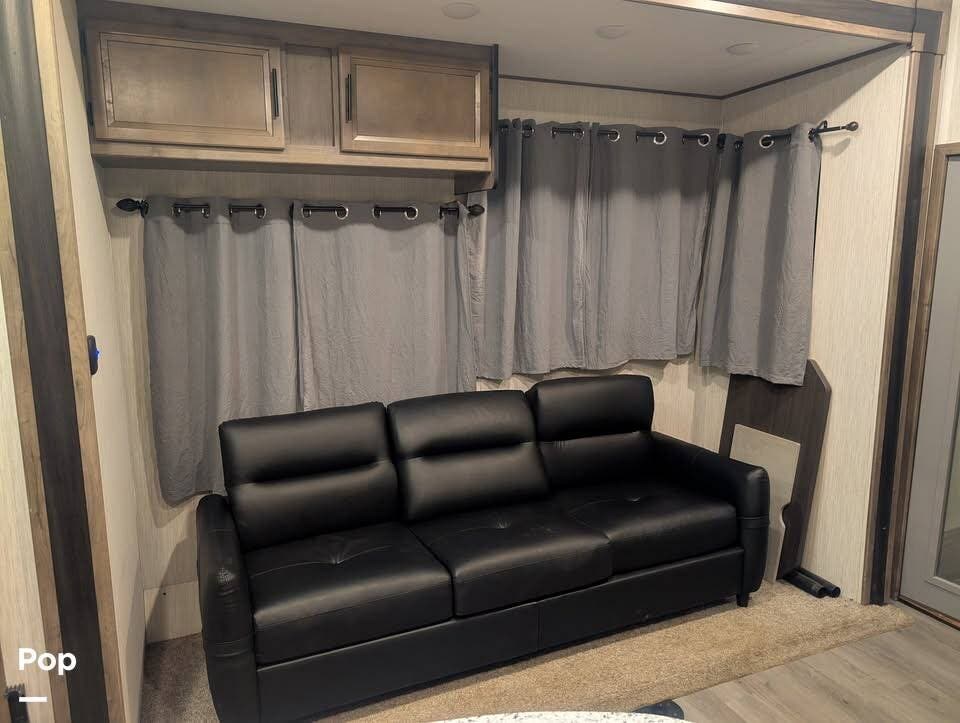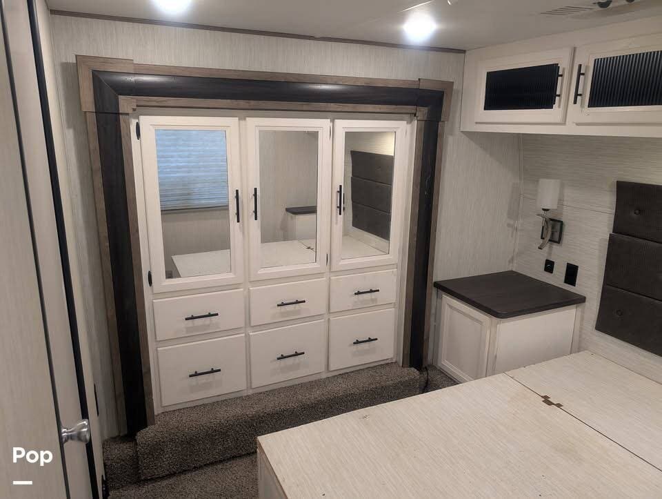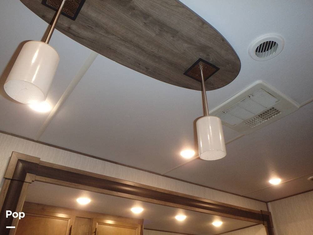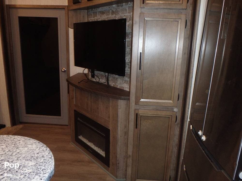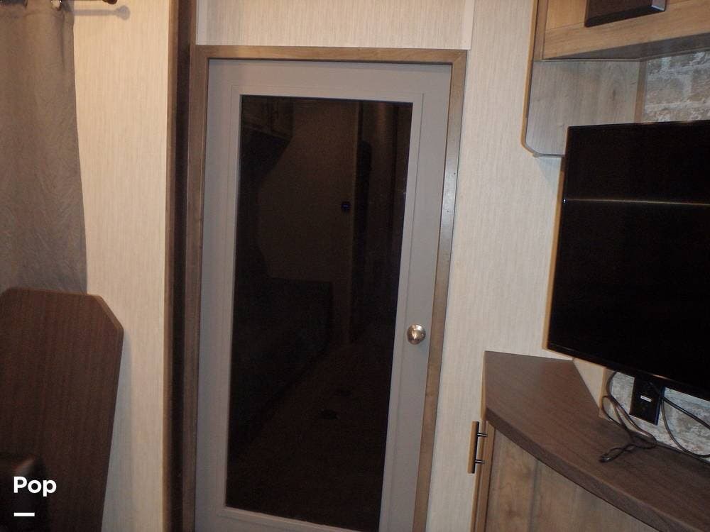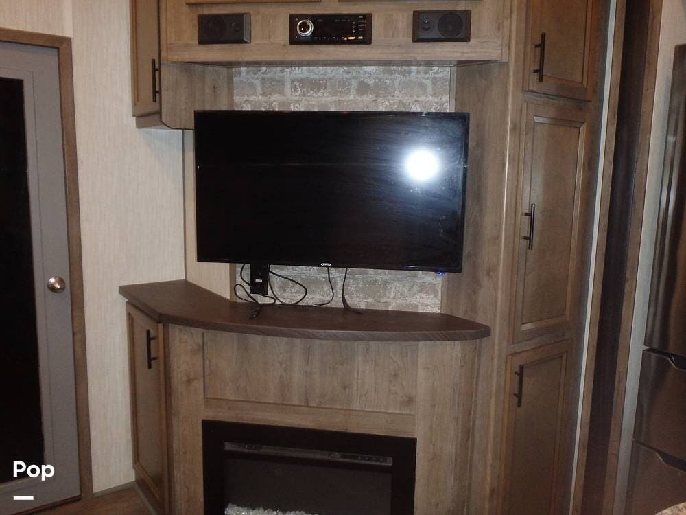 Inside, you'll find three slide-outs, which help expand the living area, kitchen, and possibly bedroom sections. The living space is centered, with vinyl flooring in the common areas, plenty of seating, and a large 40" flat screen TV and entertainment center.