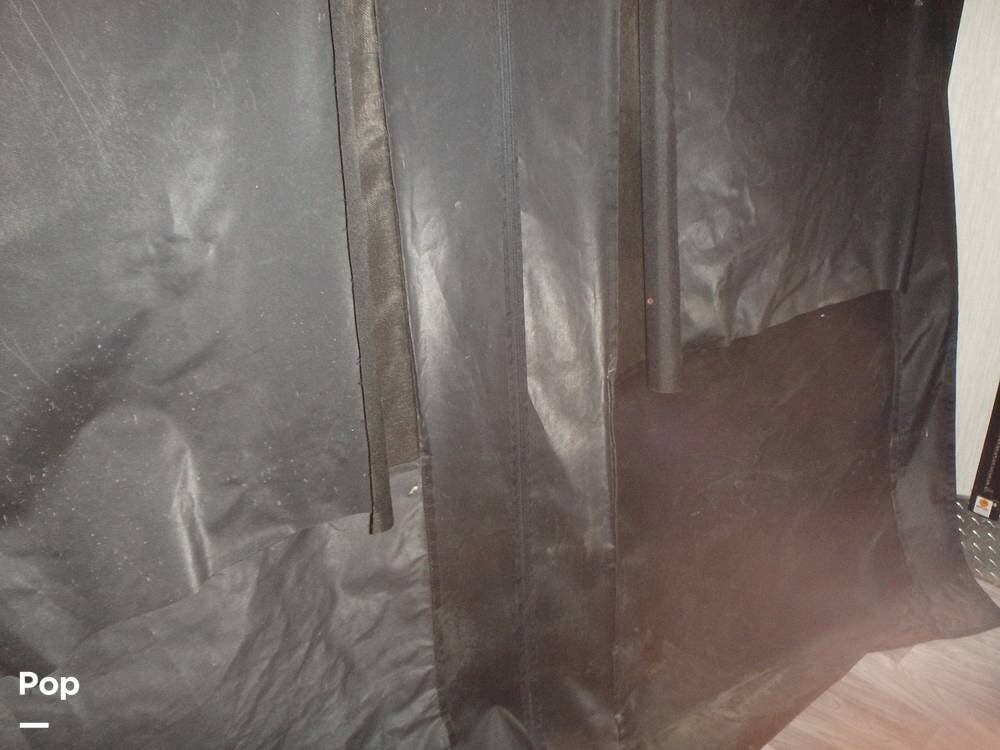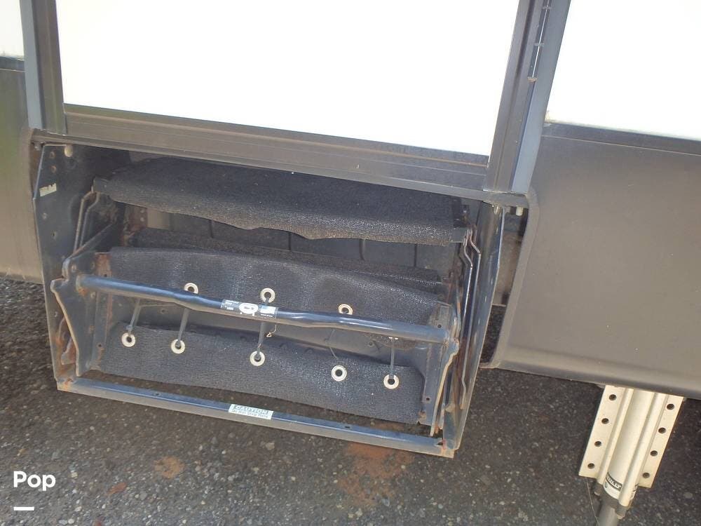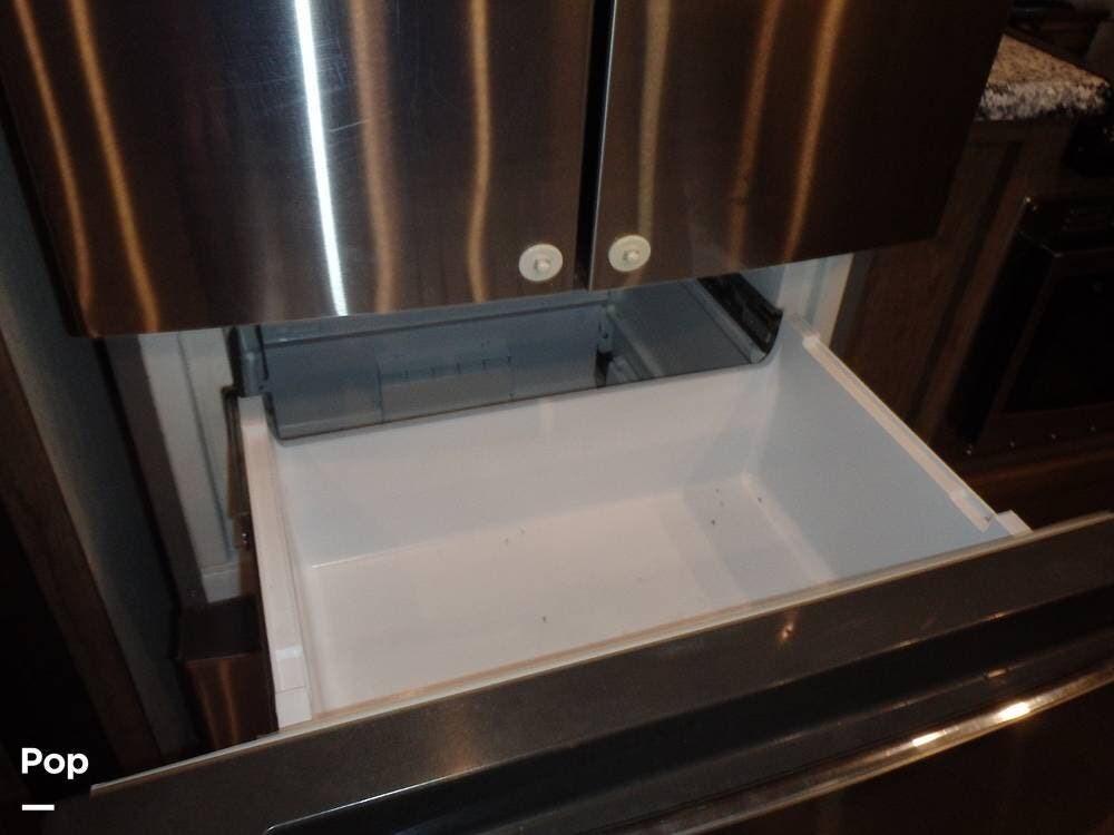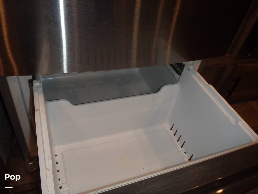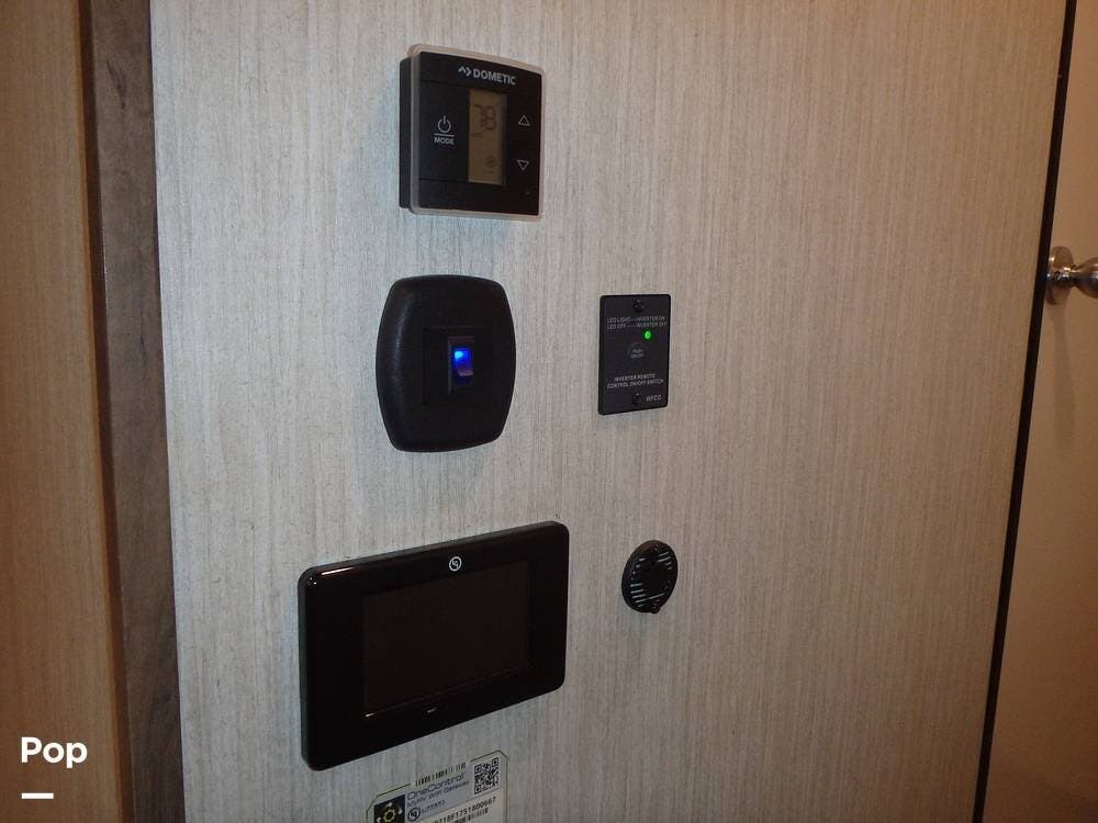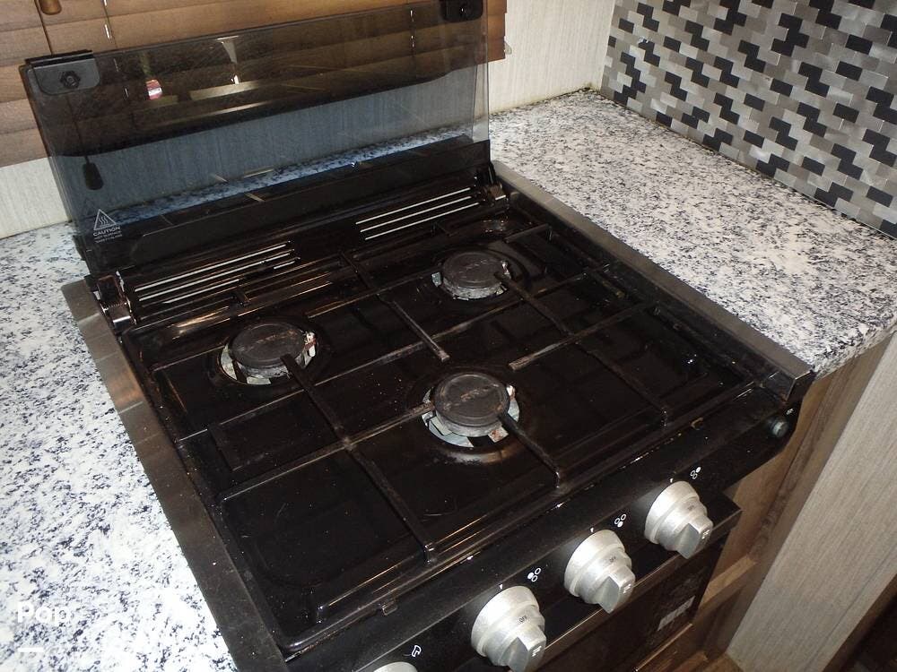 Inside, you'll find three slide-outs, which help expand the living area, kitchen, and possibly bedroom sections. The living space is centered, with vinyl flooring in the common areas, plenty of seating, and a large 40" flat screen TV and entertainment center.