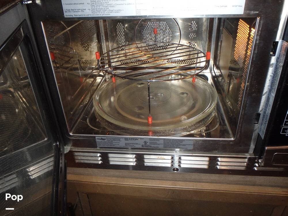 The kitchen has a full-size fridge, a three-burner stove, a microwave/convection combo, "residential" touches, and plenty of counter space.