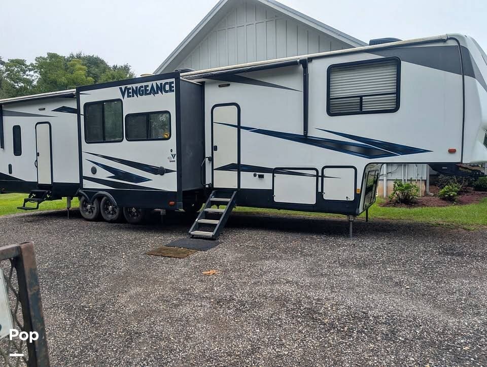 The 2019 Forest River Vengeance 388V16 is a large toy-hauler style fifth wheel built for both serious hauling and comfortable living. It stretches almost 44' in length, has triple axles, and weighs (dry) around 13,300-plus pounds, with a GVWR of roughly 18,000 pounds, so you'll need a heavy-duty tow rig.