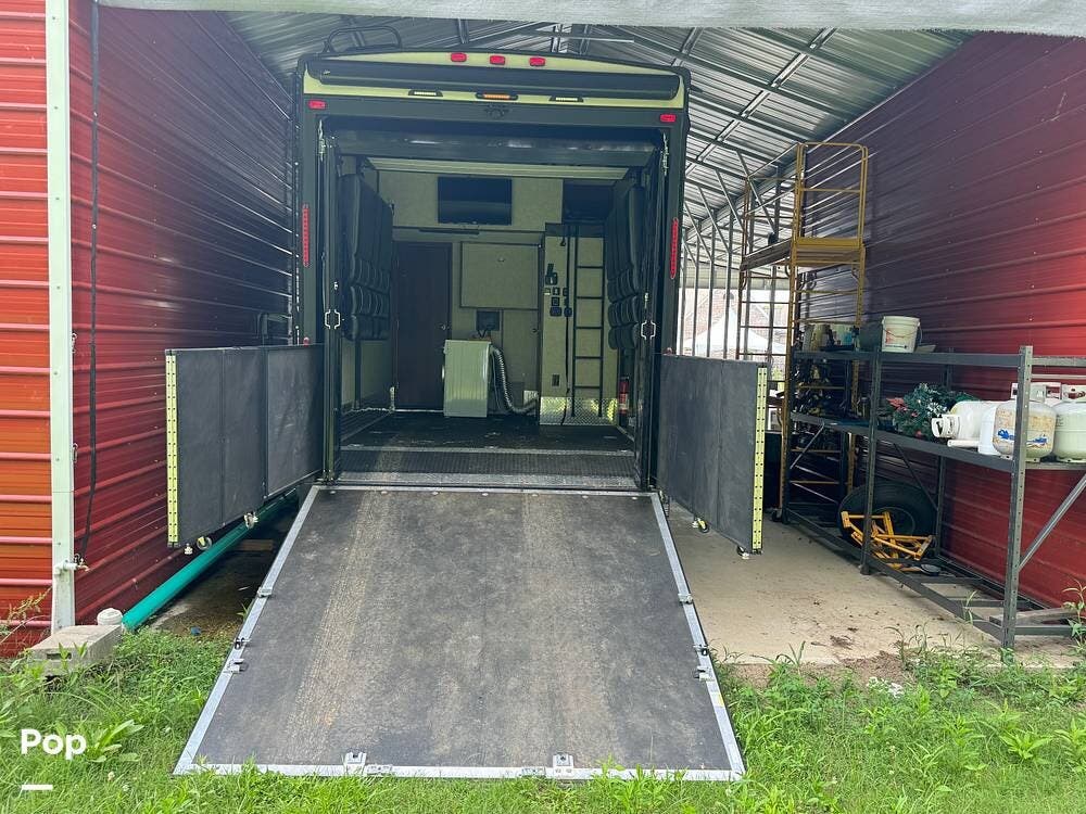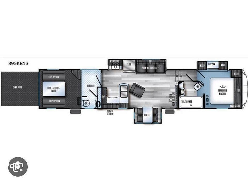 The Vengeance has a spacious garage to accommodate all your outdoor gear, from ATVs to motorcycles and everything in between. With a ramp door for easy loading and unloading, you can bring along all your toys. The garage is also an excellent place for entertaining on a patio with a foldable fence boundary. On each side of the garage are cushioned seats that fold flat to make a queen-sized bed. There is also a loft bed that is accessed by a ladder. There is a half bathroom with a sink and toilet for cleaning up after a day outdoors. Other amenities are a dedicated air conditioner, a stereo with speakers, a TV, and a combo washer and dryer.