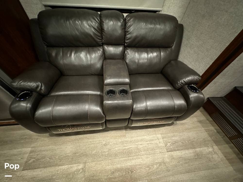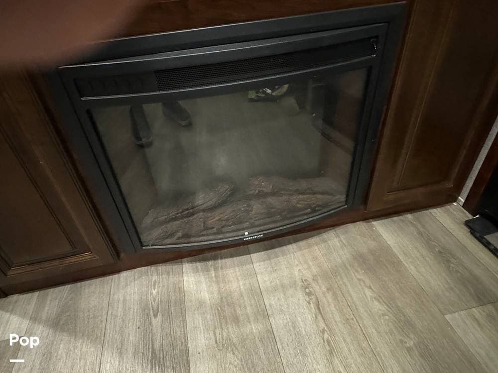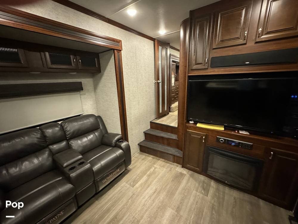 The main living area provides all of the comforts of home. The interior features residential-style furnishings, including plush recliners, a deluxe entertainment center, and a fireplace.
