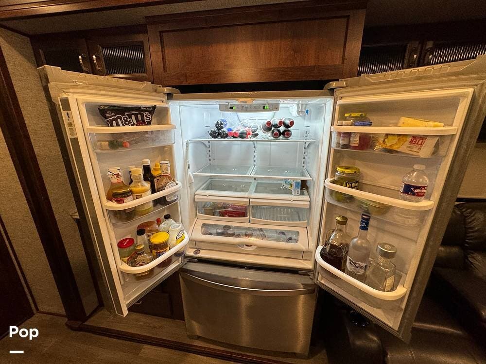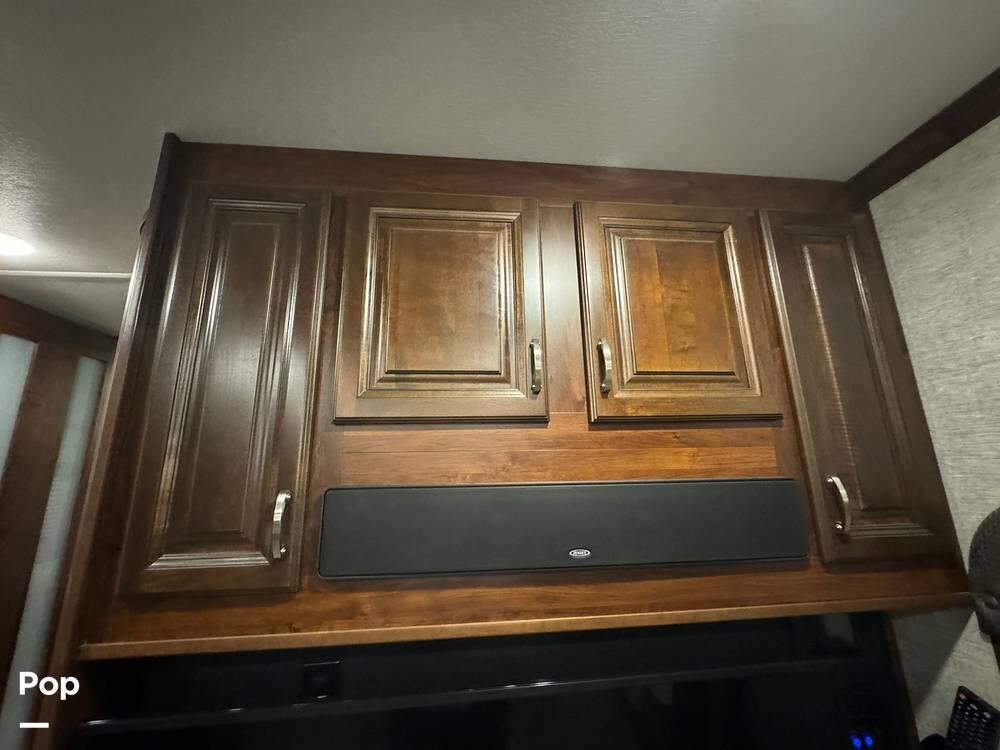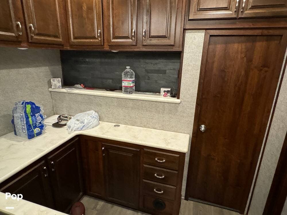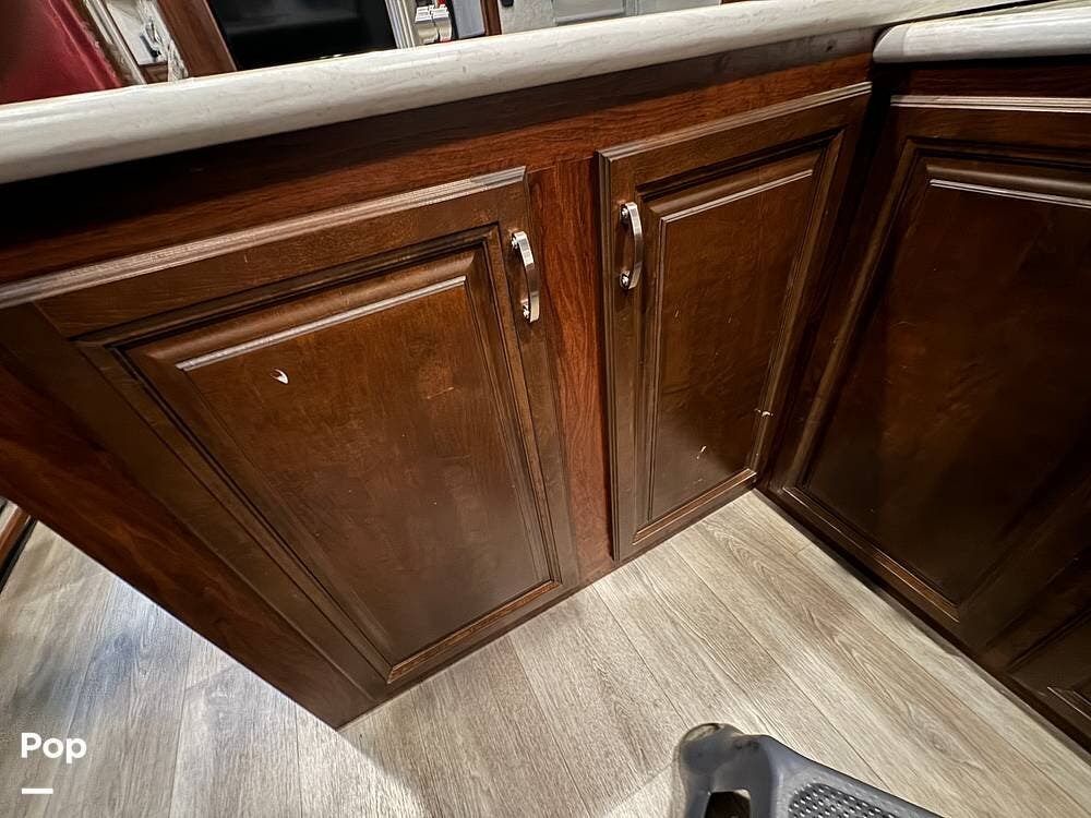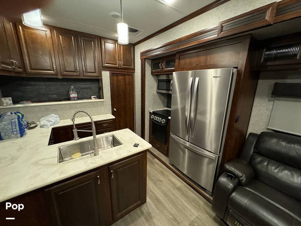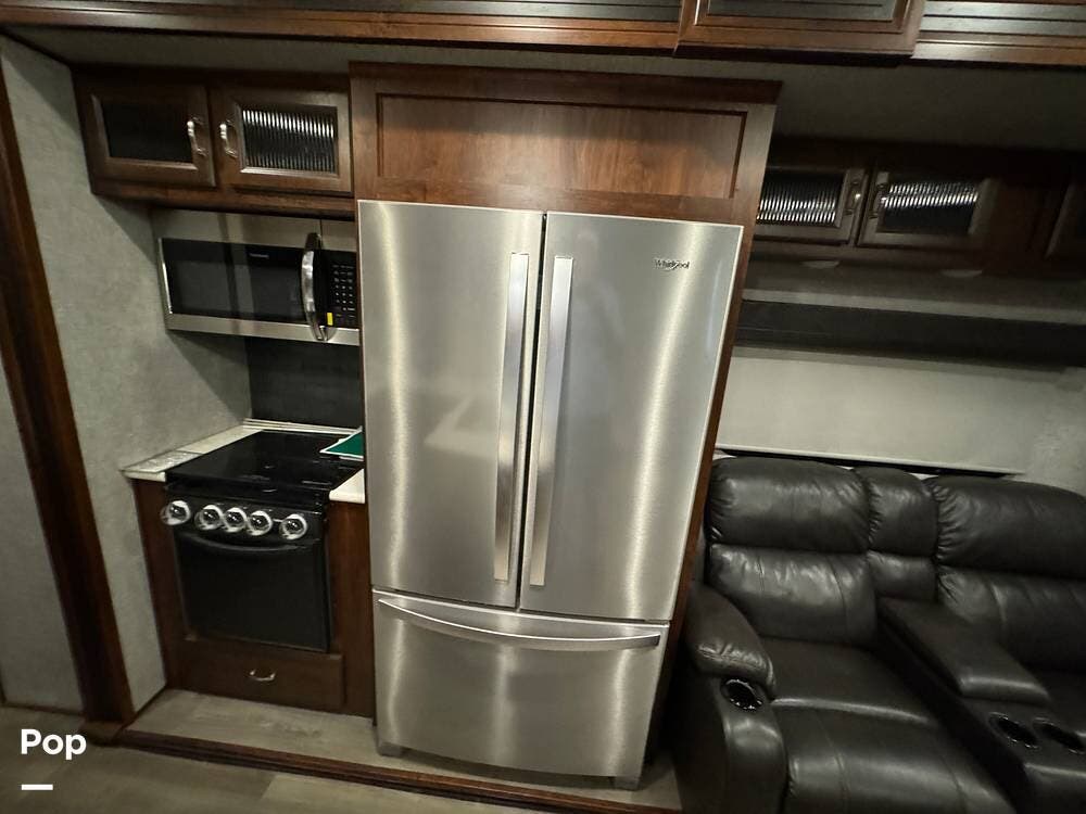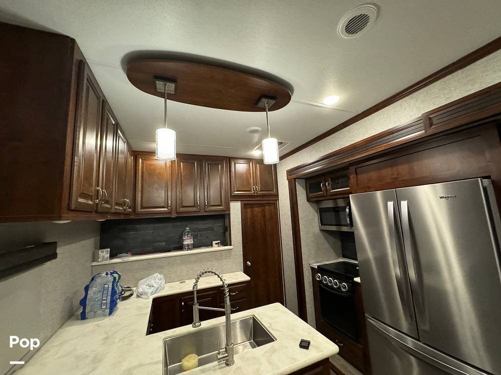 Prepare meals on the road with the fully equipped kitchen, complete with stainless steel appliances, ample counter space provided by a large U-shaped counter, and a large pantry for all your essentials. There is as much kitchen cabinetry as you'd find in a residence.
