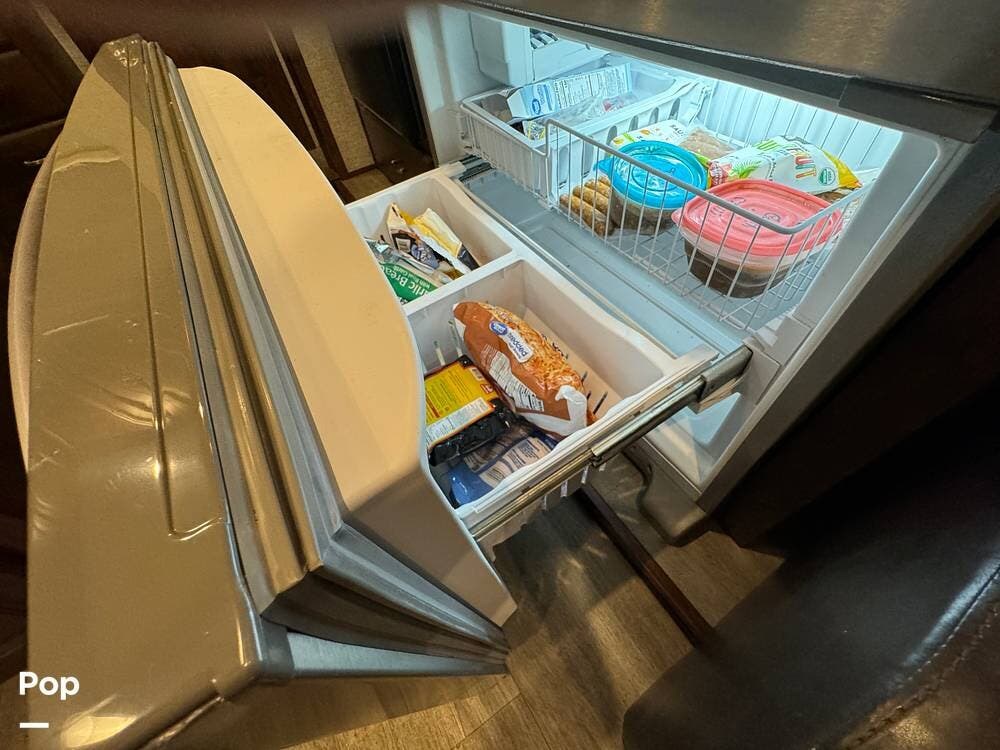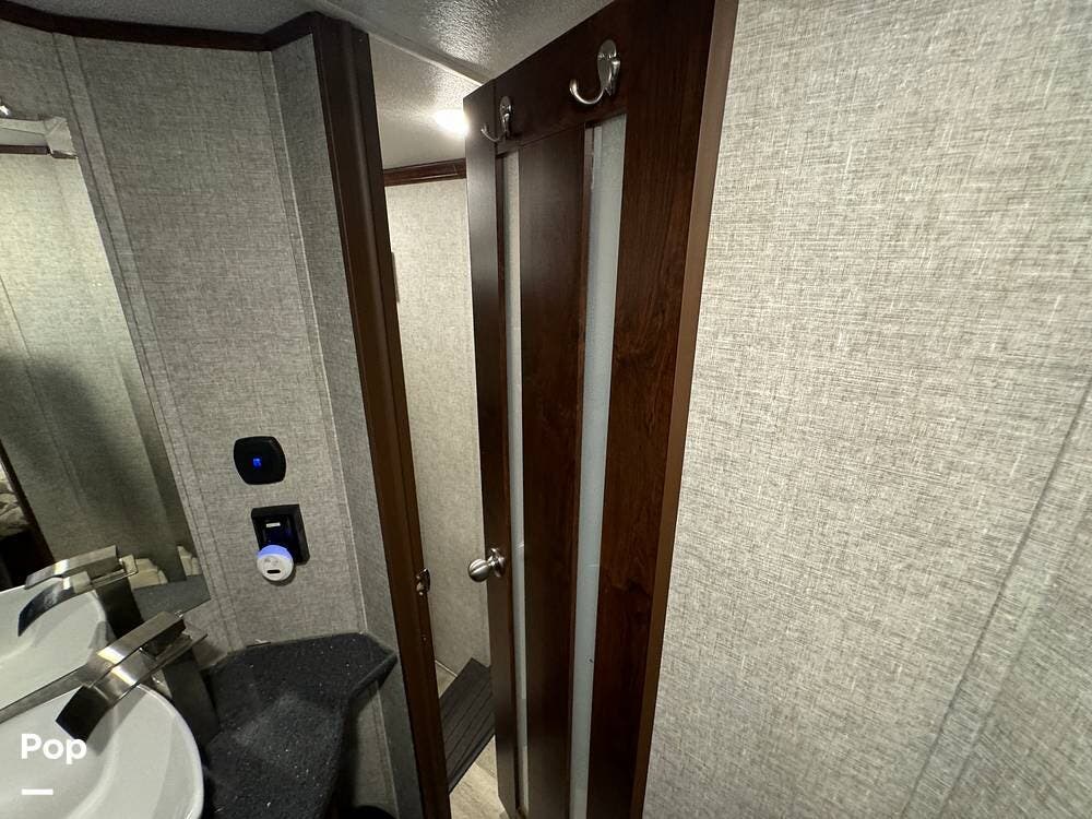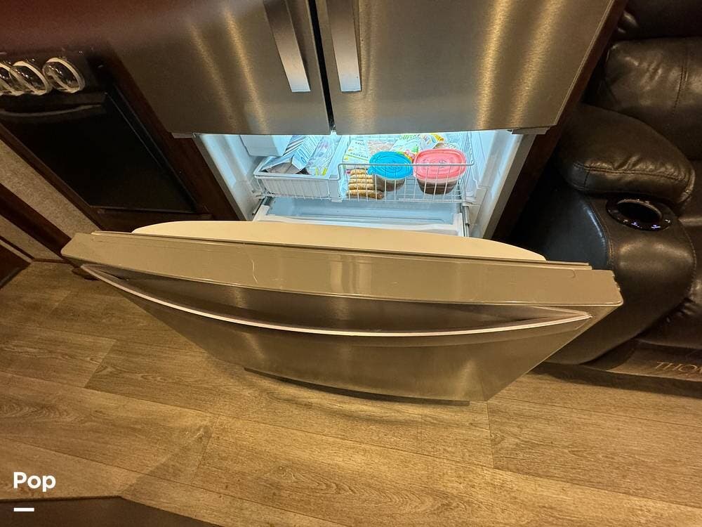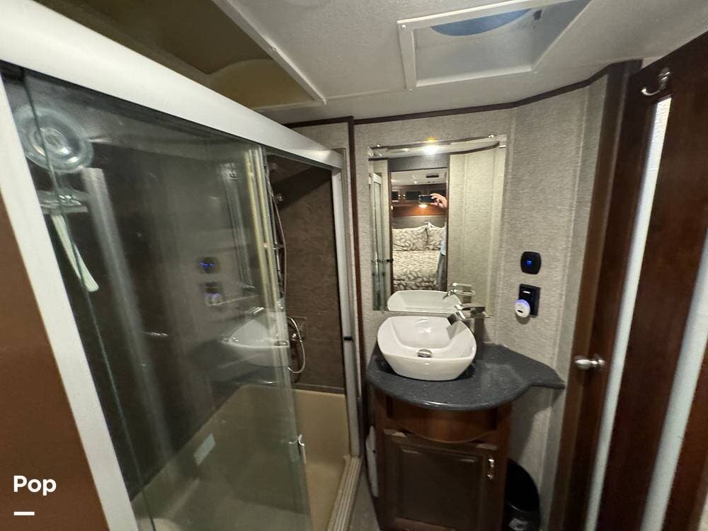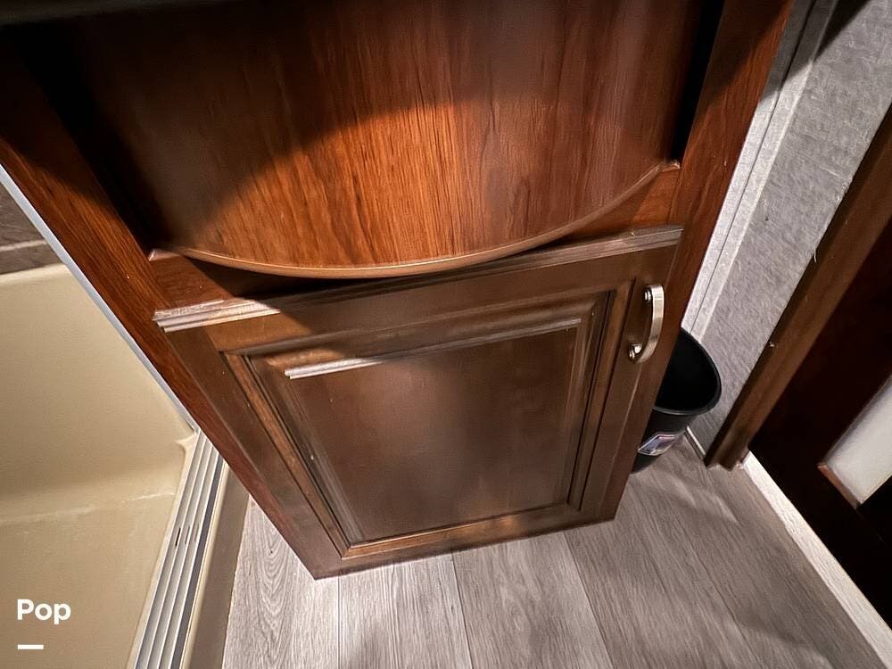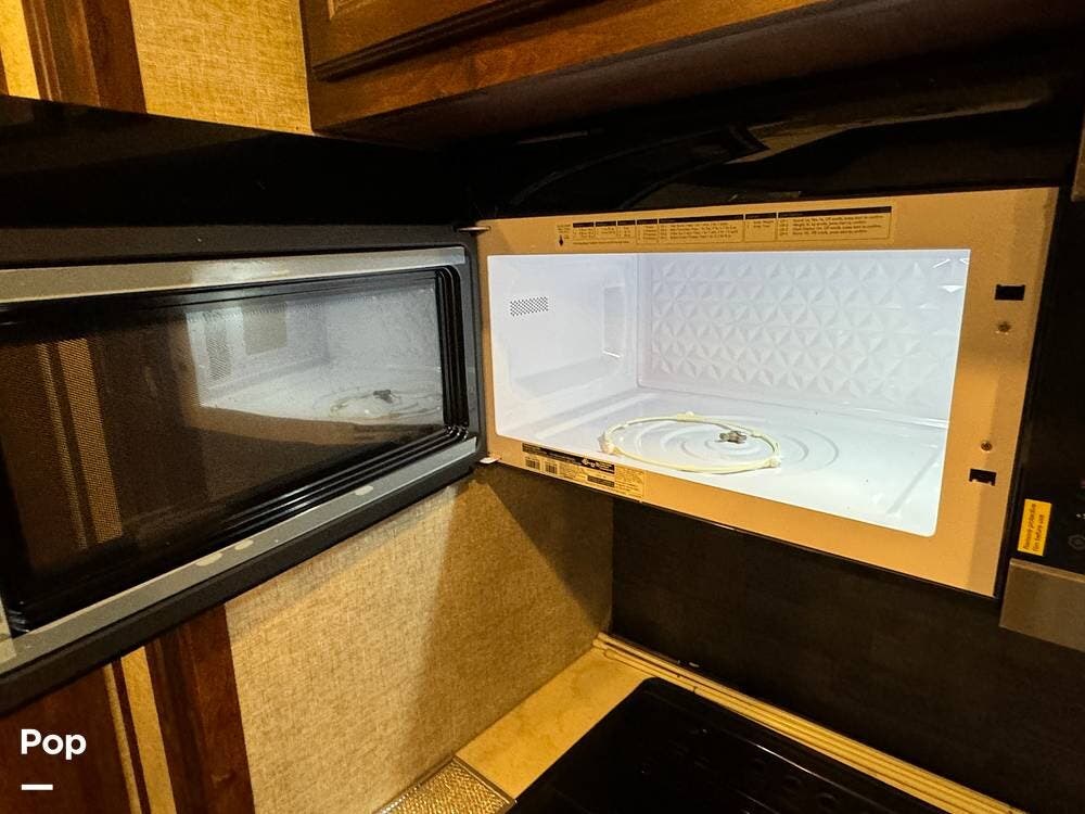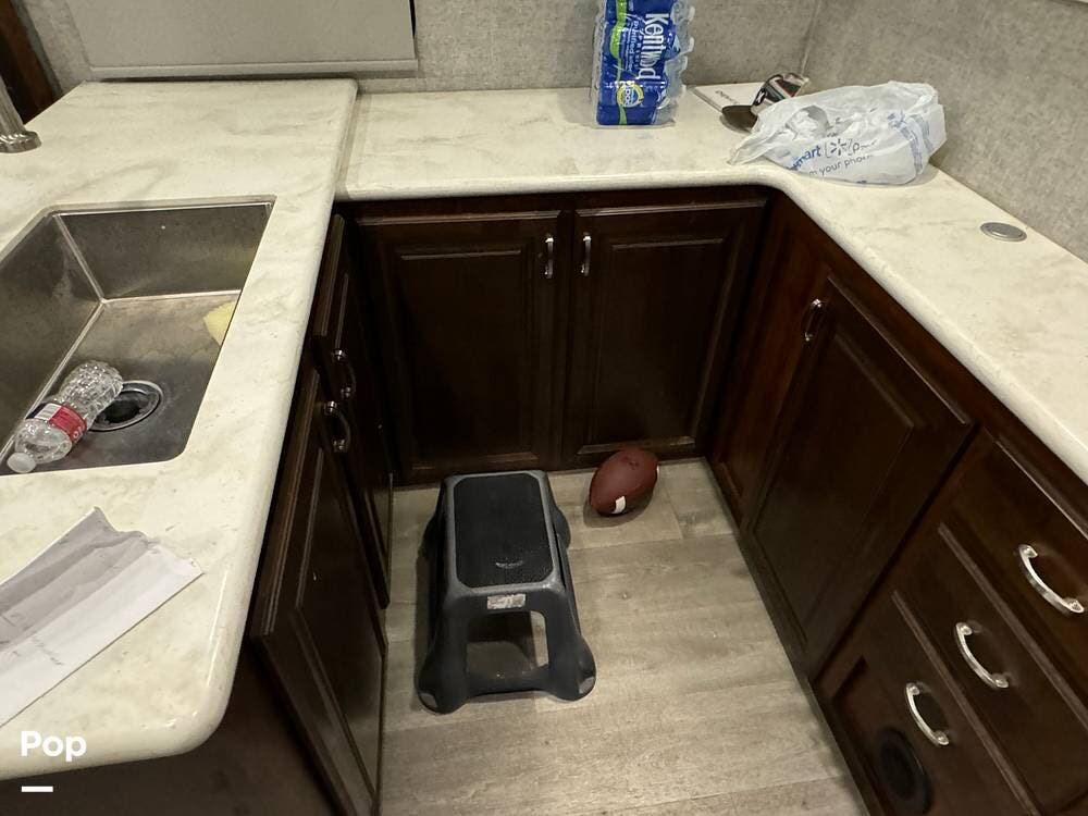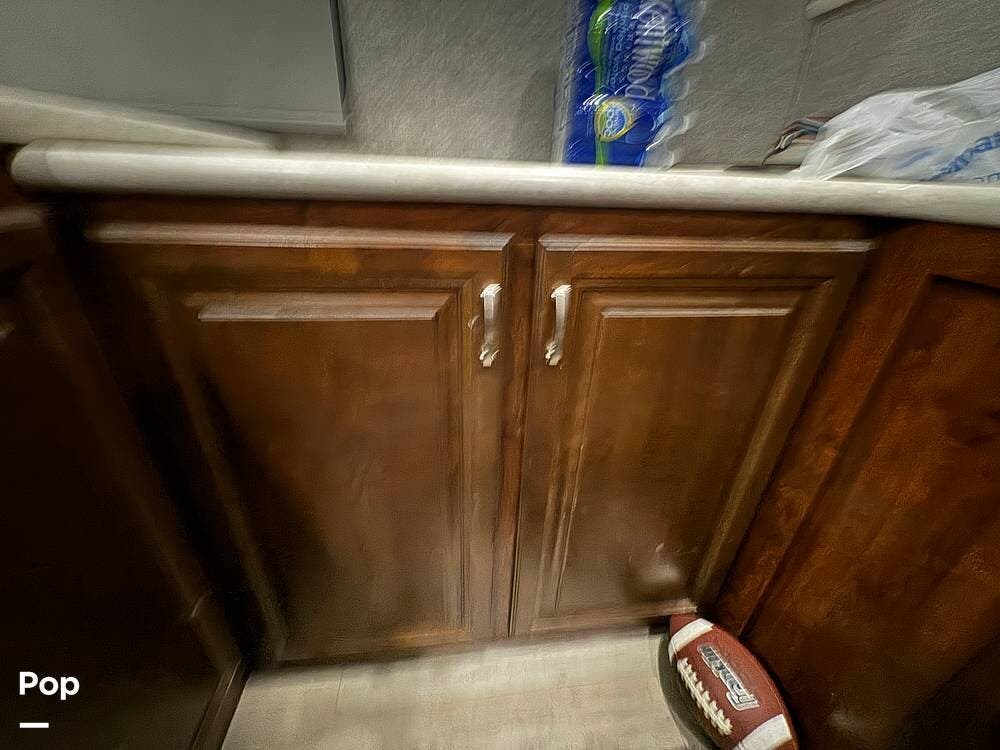 Prepare meals on the road with the fully equipped kitchen, complete with stainless steel appliances, ample counter space provided by a large U-shaped counter, and a large pantry for all your essentials. There is as much kitchen cabinetry as you'd find in a residence.