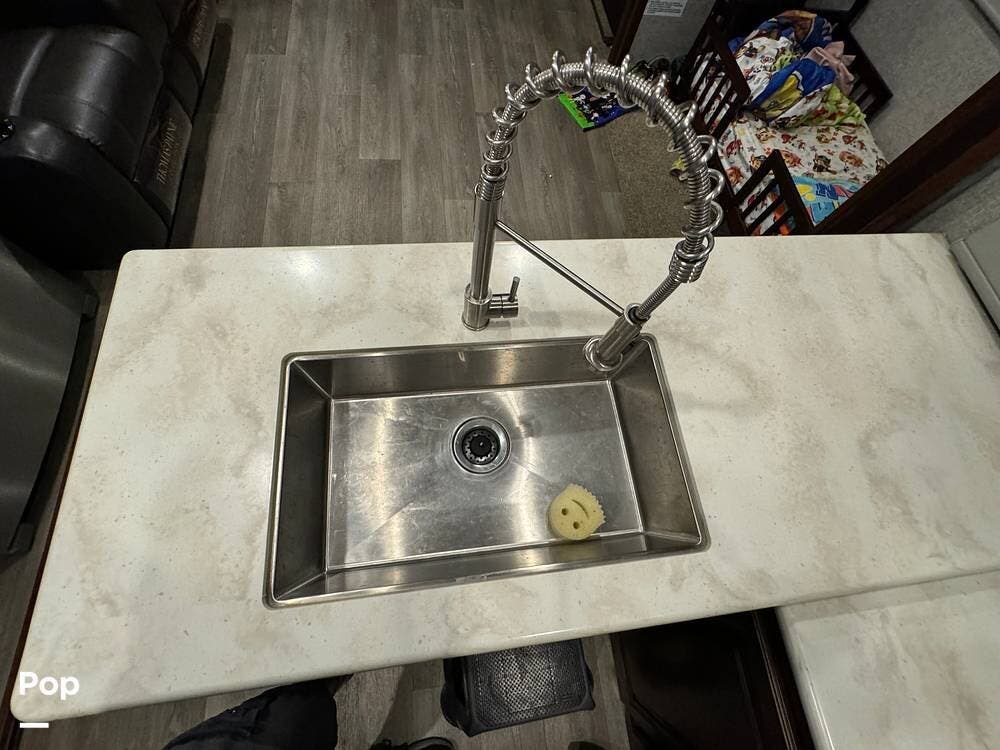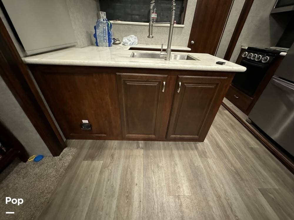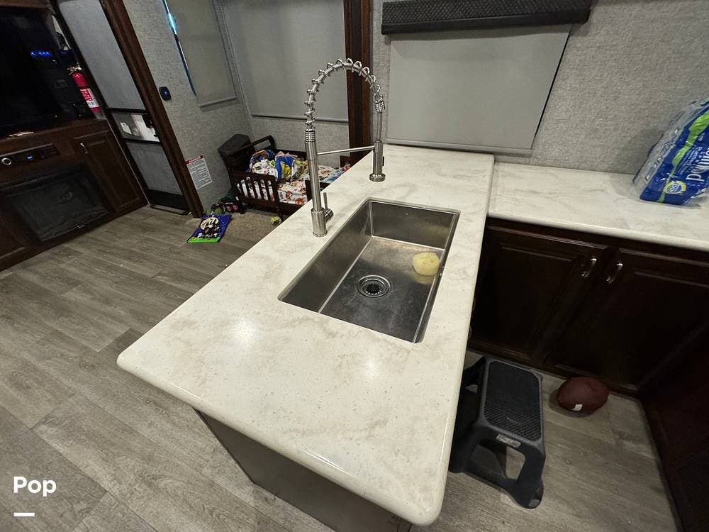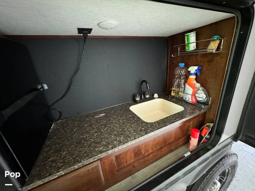 Outside the RV, there are lots of extras. In addition to the more than adequate storage space, there is an outdoor kitchen with a prep counter, sink, and mini refrigerator.