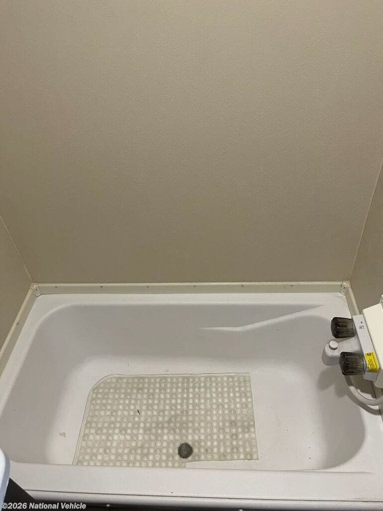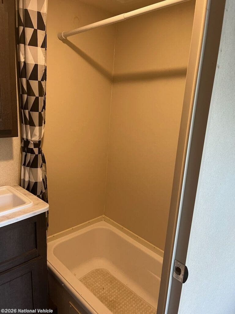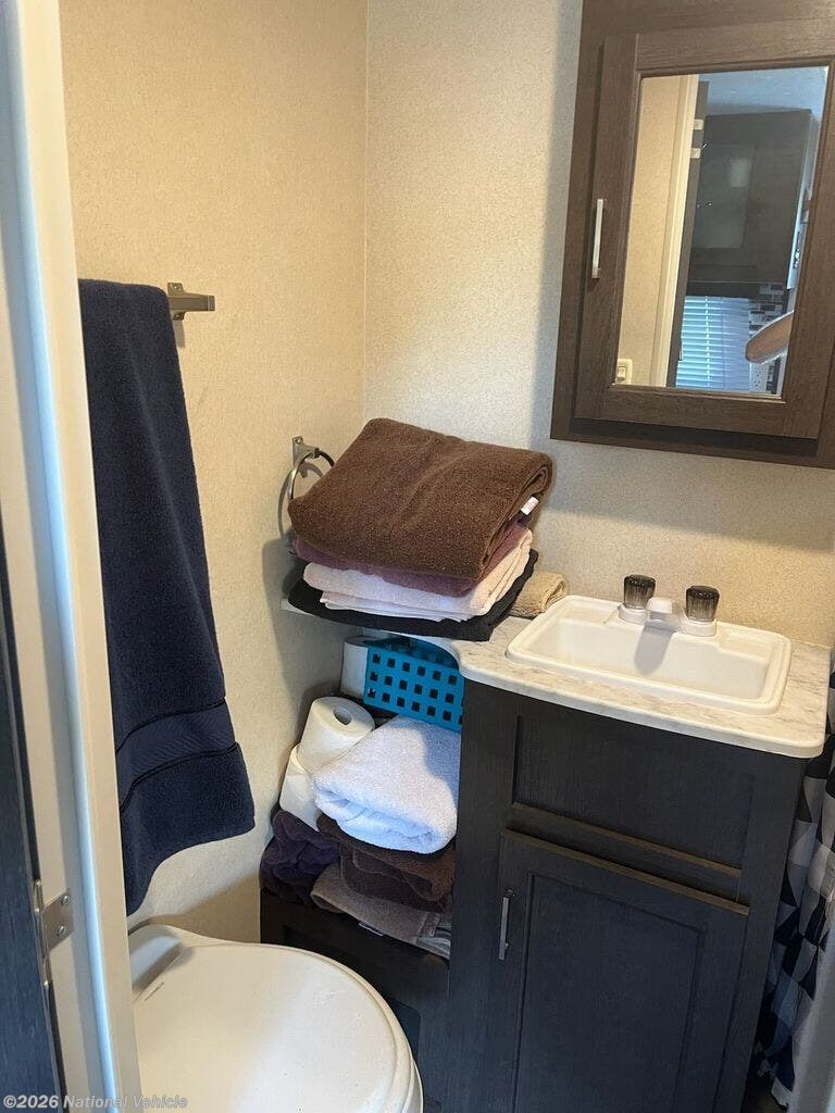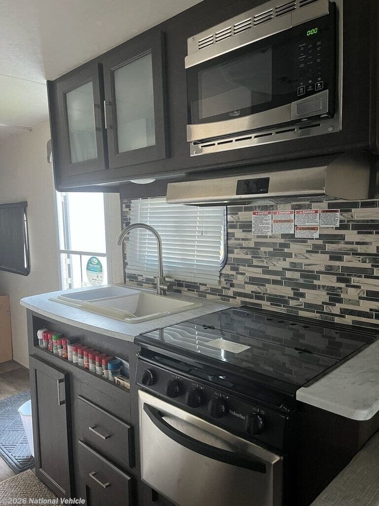 The trailer also includes a full bathroom with shower and toilet, plenty of interior storage, and large windows that bring in natural light.