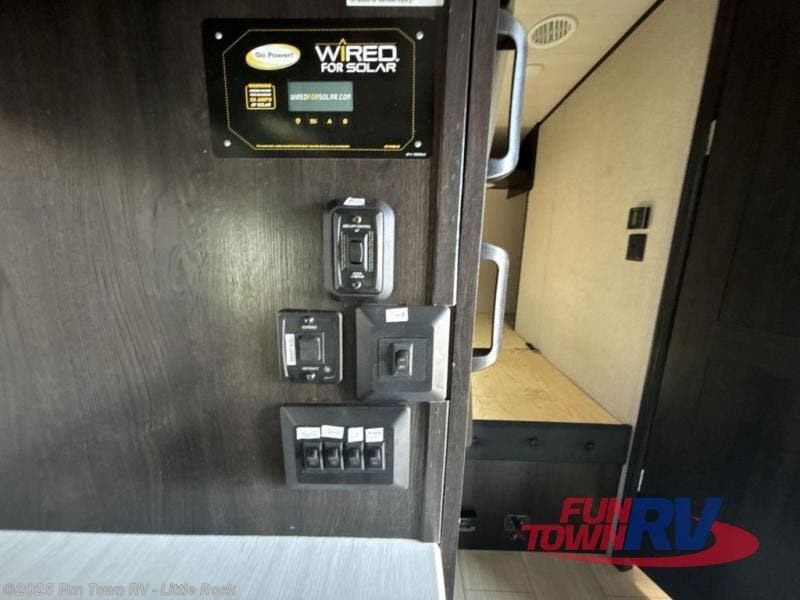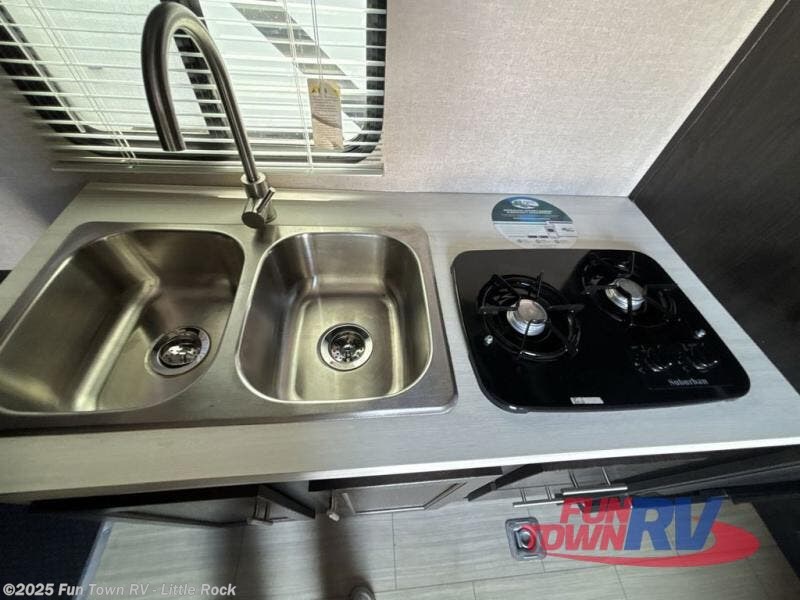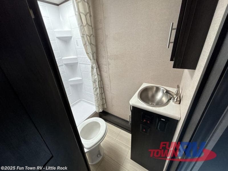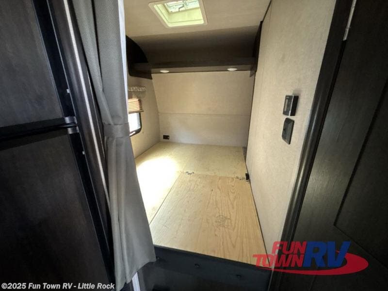 If you want a travel trailer that is on the smaller side, lightweight, and easy to unload and load one or two of your off-toys, then this model is perfect for you. There is up to 12'1" of toy storage and living space before you even get to the refrigerator, queen bed and front full bathroom. Your buddies can sleep on the pass-through dinette and electric bed when you choose to invite them to tag along while you have your own bedding. Great things can come in small packages!