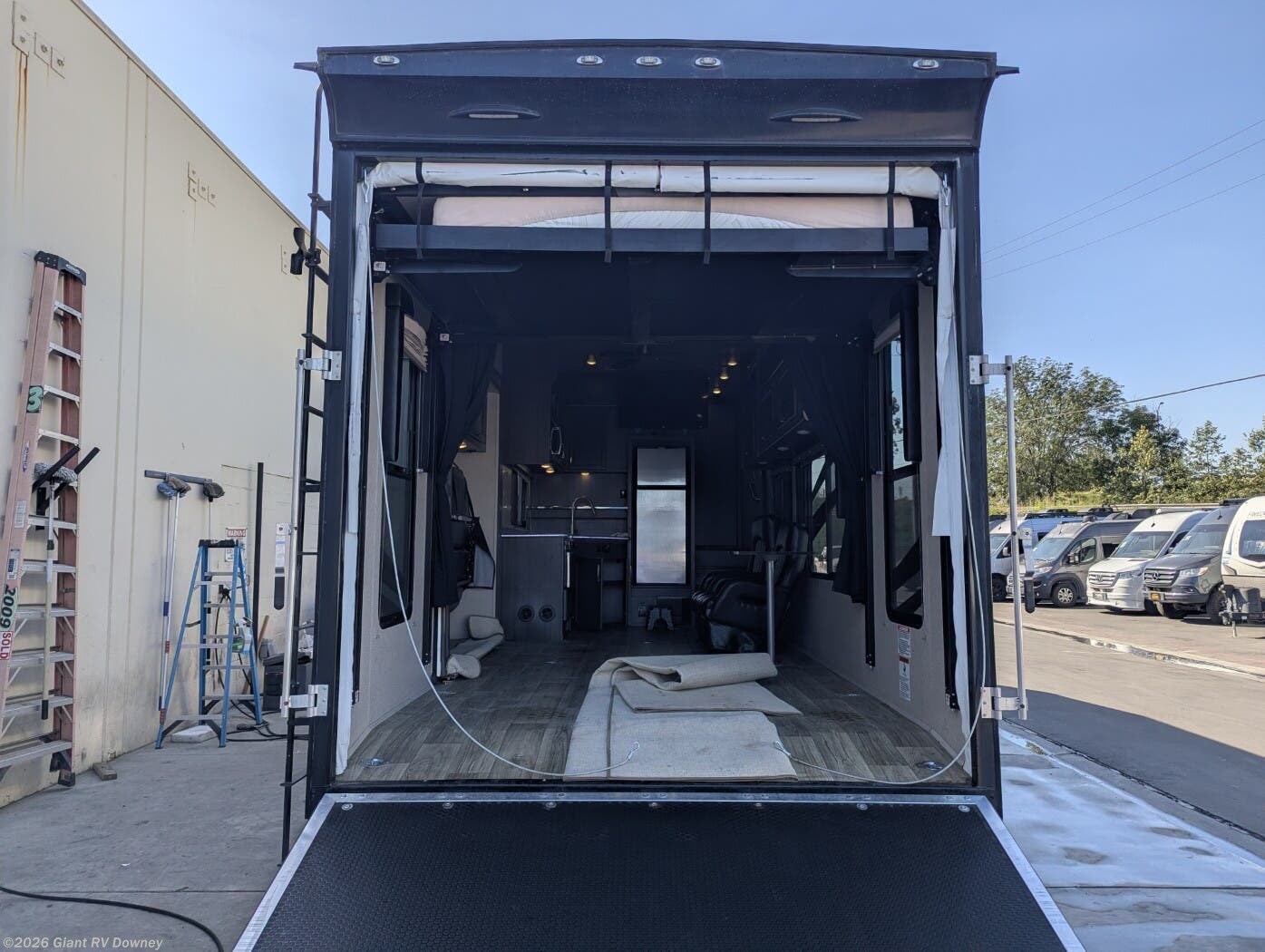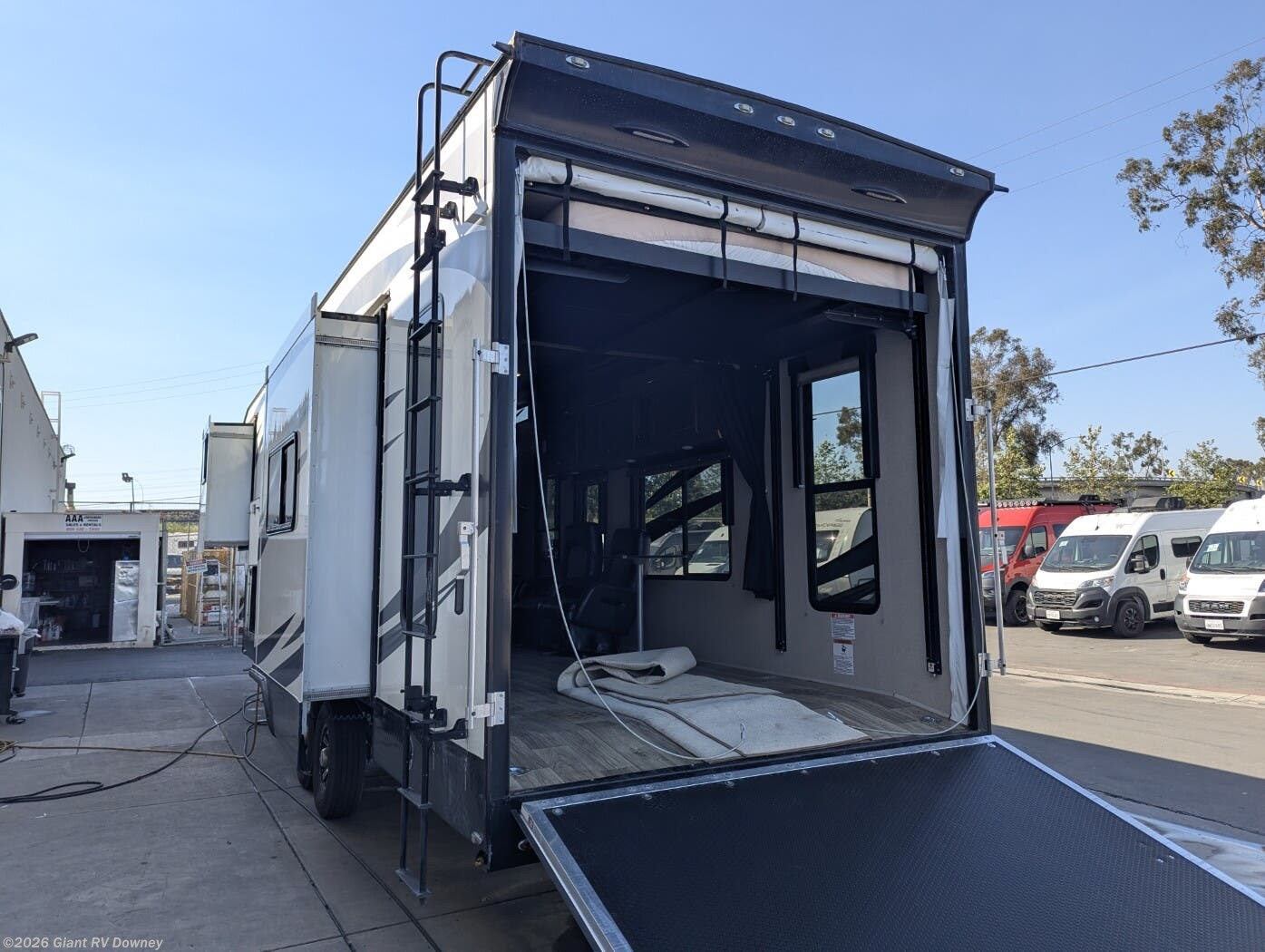 • Spacious Toy Hauler Garage with room for multiple toys, a power bunk with sofas, tie-down system, and ramp door for easy loading and unloading