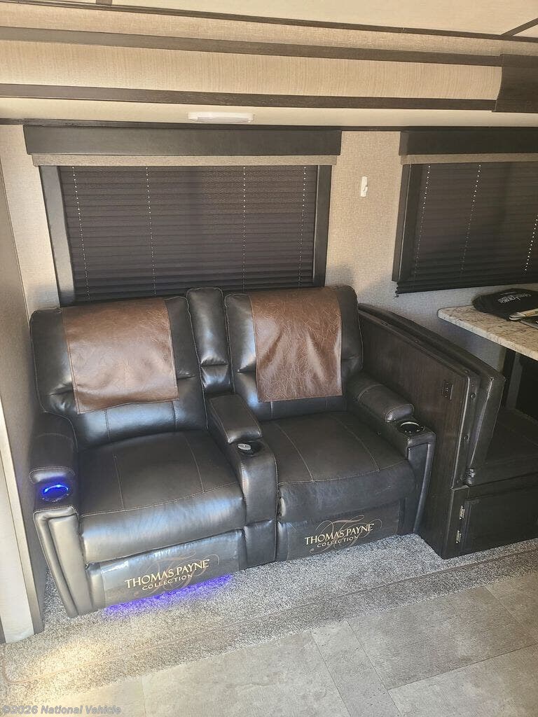 Sleeping accommodations are generous, with a queen bed in the front bedroom, bunk beds with a flip-up bed, a sofa bed, and a dinette that converts to a bed. The living room features theatre seating with heat, massage, and LED lighting for next-level relaxation.
