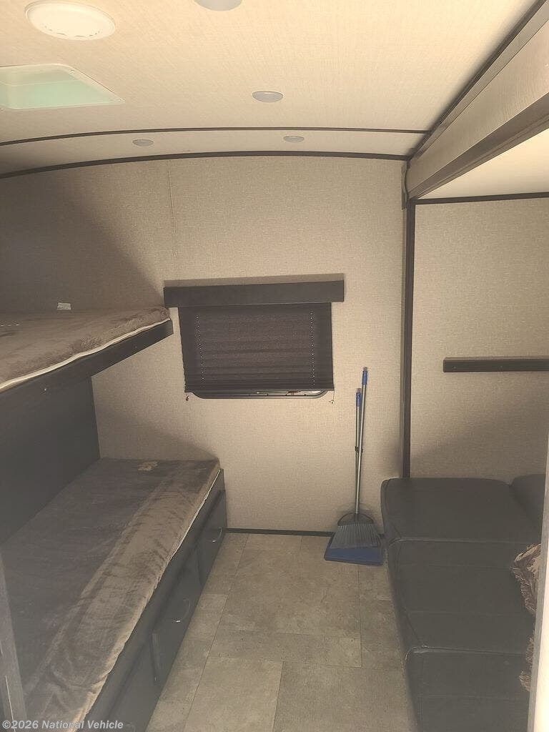 Designed with families in mind, this bunkhouse floorplan features two entry doors, a private front bedroom, and a spacious rear bunkhouse, offering comfort and privacy for everyone. The living area is bright and open with large panoramic windows, upgraded residential furniture, and thoughtful touches throughout.