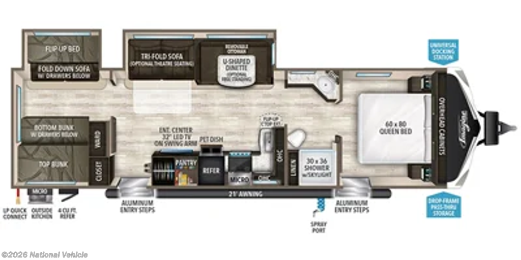 This trailer is truly turn-key ready, featuring one power retractable awning, two slide-outs, power tongue jack, manual stabilizers, and oversized holding tanks that allow longer stays when full hookups aren?t available.