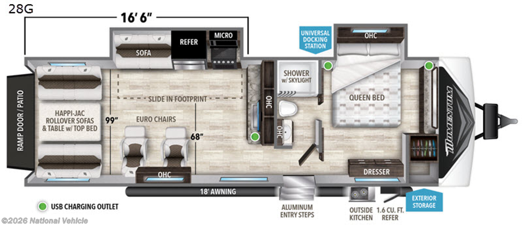16 ft 6 in garage with Happi-Jac power bunk system (bunk + convertible sofa/bed)