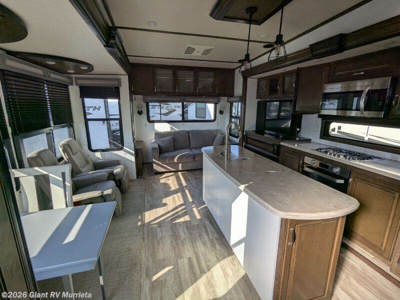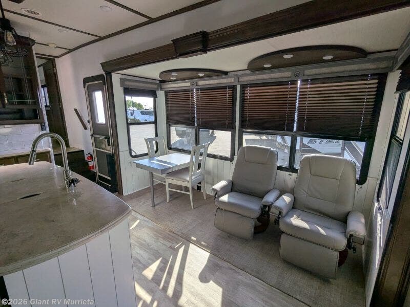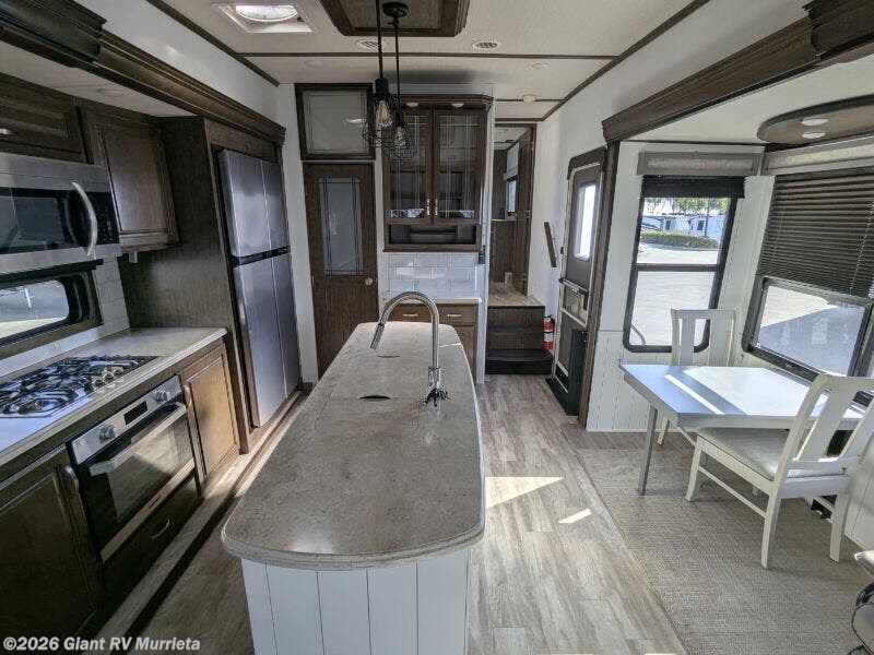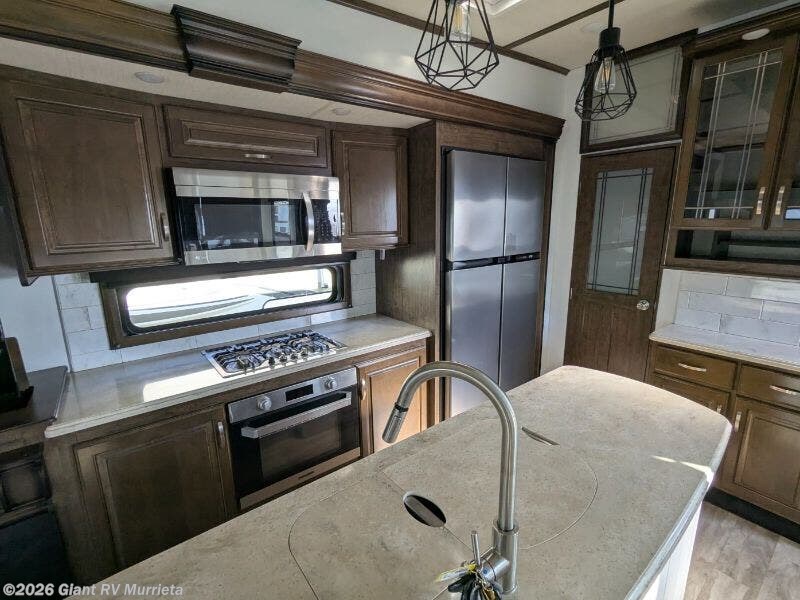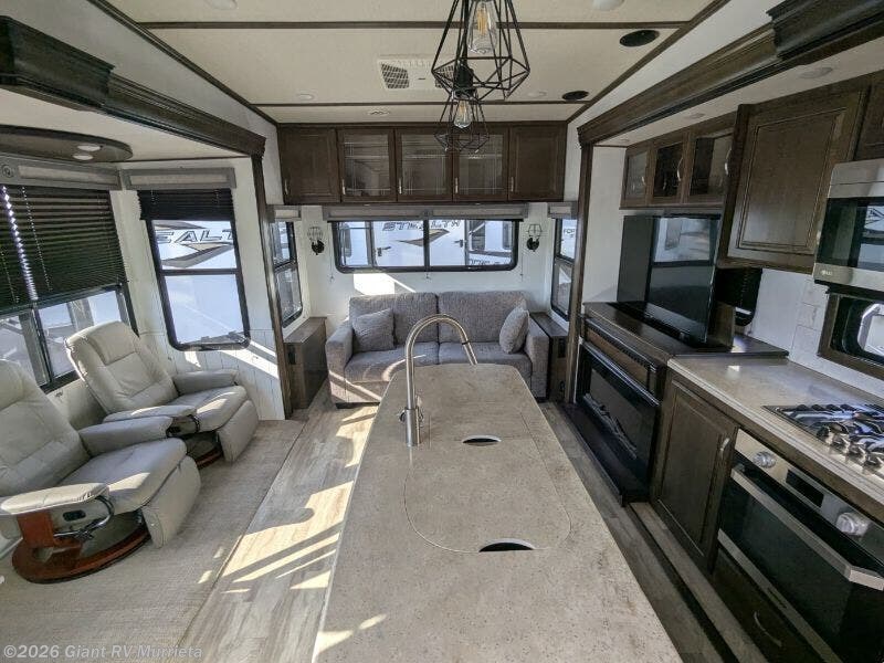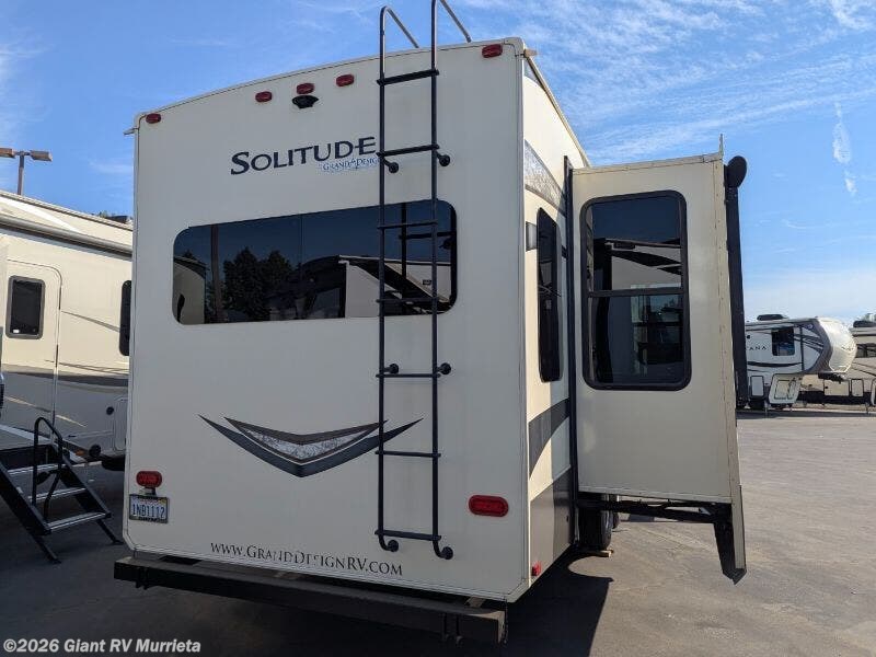 Plan a luxurious getaway with the 2019 Grand Design Solitude 310GK fifth wheel at Giant RV in California! Ideal for couples, this RV features a rear living area with theater seating for cozy evenings, a front queen bedroom for restful sleep, and three slide-outs for spacious living, sleeping up to 4. The kitchen boasts a 12 cu. ft. fridge to keep food fresh, a 3-burner cooktop for gourmet meals, and a convection microwave for quick snacks. Enjoy dual 17’ power awnings for shaded relaxation. Equipped with dual 15,000 BTU A/Cs for cool comfort, a 40,000 BTU furnace for warmth, and auto-leveling jacks for easy setup.