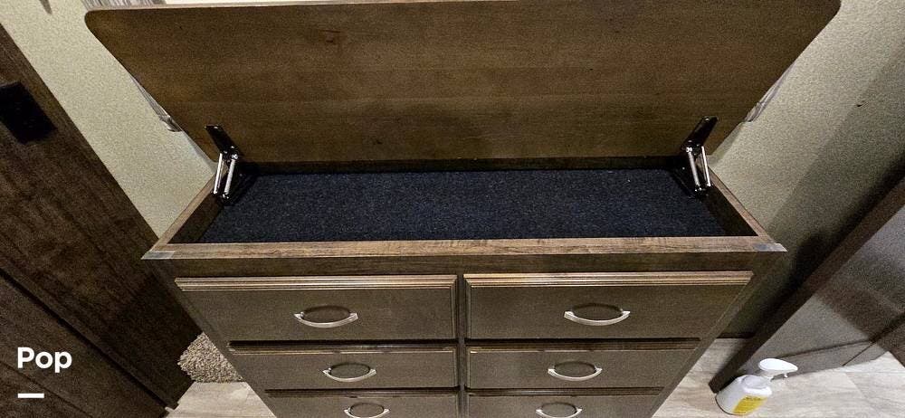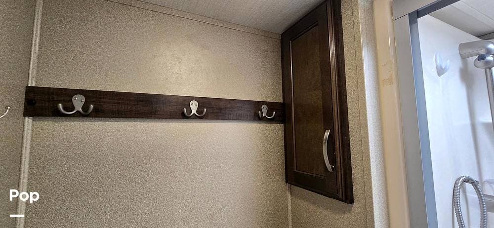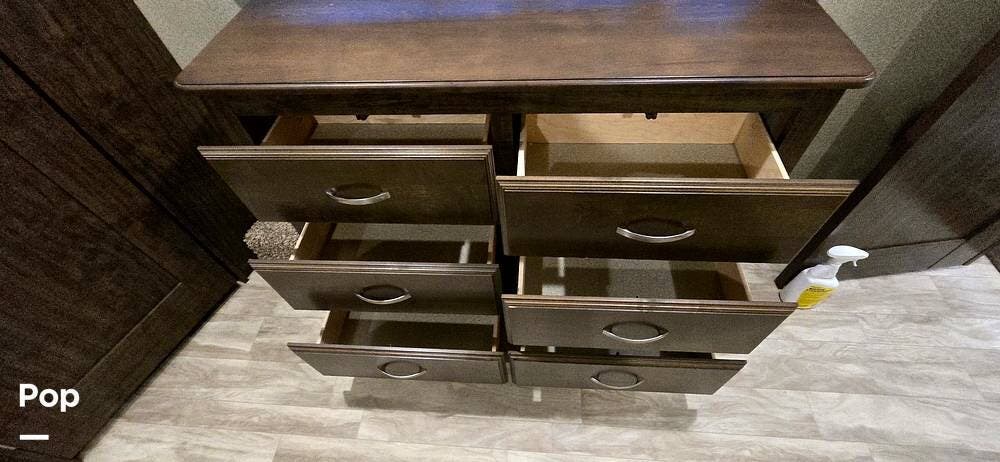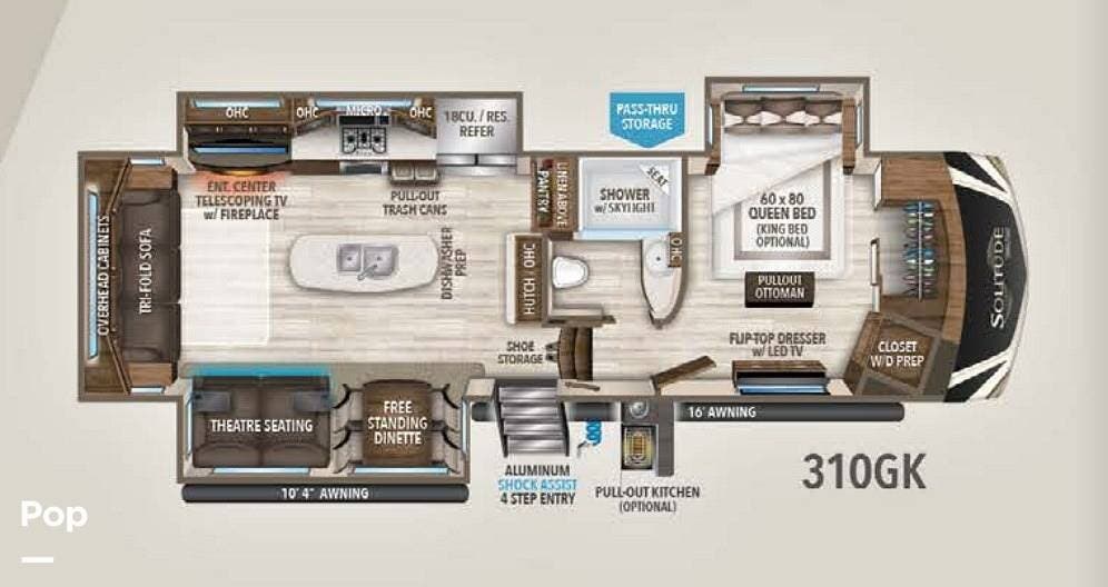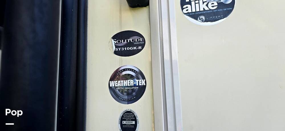 This Solitude 310GK-R features a drop-frame chassis design for enhanced storage capacity and stability. Its gel-coated fiberglass sidewalls and aluminum cage construction provide a durable and sleek exterior, while the fully enclosed and heated underbelly ensures all-season protection for plumbing and holding tanks.