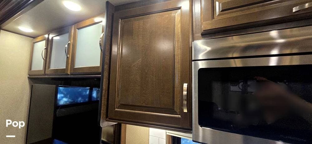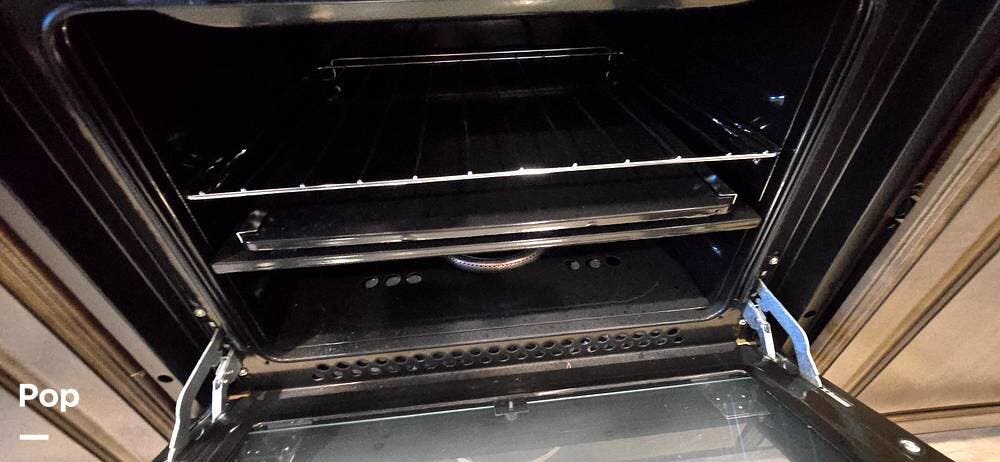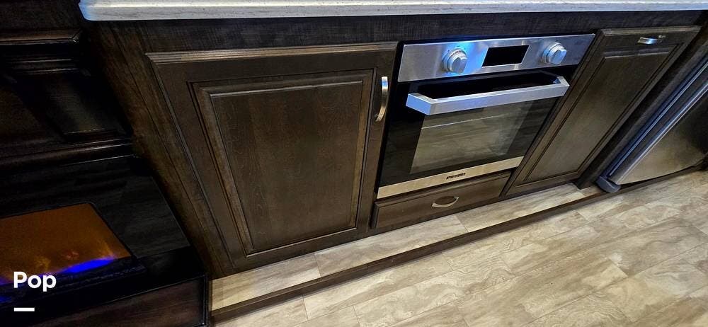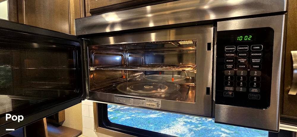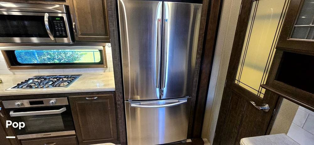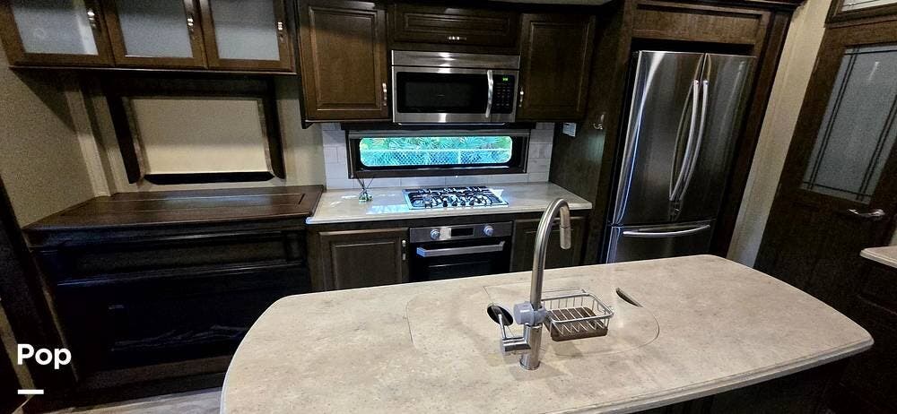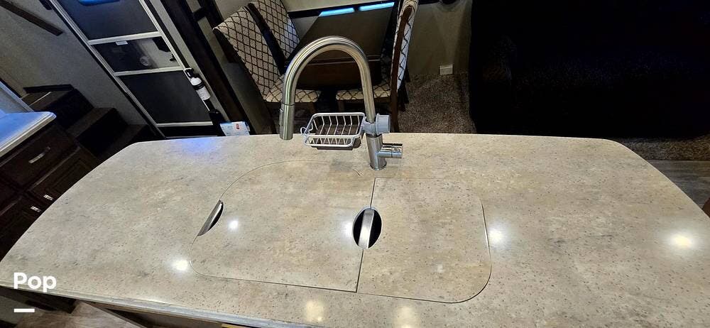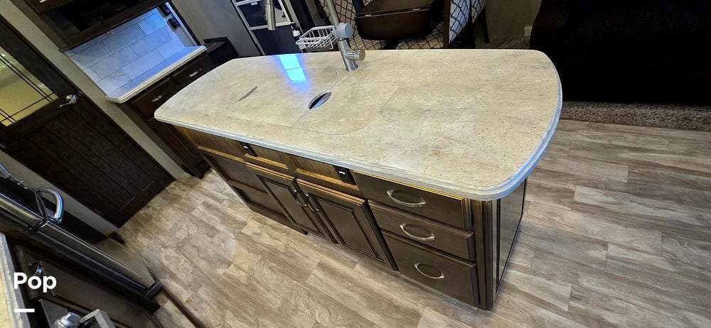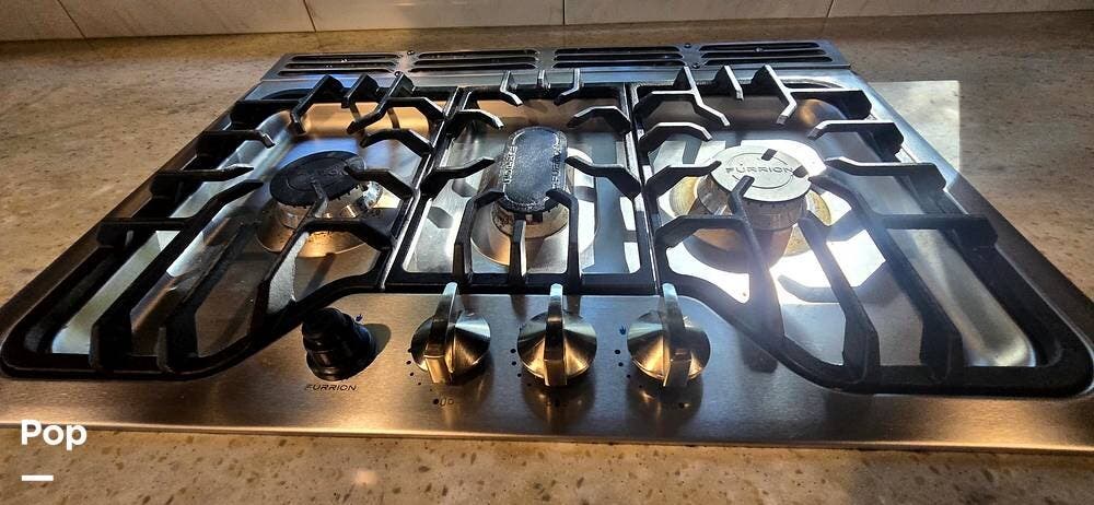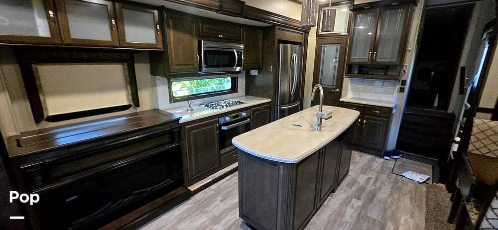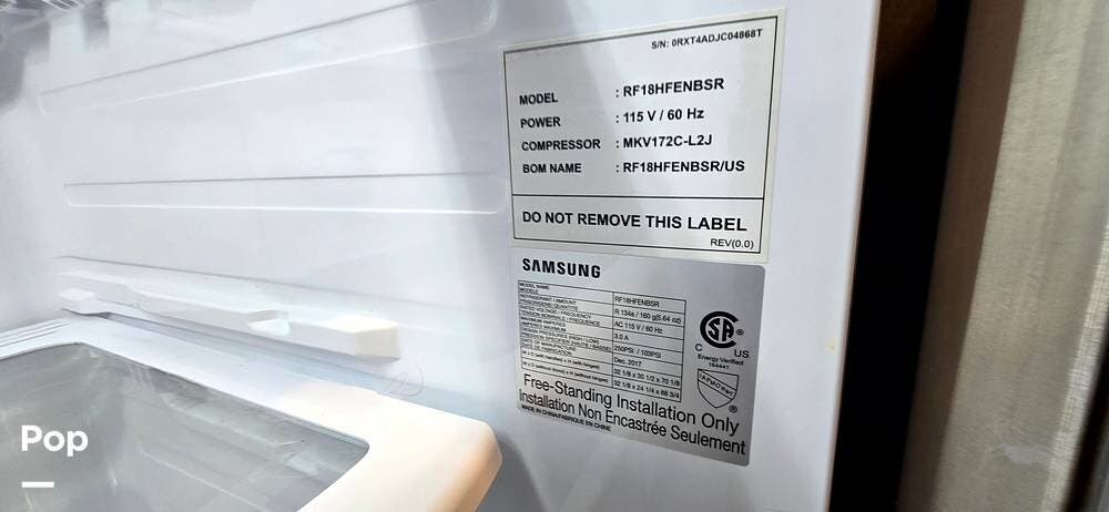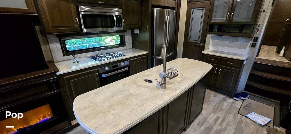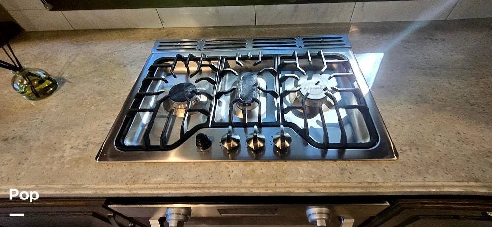 The gourmet kitchen is designed for those who love to cook on the road. It features solid-surface countertops, a large kitchen island with a deep double stainless steel sink and a residential faucet, and a residential Samsung French Door 18 cu. ft refrigerator, 3-burner Furrion gas cooktop, Furrion oven, Furrion 30-inch convection microwave, a tile backsplash, and ample pantry storage.