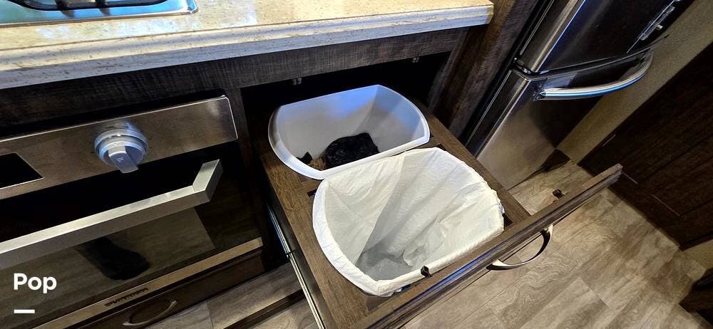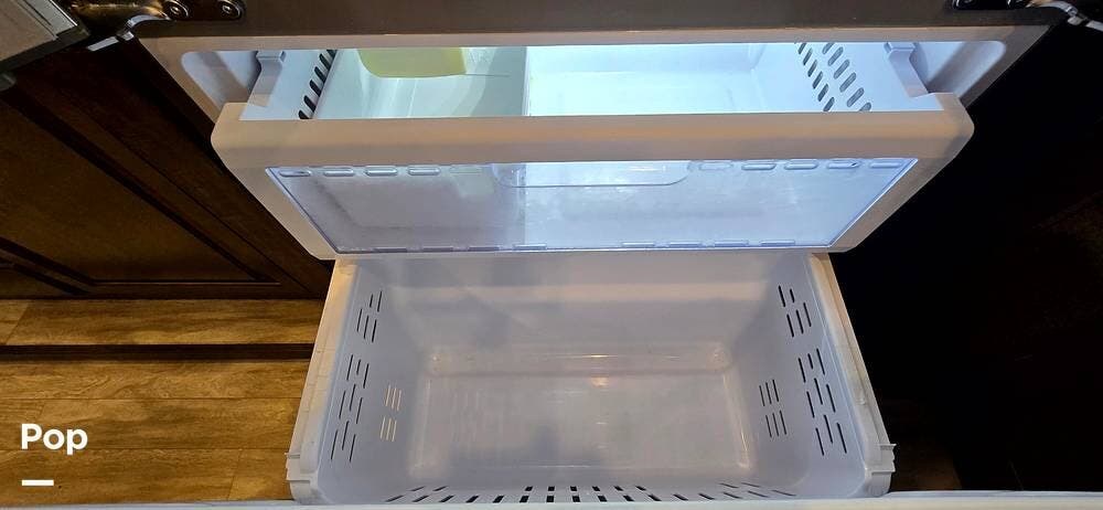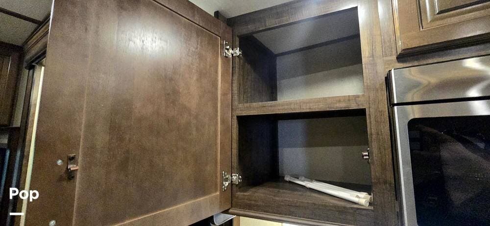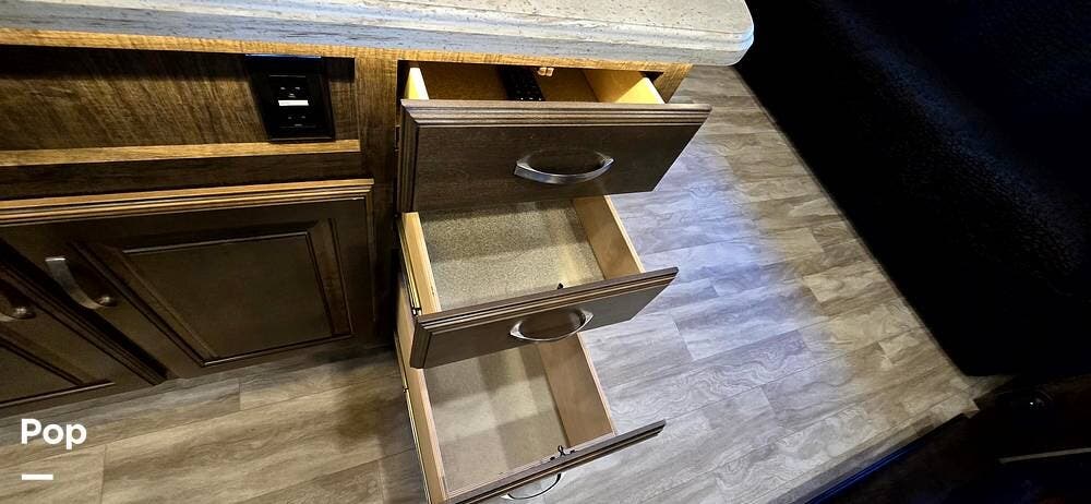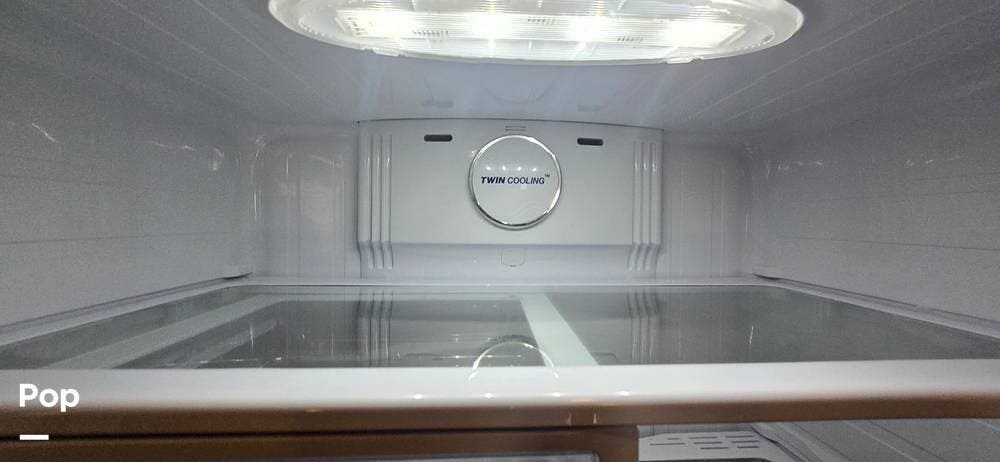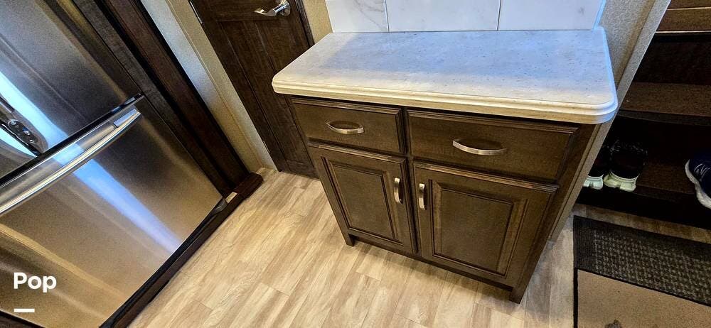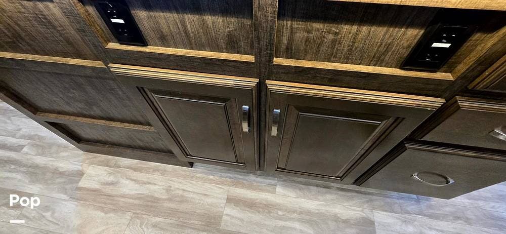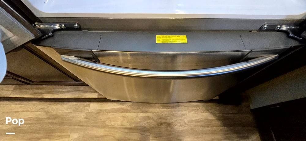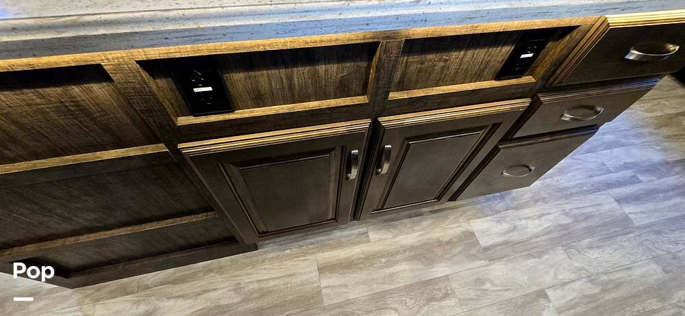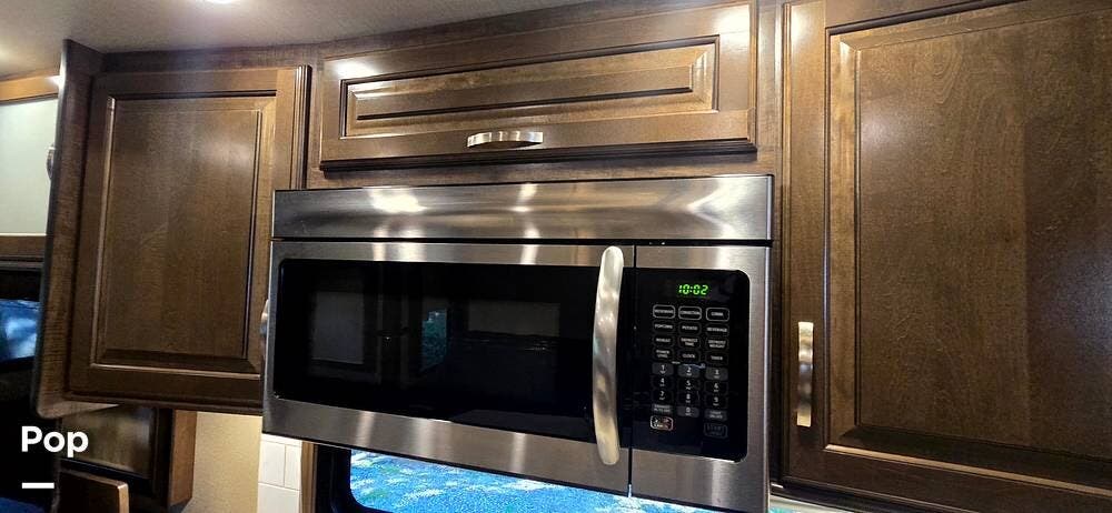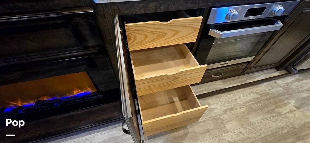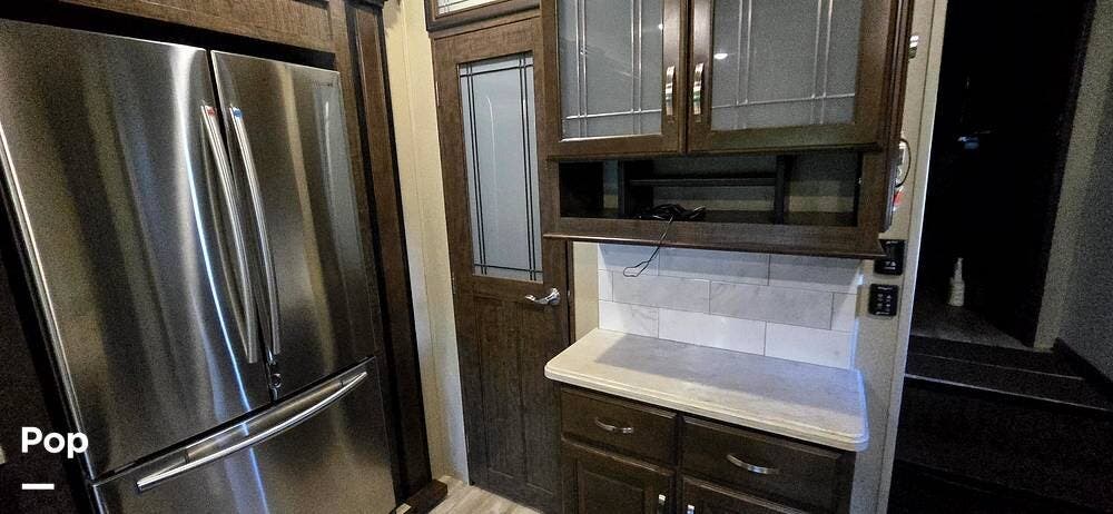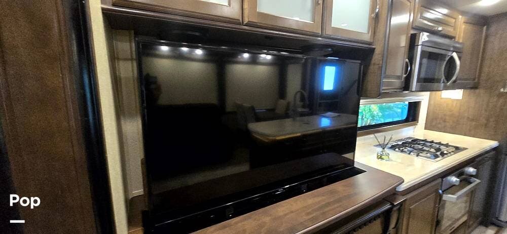 The gourmet kitchen is designed for those who love to cook on the road. It features solid-surface countertops, a large kitchen island with a deep double stainless steel sink and a residential faucet, and a residential Samsung French Door 18 cu. ft refrigerator, 3-burner Furrion gas cooktop, Furrion oven, Furrion 30-inch convection microwave, a tile backsplash, and ample pantry storage.