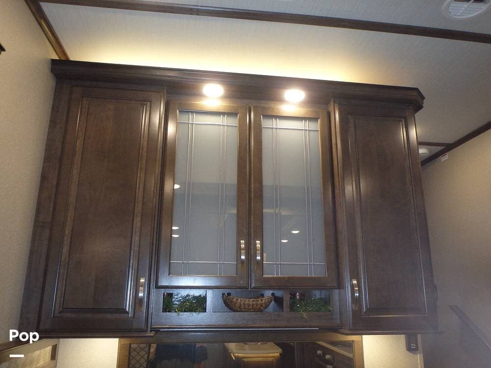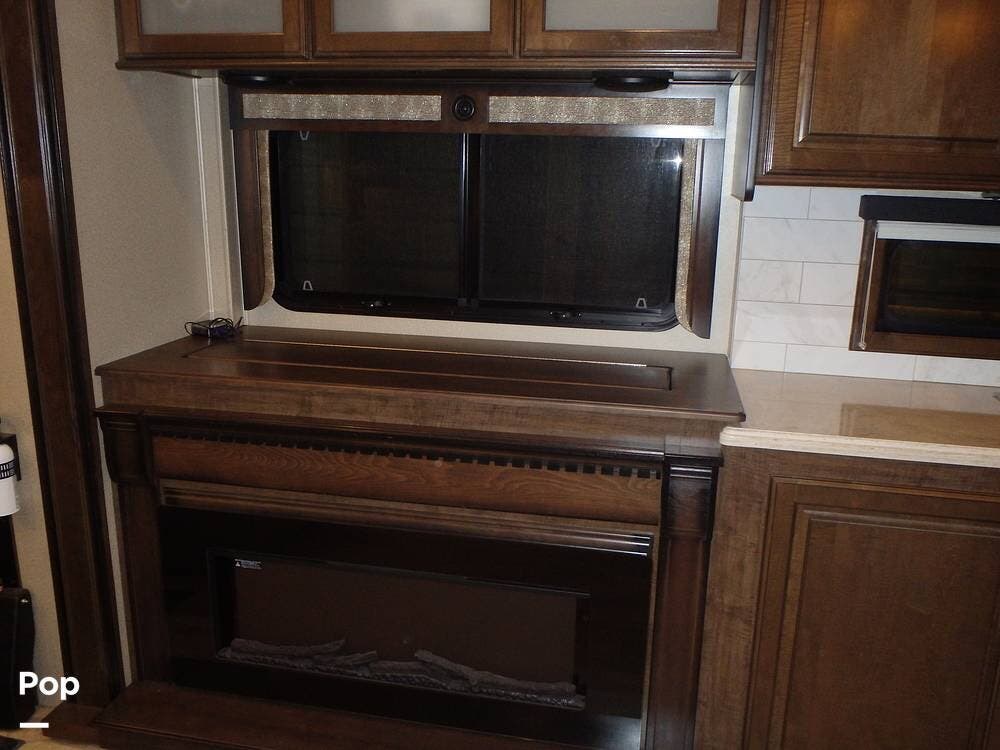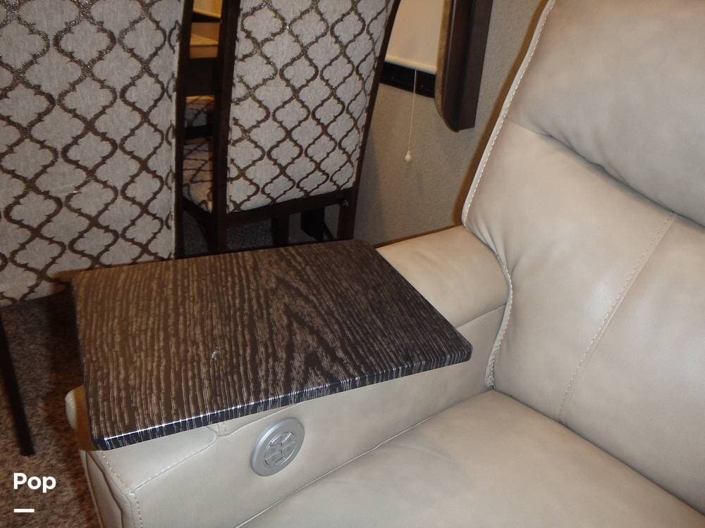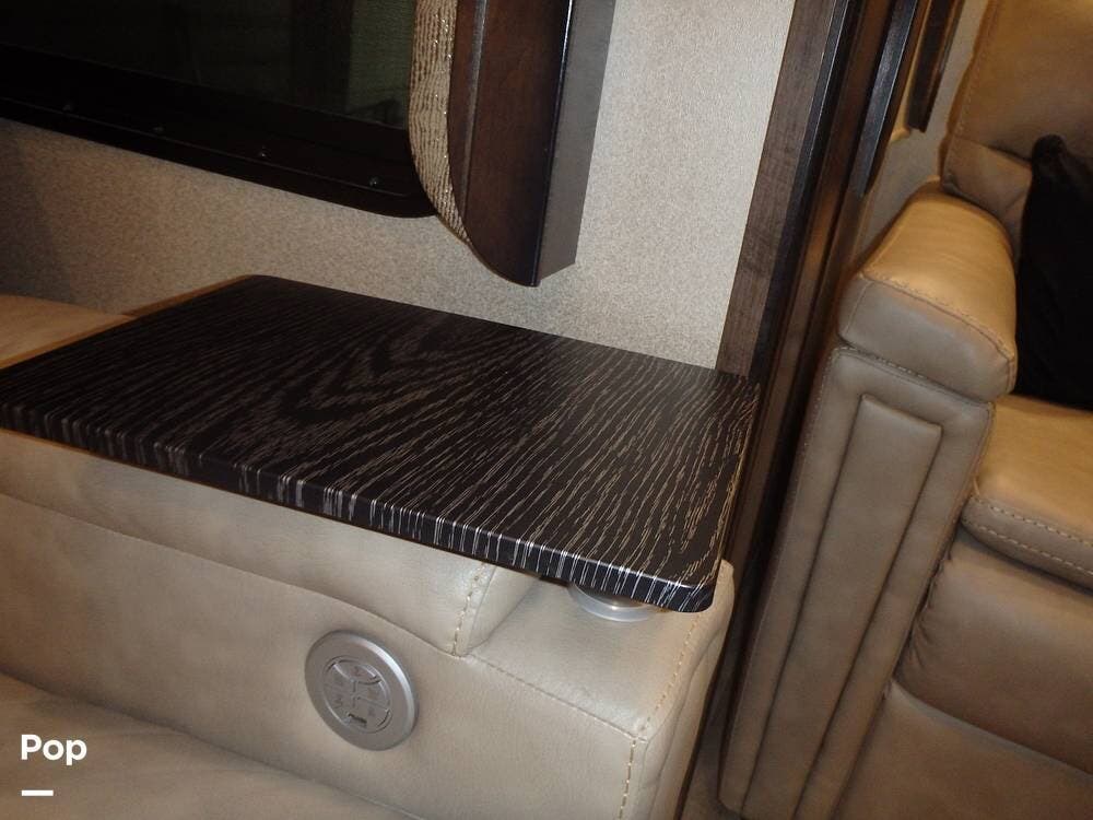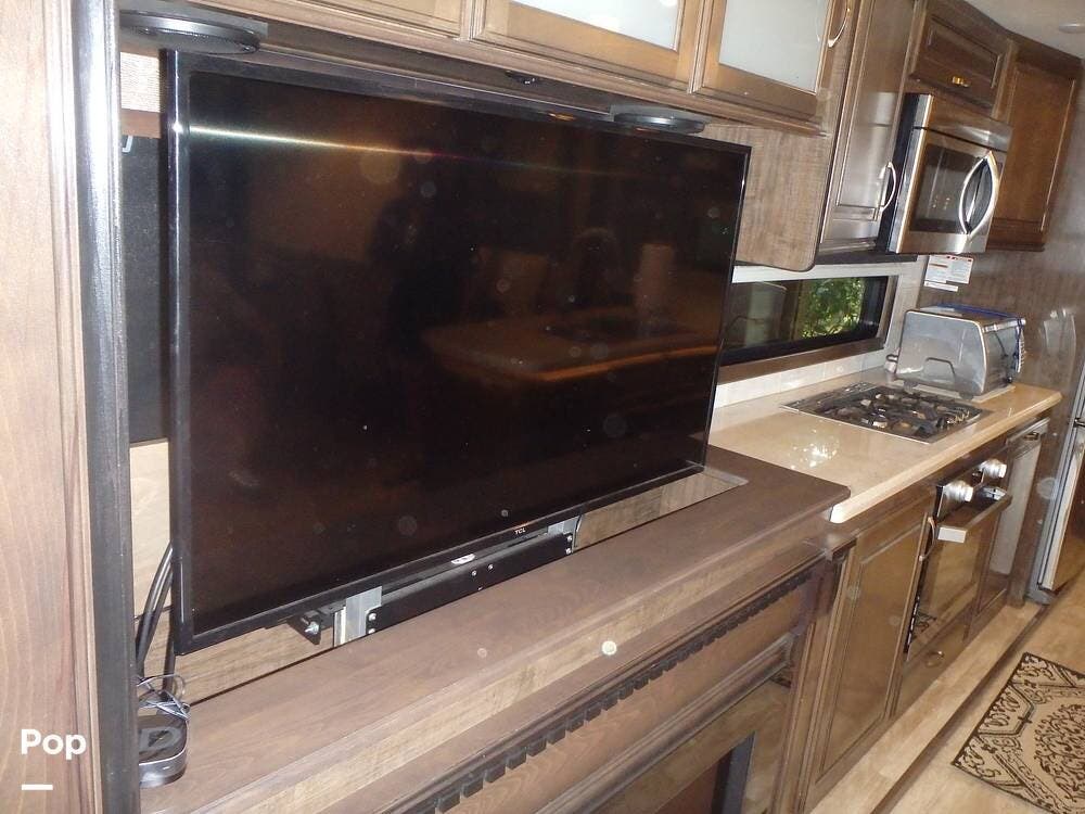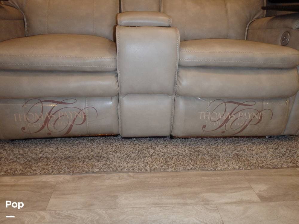 The rear lounge area features electric recliners equipped with heat and vibration to soothe the body. Also included is a comfortable tri-fold sofa that converts to a bed. The entertainment center has a large 65" LED TV on a televator and an electric fireplace.