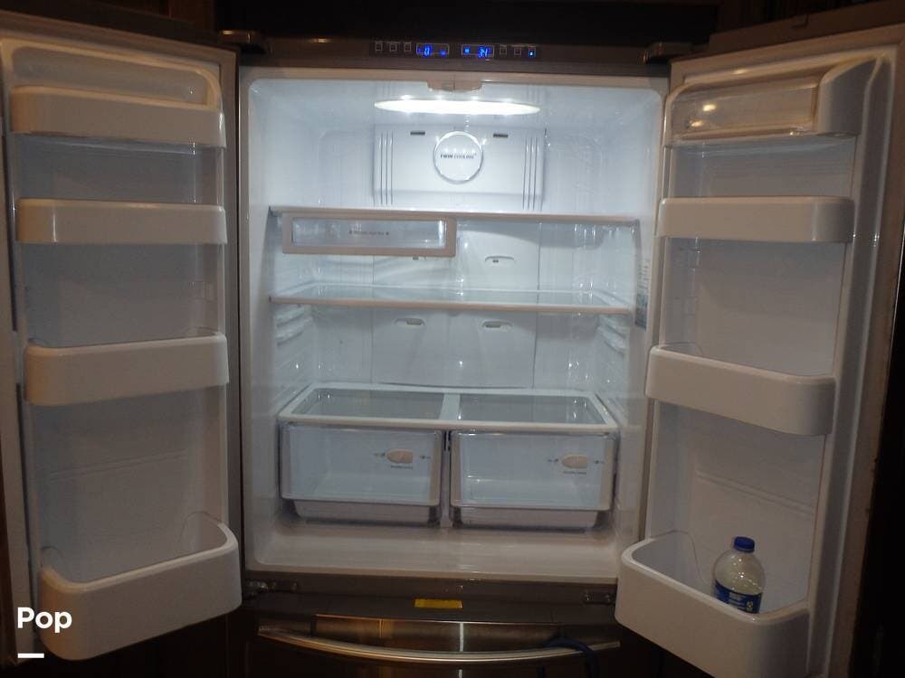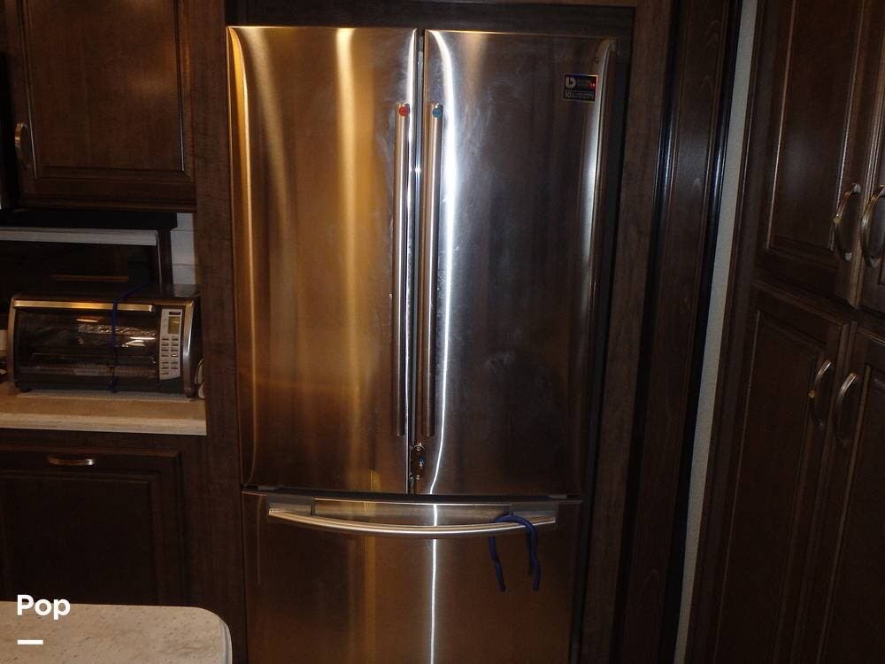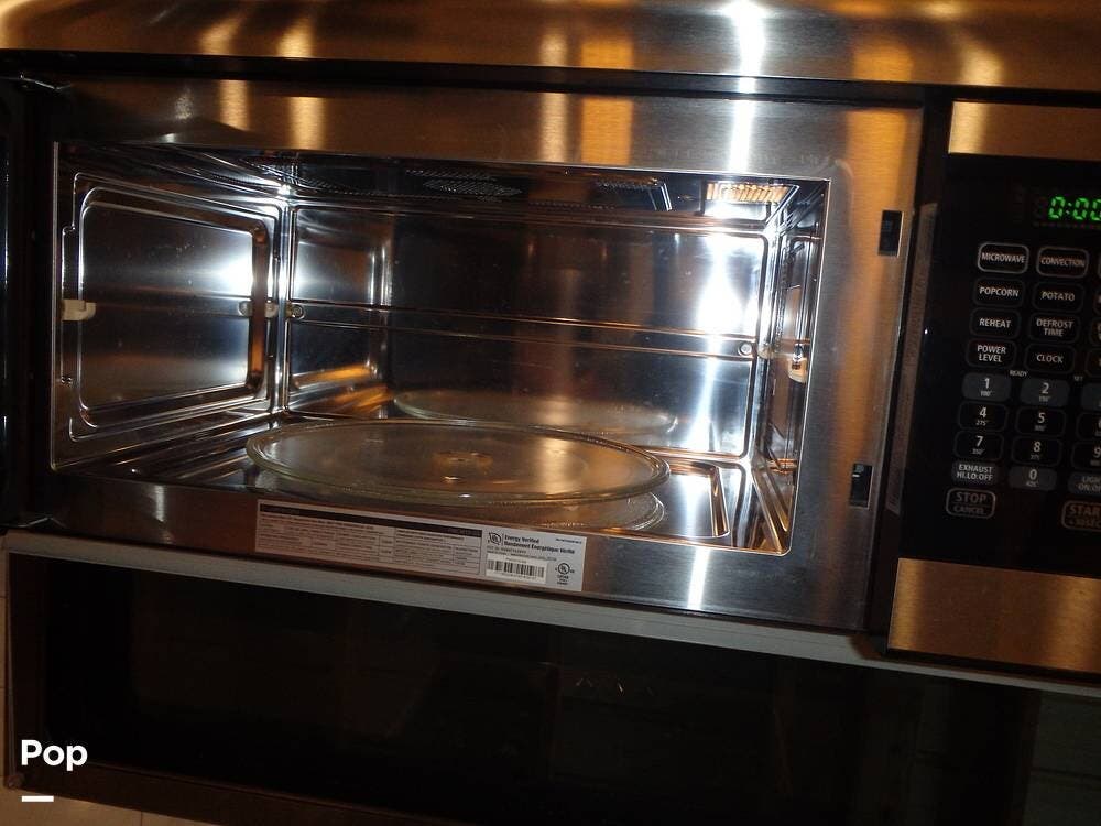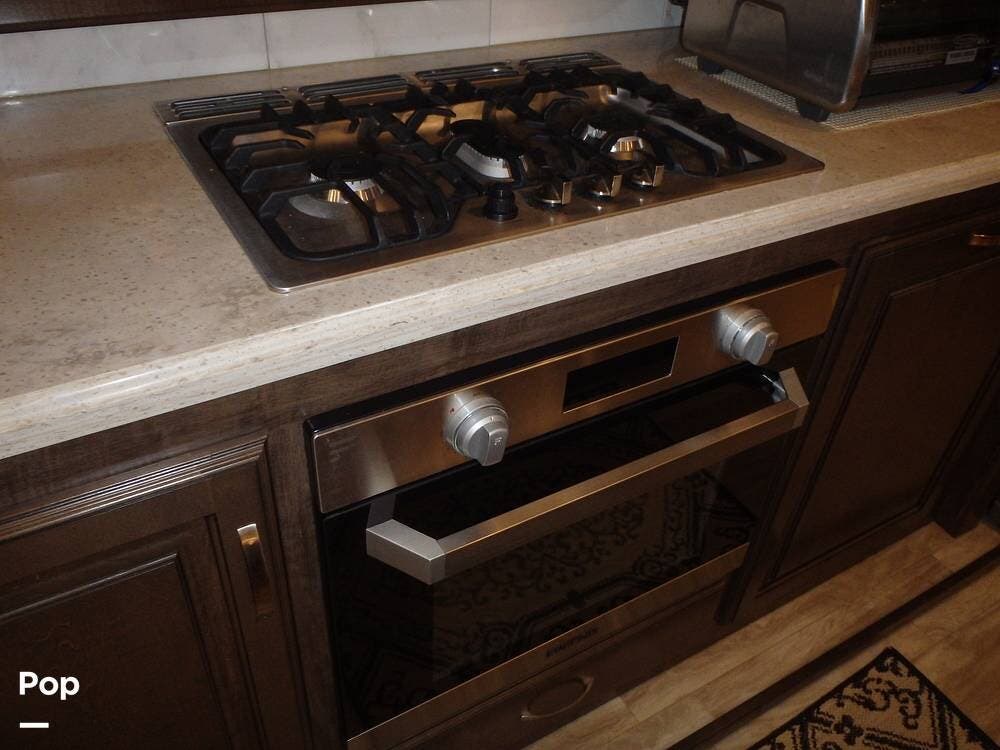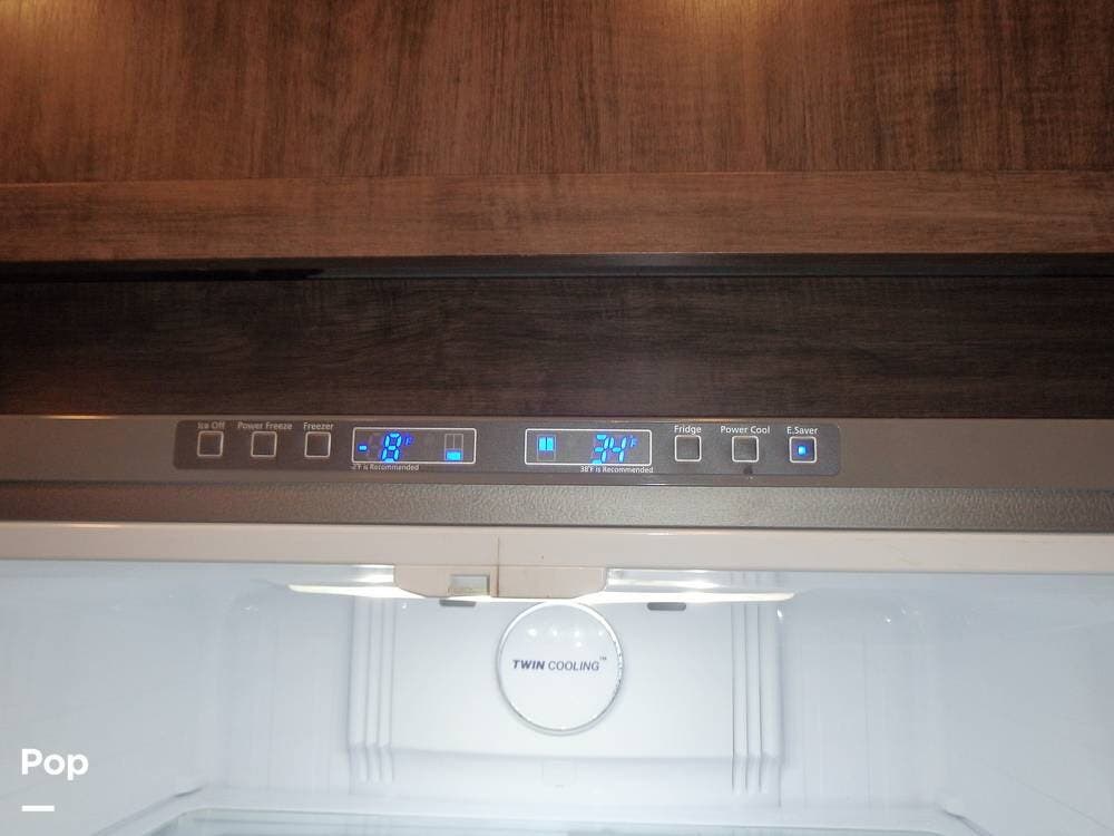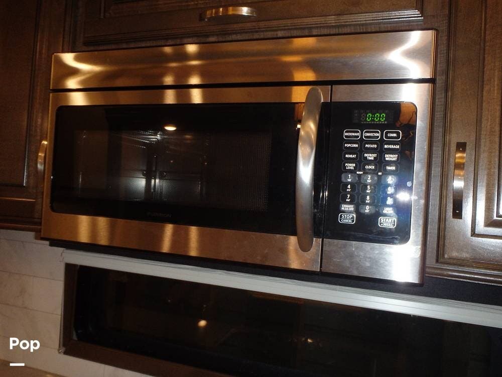 The rear lounge area features electric recliners equipped with heat and vibration to soothe the body. Also included is a comfortable tri-fold sofa that converts to a bed. The entertainment center has a large 65" LED TV on a televator and an electric fireplace.