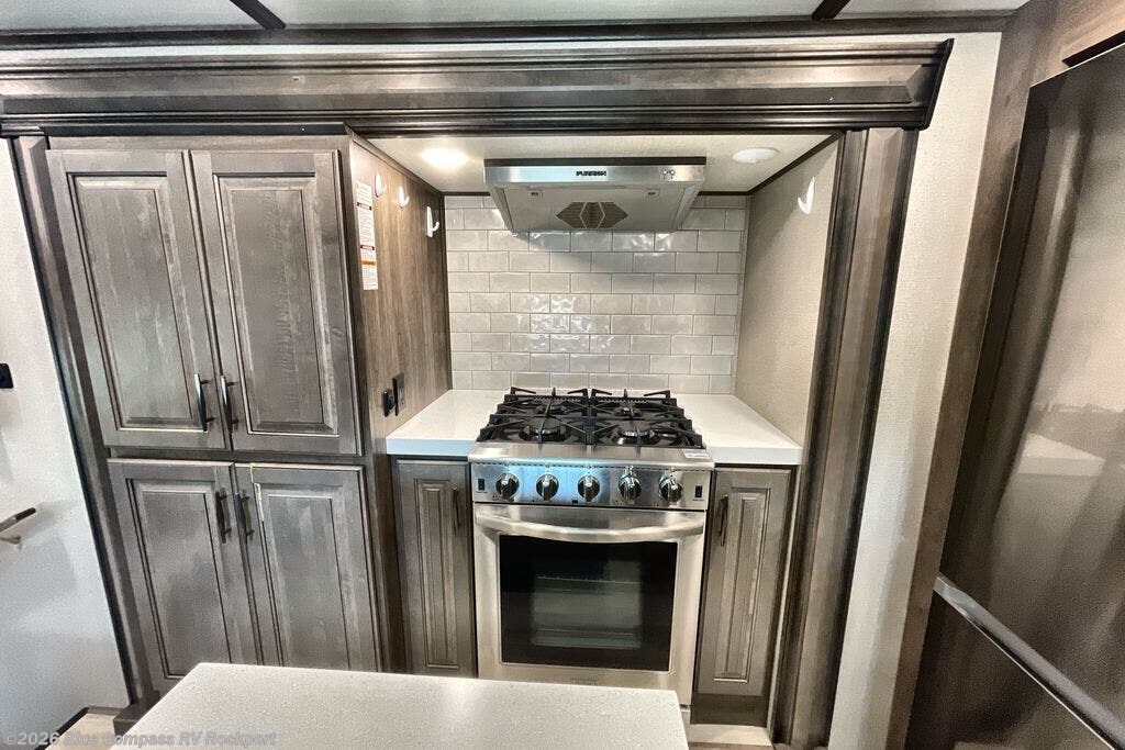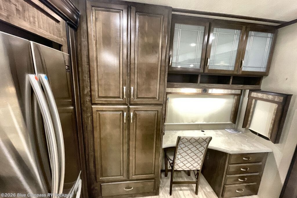 Just imagine working at your own desk while looking out the window at the mountains or the lake in this fifth wheel. Now you can start thinking about how you will enjoy a front master bedroom with a flip-top dresser, pullout ottoman, and a TV. When you aren't exploring outside, you might decide to cook your meals using the professional grade stainless steel cooktop, built-in oven or convection microwave. There is serving space on the kitchen island, and you can store leftovers in the pantry or in the stainless steel 18 cu. ft. four door refrigerator. You might even like to choose a few options such as adding a washer and dryer, a dishwasher, a king size bed, or even a pull-out kitchen outside. Come see how this Solitude allows you to work and play at any destination.