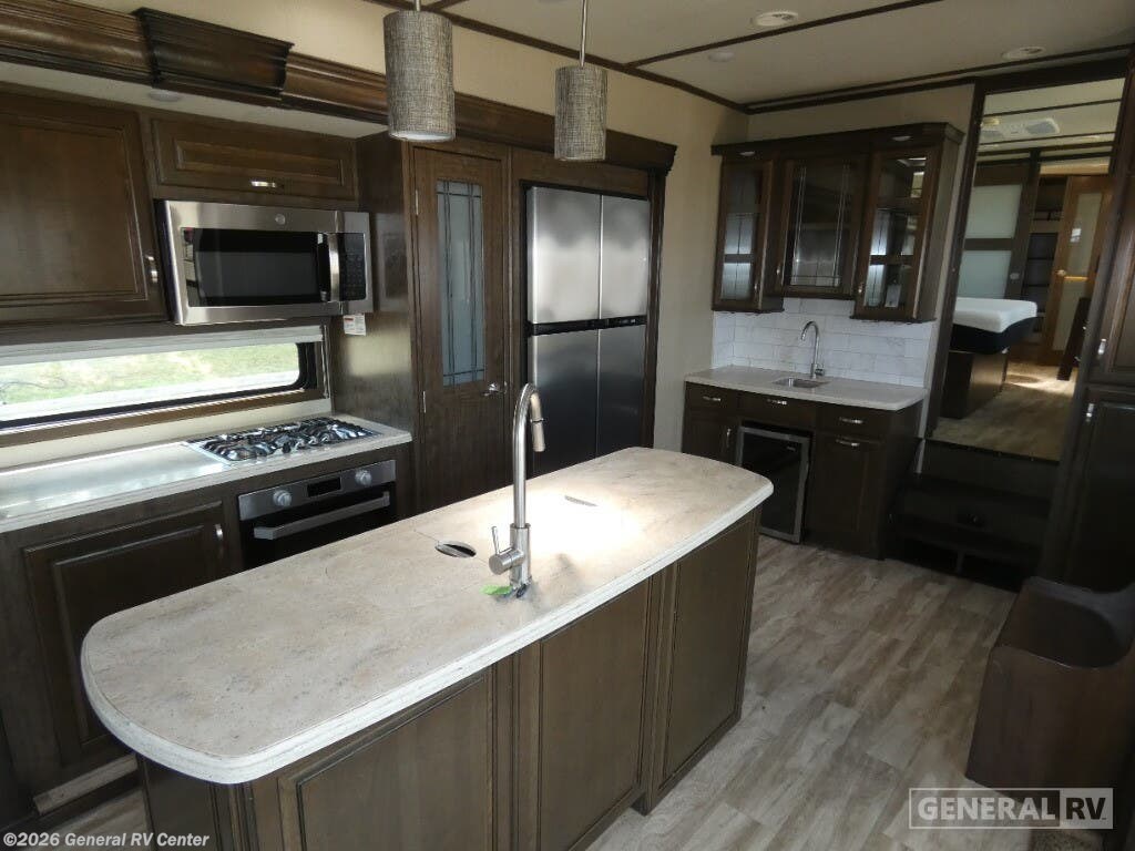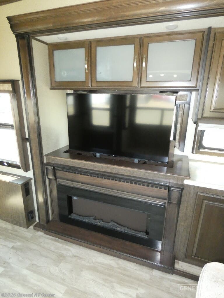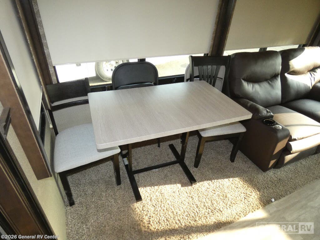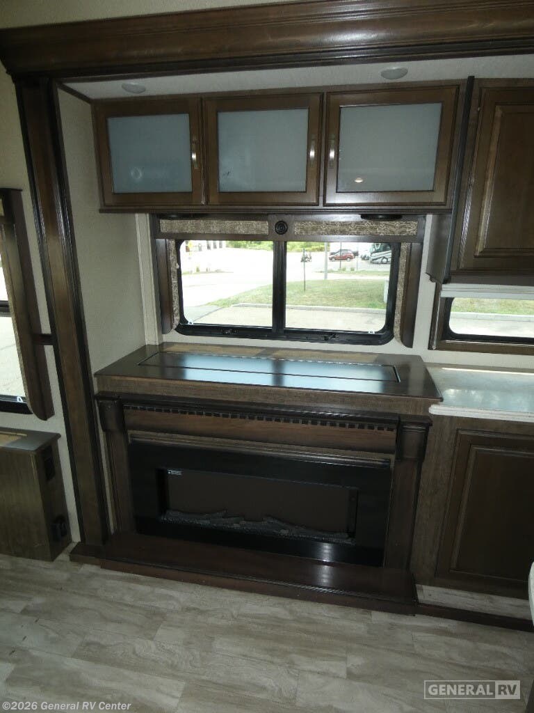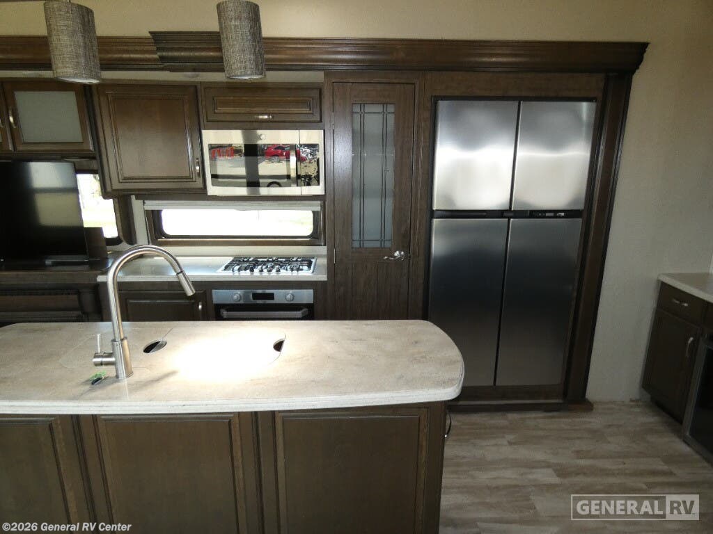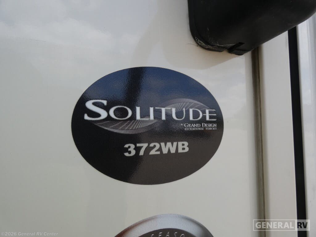 Experience the pinnacle of comfort and luxury with the 2019 Grand Design Solitude 372WB. This remarkable fifth wheel is designed for those who appreciate the finer things in life while exploring the open road. With its expansive 41-foot length and four slides, you'll feel right at home with ample space to relax and entertain. The rear living area is a true highlight, featuring theater seating and a tri-fold sofa, perfect for cozy evenings by the telescoping TV and fireplace. The center kitchen is a chef's dream, equipped with a full-size electric refrigerator, a three-burner cooktop, and an optional pull-out kitchen for alfresco dining under the dual powered awnings. Retreat to the center bedroom, where you can choose between a queen or optional king bed, ensuring a restful night's sleep. The front bath offers a luxurious escape with a spacious shower and washer/dryer prep for added convenience. With a generous fresh water capacity of 93 gallons and plenty of storage throughout, this RV is ready for extended adventures. Whether you're parked at a scenic campsite or on the road, the Solitude 372WB provides a haven of elegance and functionality. For more details, visit your nearest General RV dealership.