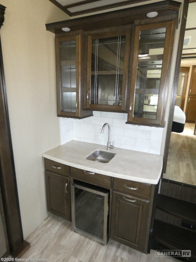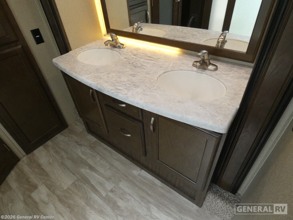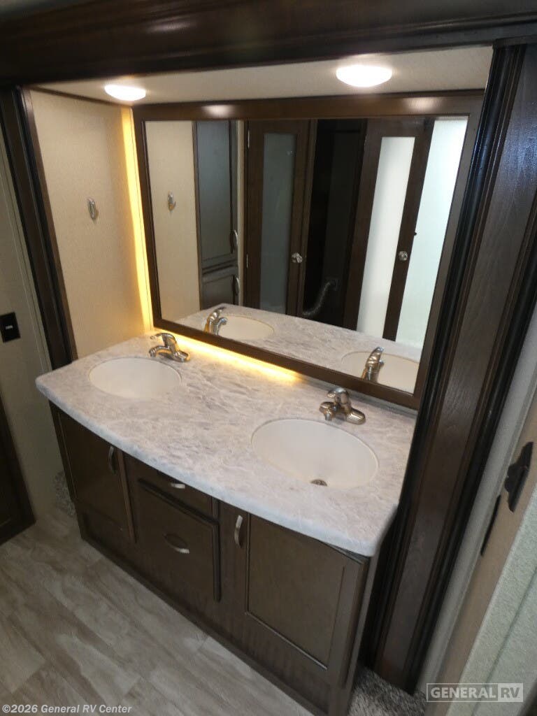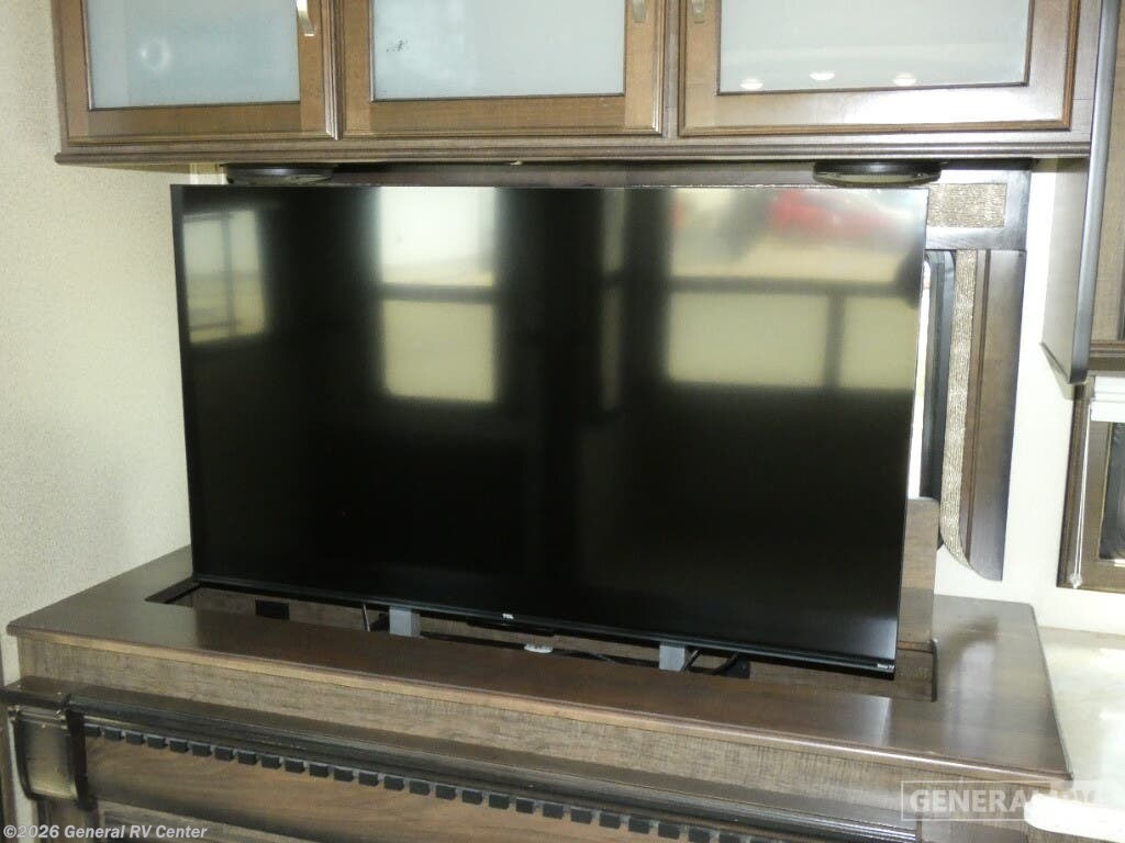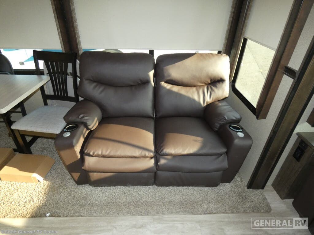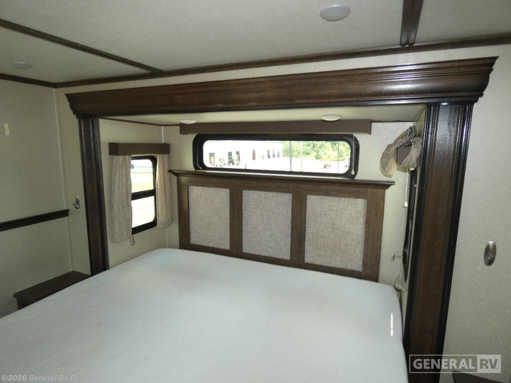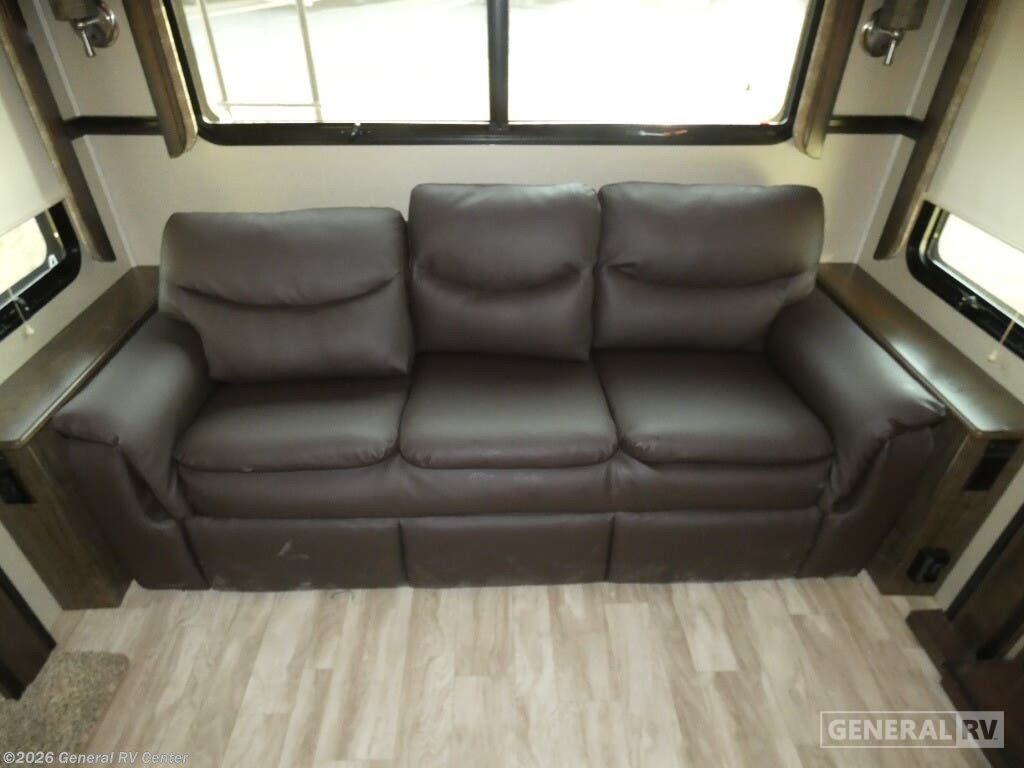 Experience the pinnacle of comfort and luxury with the 2019 Grand Design Solitude 372WB. This remarkable fifth wheel is designed for those who appreciate the finer things in life while exploring the open road. With its expansive 41-foot length and four slides, you'll feel right at home with ample space to relax and entertain. The rear living area is a true highlight, featuring theater seating and a tri-fold sofa, perfect for cozy evenings by the telescoping TV and fireplace. The center kitchen is a chef's dream, equipped with a full-size electric refrigerator, a three-burner cooktop, and an optional pull-out kitchen for alfresco dining under the dual powered awnings. Retreat to the center bedroom, where you can choose between a queen or optional king bed, ensuring a restful night's sleep. The front bath offers a luxurious escape with a spacious shower and washer/dryer prep for added convenience. With a generous fresh water capacity of 93 gallons and plenty of storage throughout, this RV is ready for extended adventures. Whether you're parked at a scenic campsite or on the road, the Solitude 372WB provides a haven of elegance and functionality. For more details, visit your nearest General RV dealership.