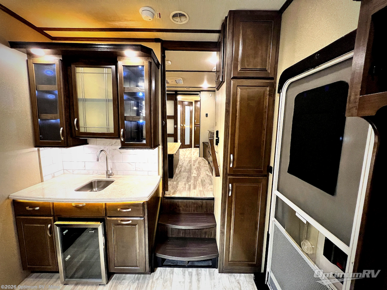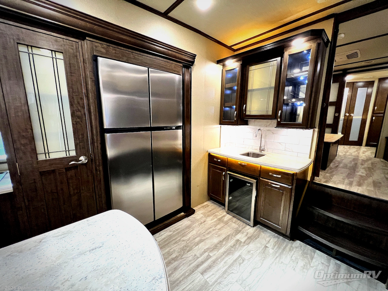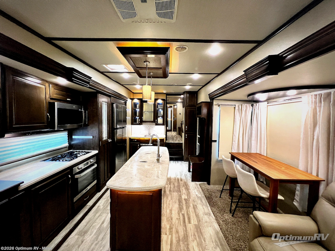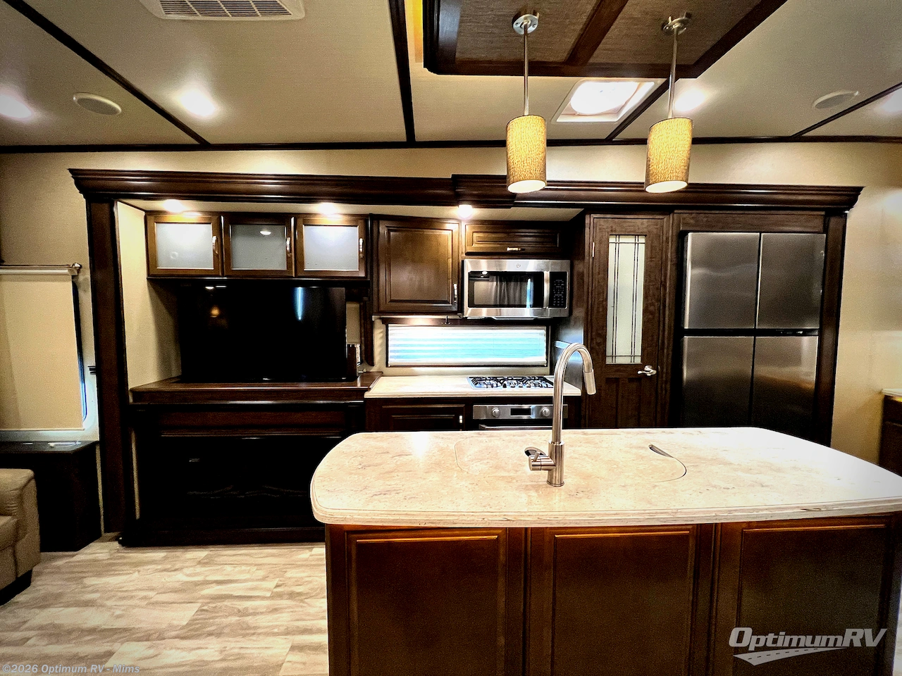 If you are looking for a full-time RV with luxury and comforts like home, this fifth wheel might just be the one. Imagine having a full master bathroom with dual sinks and plenty of storage, plus a washer/dryer if you decided to add those optional appliances to the prepped space. Now start thinking about how you will enjoy the walk-through master bedroom with a flip-top dresser, dual seats, and an LED TV. The cook will have a professional grade stainless steel cooktop, built-in oven and convection microwave to make meals. This model even includes a beverage cooler in the wine bar, dishwasher prep in the kitchen island, a stainless steel 18 cu. ft. four door refrigerator, and a large pantry. You will find plenty of seating to entertain your friends, plus a fireplace to keep everyone cozy on those chilly nights. Come see how this Solitude offers conveniences and comfort throughout, plus plenty of storage for all your things.