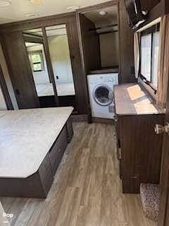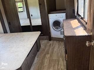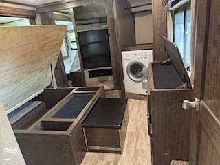 At the front of the RV is the Master Bedroom featuring a walk-around bed. At the foot of the bed is a pull-out ottoman. Relax and enjoy the flat screen TV with dresser storage below. There is a huge walk-in wardrobe closet at the front of the bedroom. The RV is also equipped with a W/D unit.