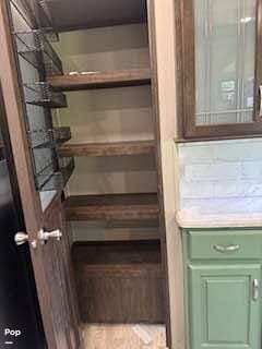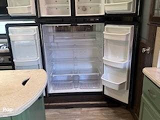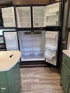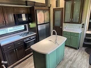 The kitchen has a large center island with a double sink. There is a microwave, a stove, an oven, and a large refrigerator/freezer. There is plenty of counter prep space and cabinet storage for all your meal prep items. The kitchen storage also includes a pantry and hutch storage.