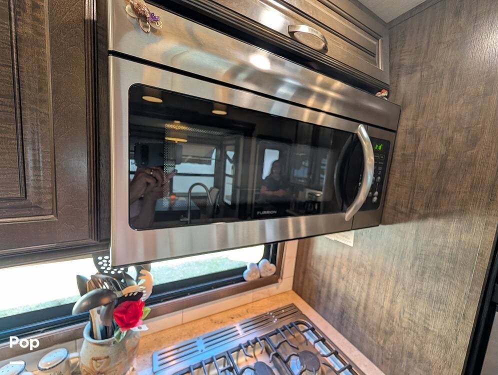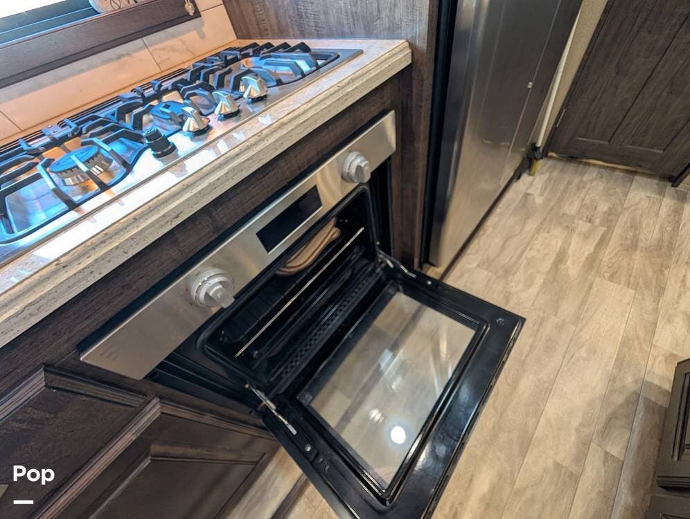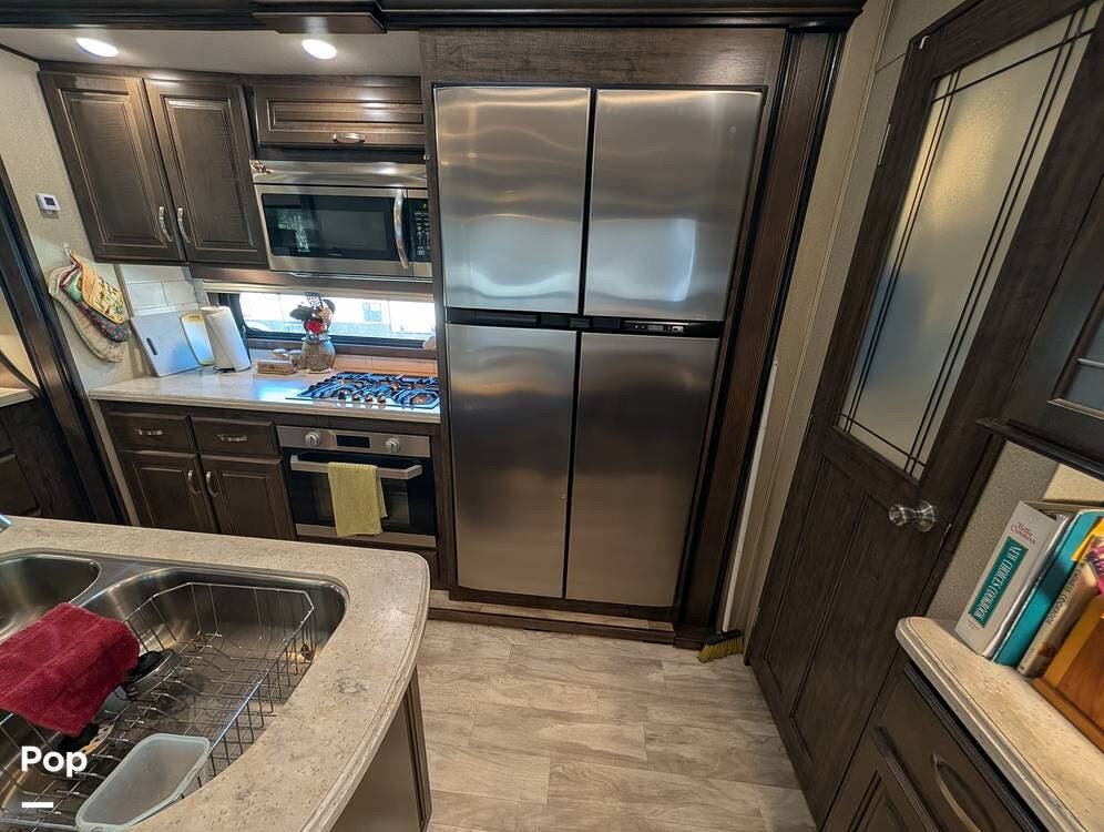 Step inside and you're in the kitchen with the space from the opposing slides. All stainless appliances include the large Norcold refrigerator.