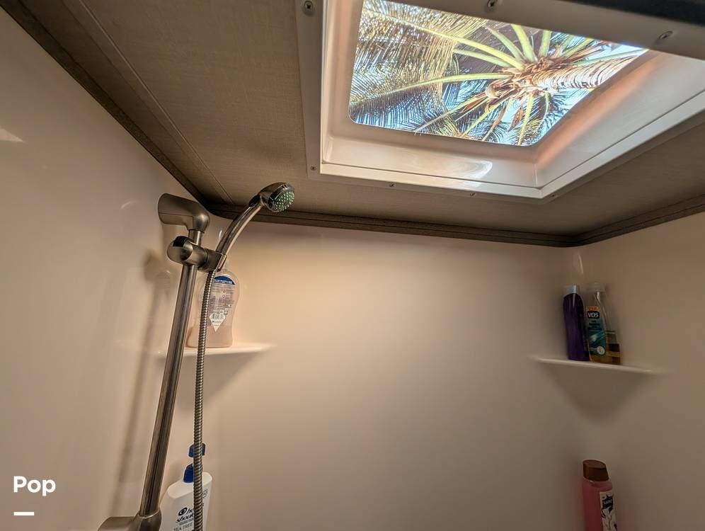 Going to the rear is the full bath on your left. Oversized shower with a skylight and plenty of linen storage.