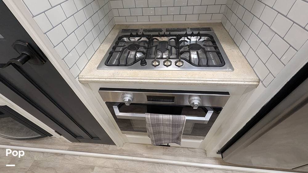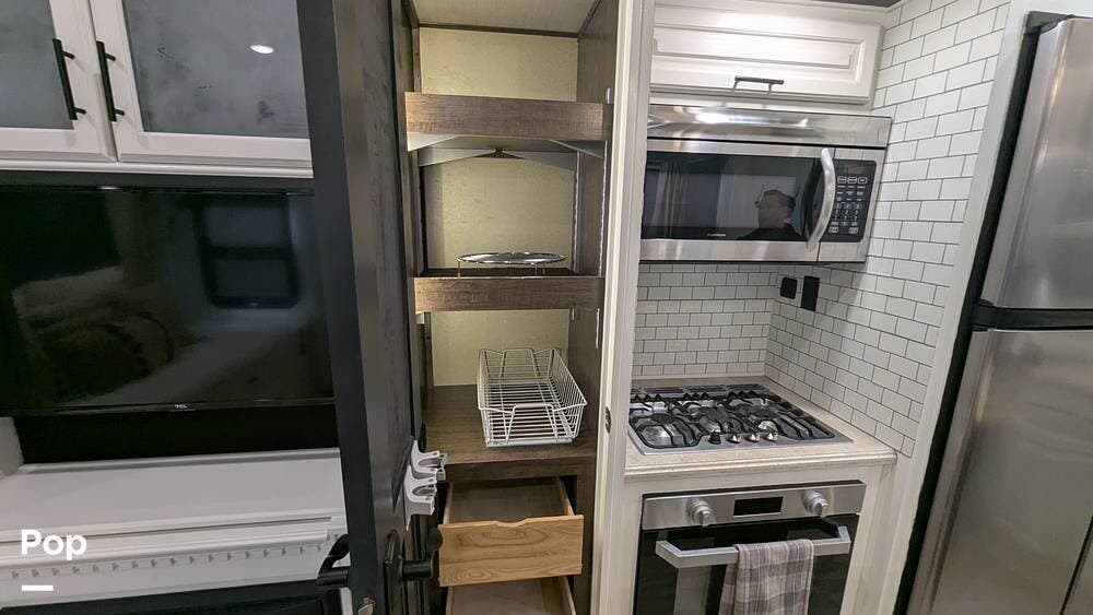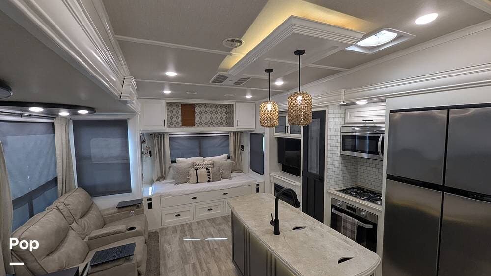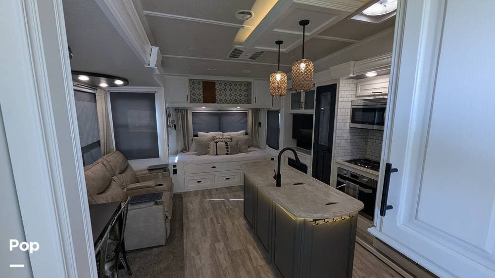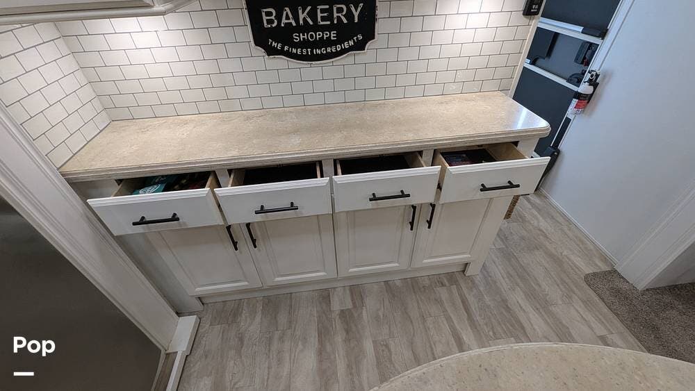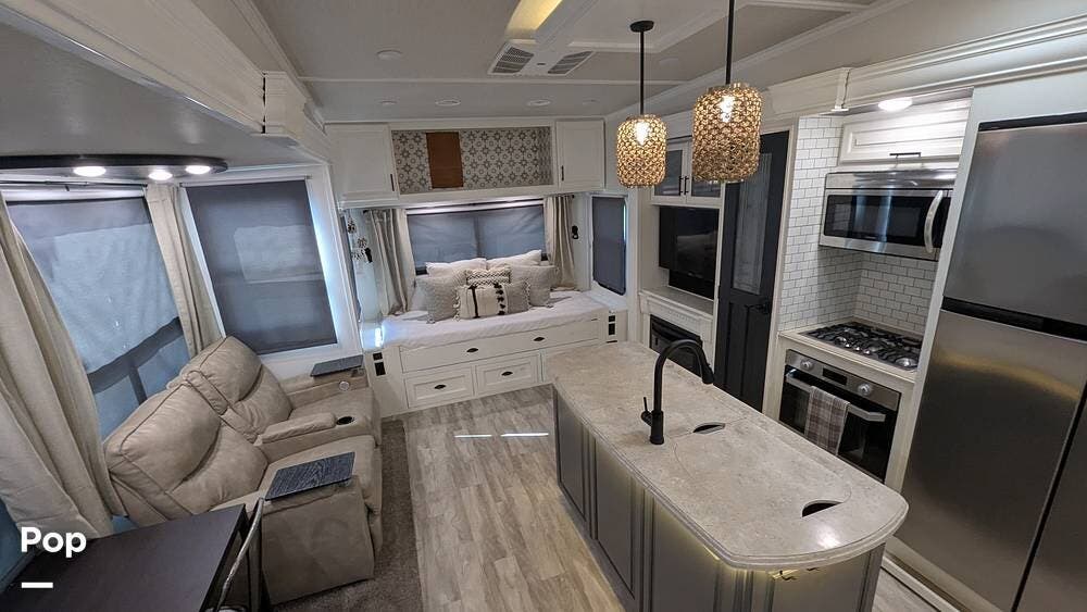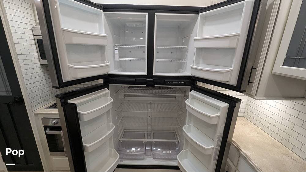 The kitchen features a full-sized residential refrigerator-freezer, gas stove, oven, and convection/microwave to make meal prep a breeze. The kitchen island has abundant counter space and a double sink. The kitchen also features a large pantry, storage cabinets, and a nice dining area.