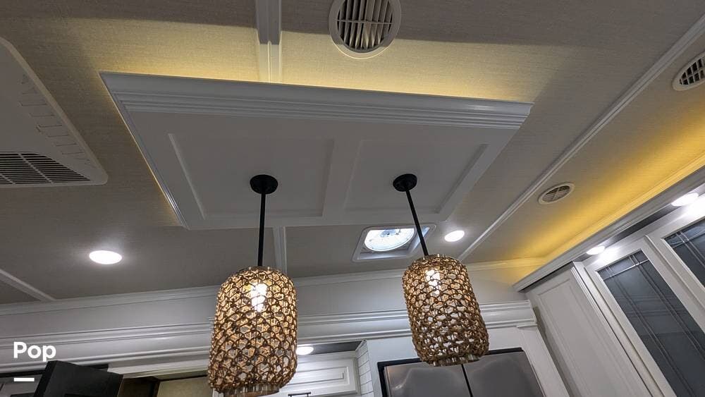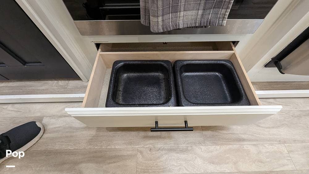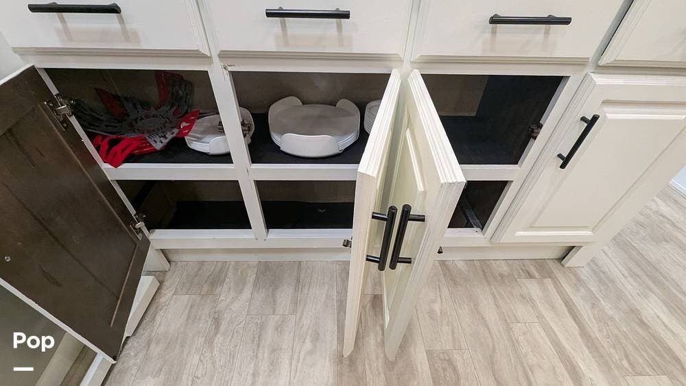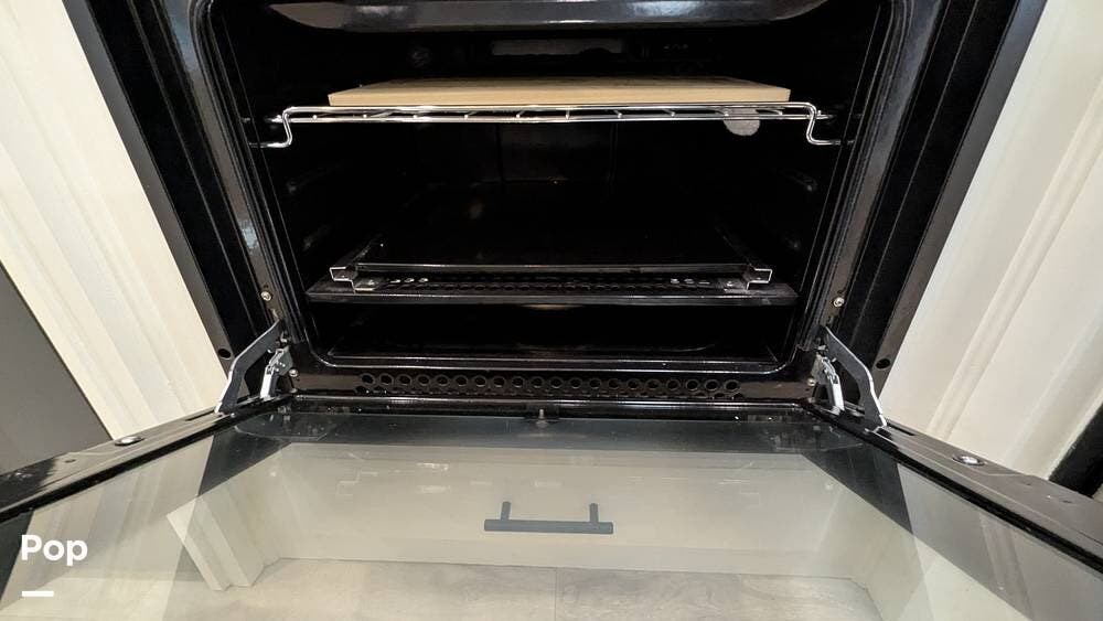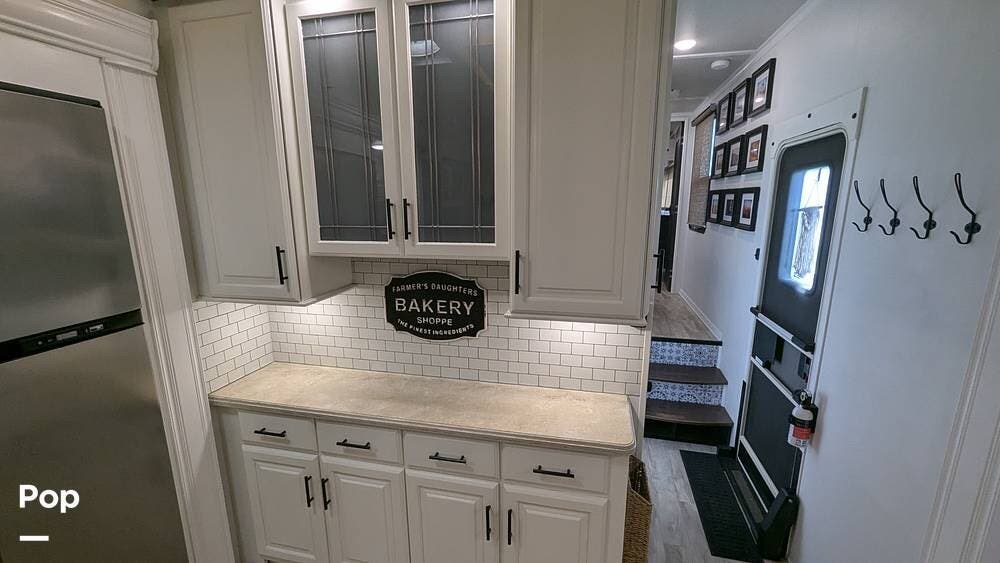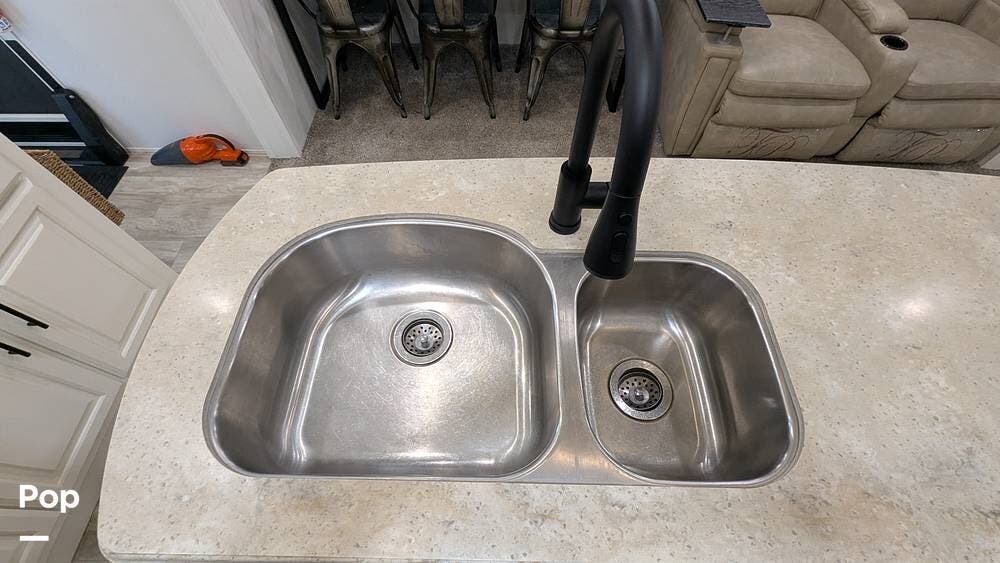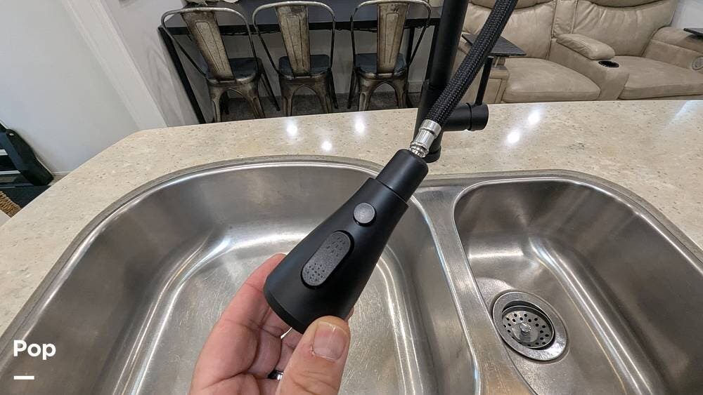 The kitchen features a full-sized residential refrigerator-freezer, gas stove, oven, and convection/microwave to make meal prep a breeze. The kitchen island has abundant counter space and a double sink. The kitchen also features a large pantry, storage cabinets, and a nice dining area.