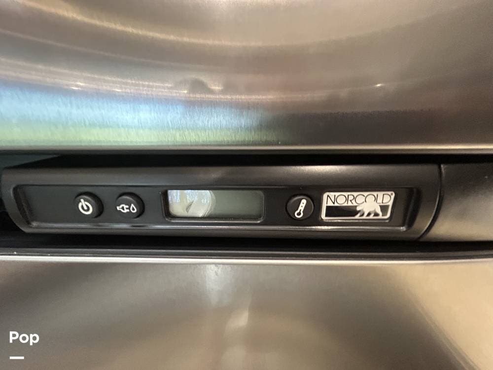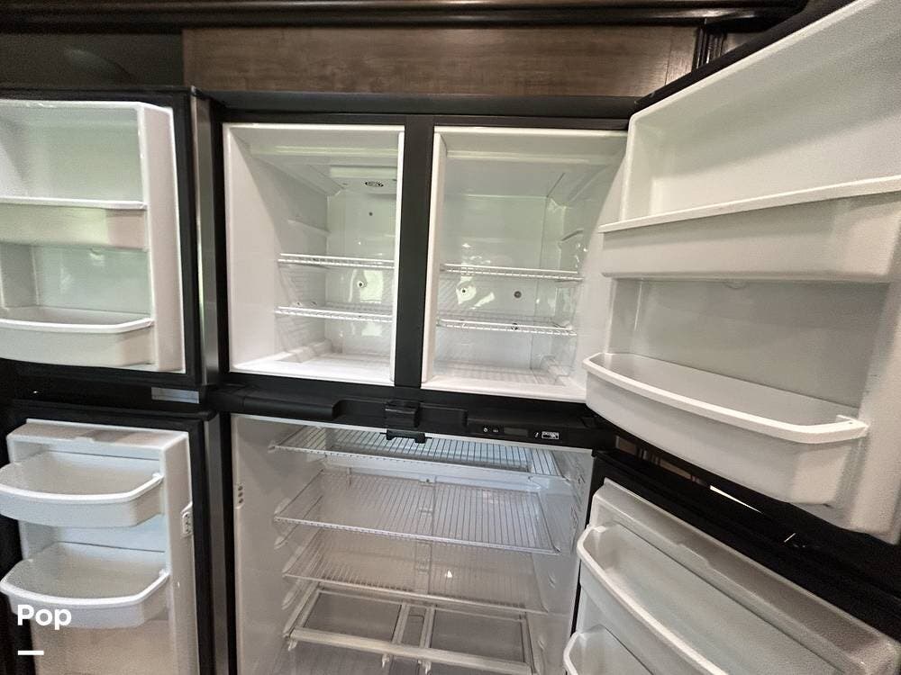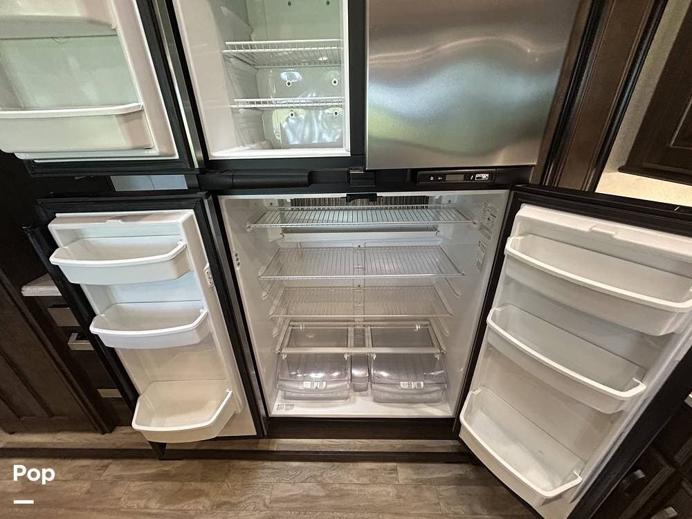 The kitchen features a stainless-steel refrigerator and freezer that is electric and propane, a large pantry, a stove and oven, and a double sink in the island--perfect for preparing meals on the road.