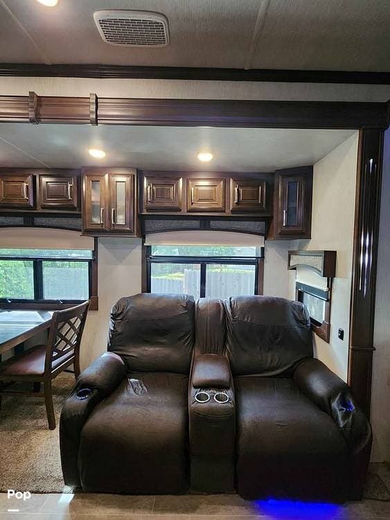 At the rear of the unit, the living area features opposing slide-outs, creating an open and inviting space. It's furnished with a sleeper sofa at the rear and theater-style recliners positioned across from the entertainment center. The entertainment setup includes a large flat-screen TV and an electric fireplace below, offering both ambiance and supplemental heat.