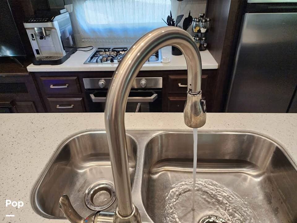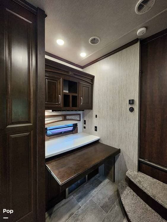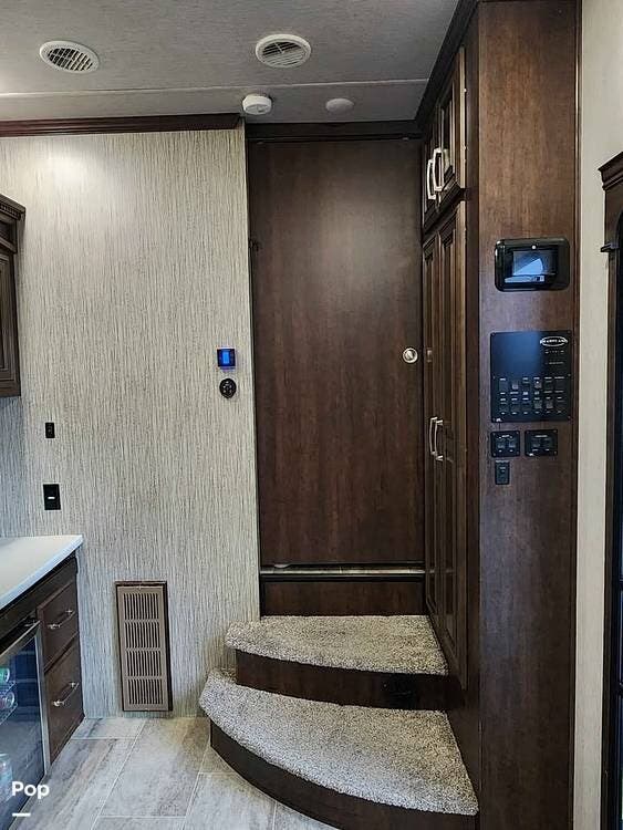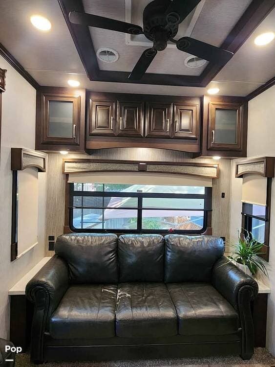 The fifth wheel features dual 15,000 BTU air conditioners for climate control and a 42,000 BTU furnace, ensuring a comfortable interior in any season. Exterior features include a large power awning with LED lighting, an oversized pass-through storage compartment, and a six-point hydraulic automatic leveling system.