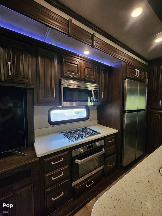 The central kitchen is equipped with a three-burner gas cooktop, a built-in oven, a microwave, a kitchen island with a double-basin sink, and solid surface countertops. A residential-style refrigerator provides ample cold storage, and there's plenty of overhead cabinetry and pantry space throughout for dry goods and cookware. Across from the kitchen is a freestanding dinette with chairs that offer flexibility for mealtime or workspace use.