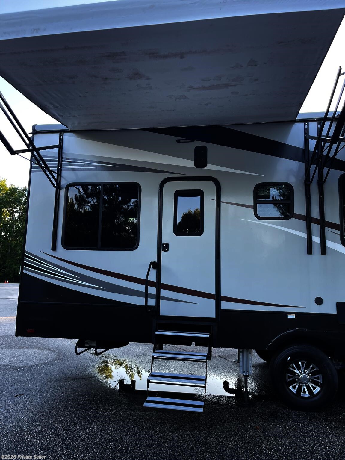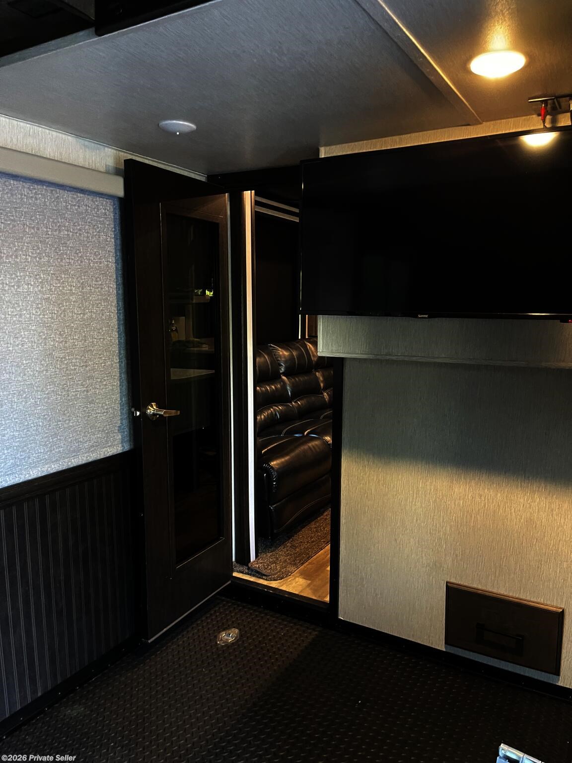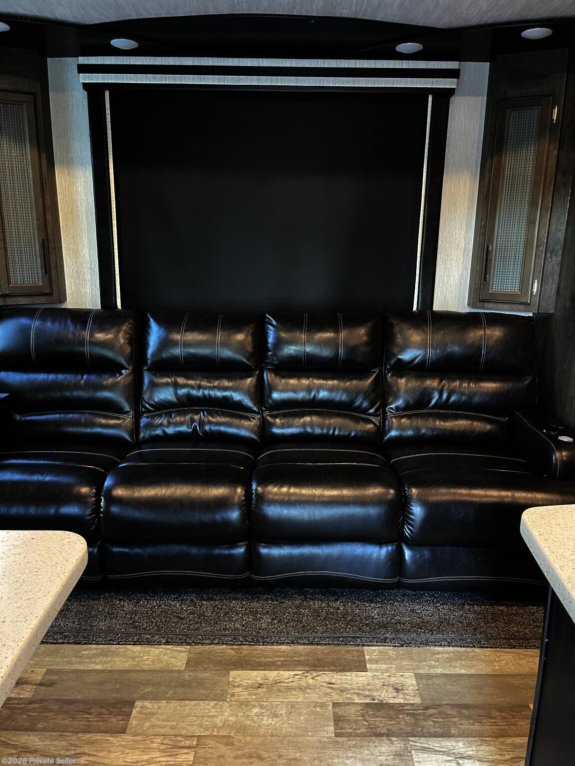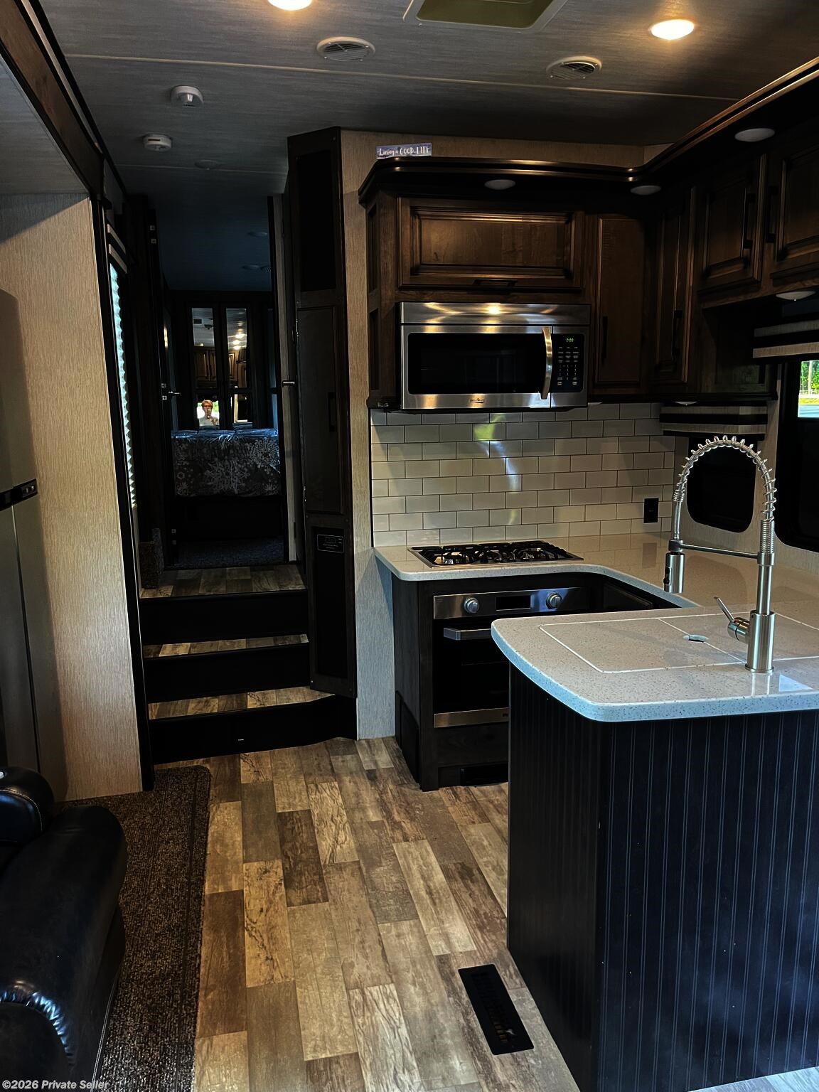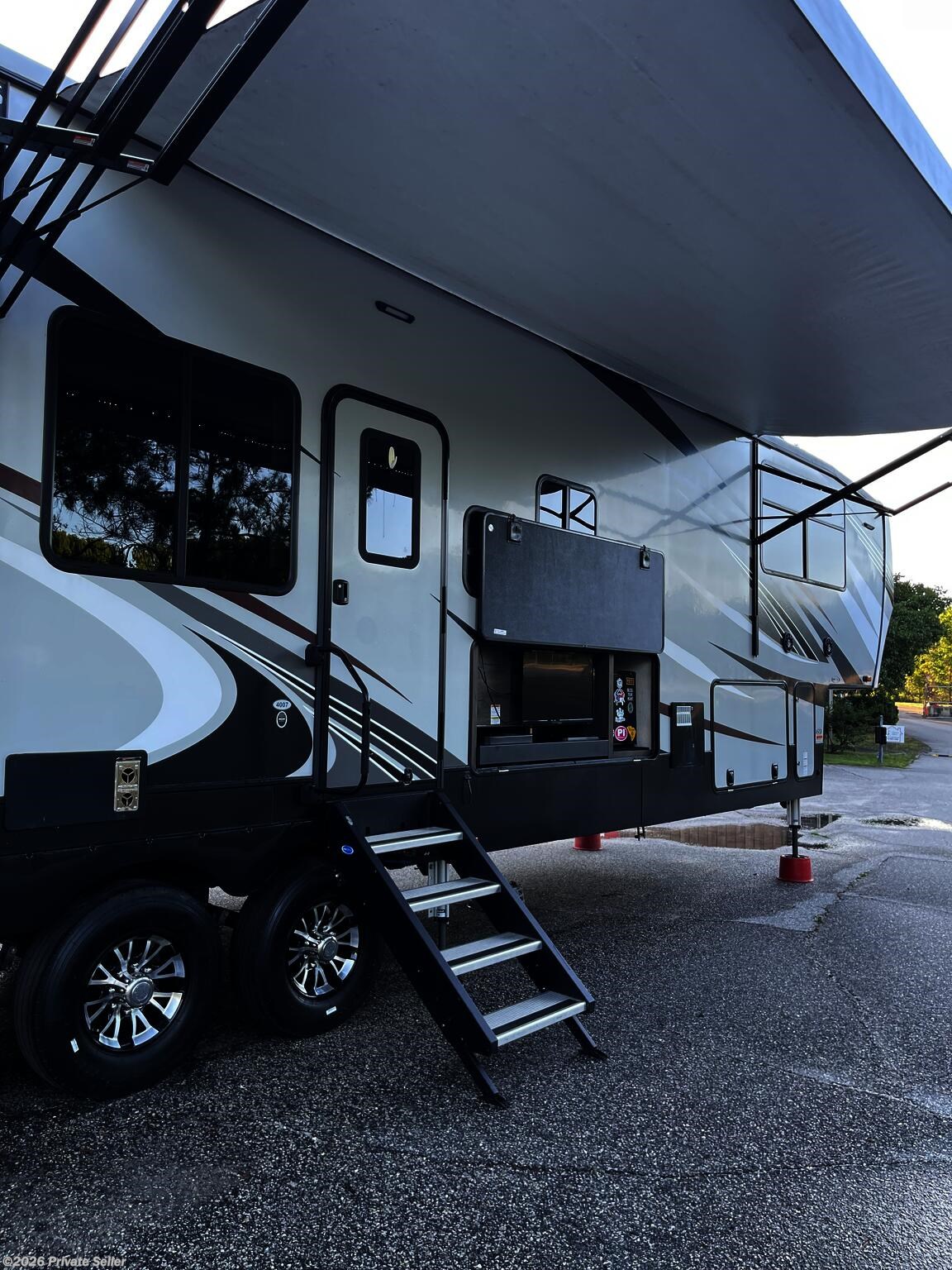 Luxury toy hauler fifth wheel in excellent shape. Kitchen has lots of cabinet space and all applicances clean and in working order. Den area has couch that reclines on each end and large tv. Bose sound bar that connects to outdoor speakers. Bedroom has 2 slides which makes it roomy with queen size bed and electric fireplace. Blackout shades and 3 ac units keep rig nice and cool on hot days. Washer/dryer hookups located in the closet. Toy hauler is 13 feet and has 1/2 bath, mounted tv, and has a bed and bench seating that is on hydraulic lift. Small loft area with a bed also in garage. Patio off back of garage with awning. 2 awnings on side and outdoor kitchen with mini fridge. Storage compartment for large propane tank. Gas powered generator