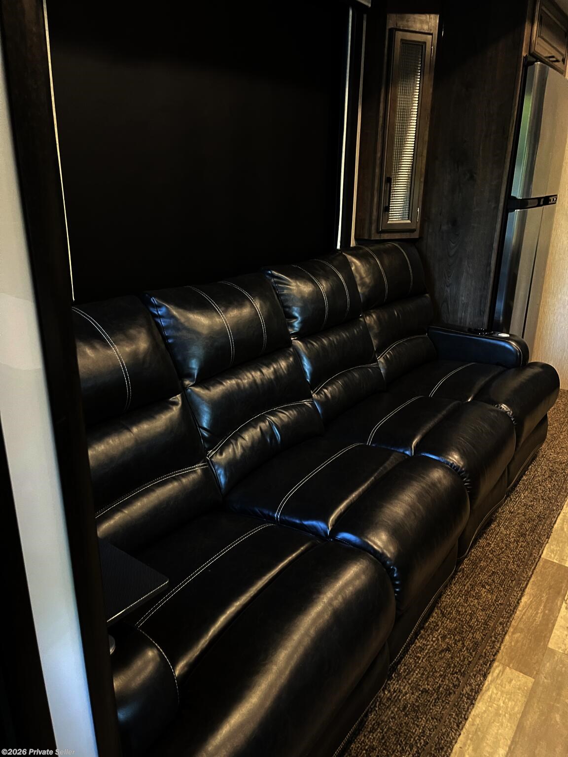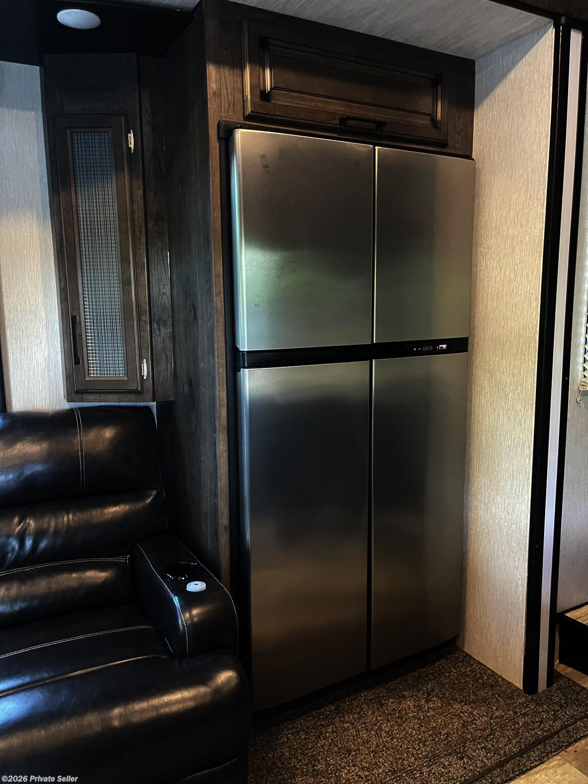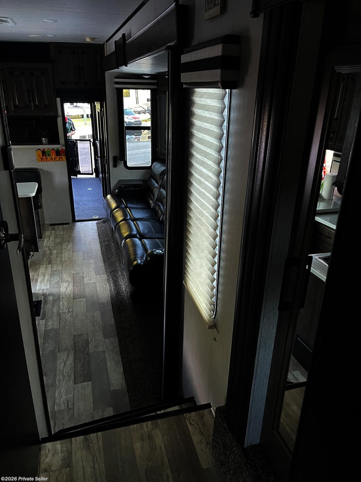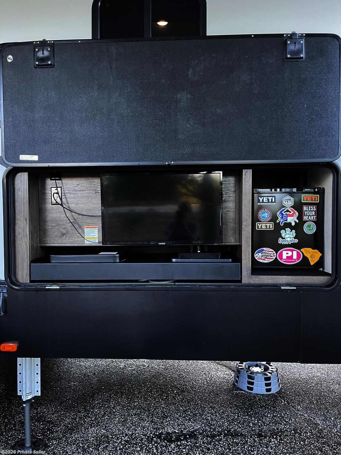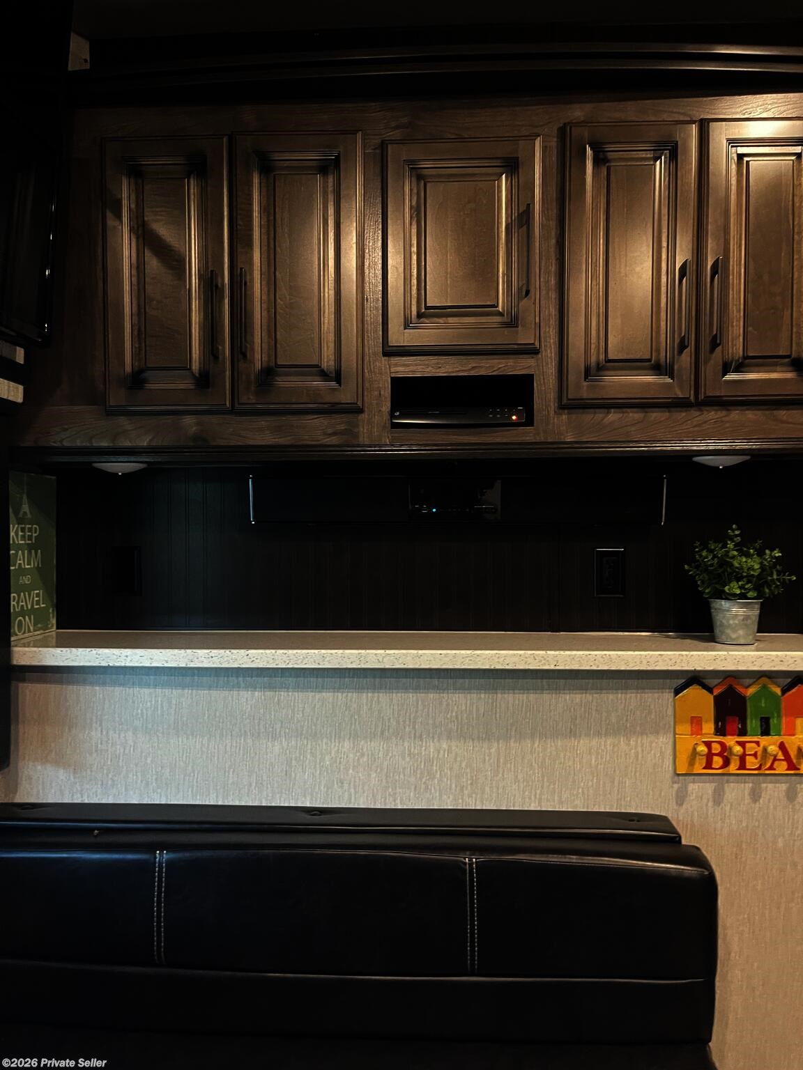 Luxury toy hauler fifth wheel in excellent shape. Kitchen has lots of cabinet space and all applicances clean and in working order. Den area has couch that reclines on each end and large tv. Bose sound bar that connects to outdoor speakers. Bedroom has 2 slides which makes it roomy with queen size bed and electric fireplace. Blackout shades and 3 ac units keep rig nice and cool on hot days. Washer/dryer hookups located in the closet. Toy hauler is 13 feet and has 1/2 bath, mounted tv, and has a bed and bench seating that is on hydraulic lift. Small loft area with a bed also in garage. Patio off back of garage with awning. 2 awnings on side and outdoor kitchen with mini fridge. Storage compartment for large propane tank. Gas powered generator